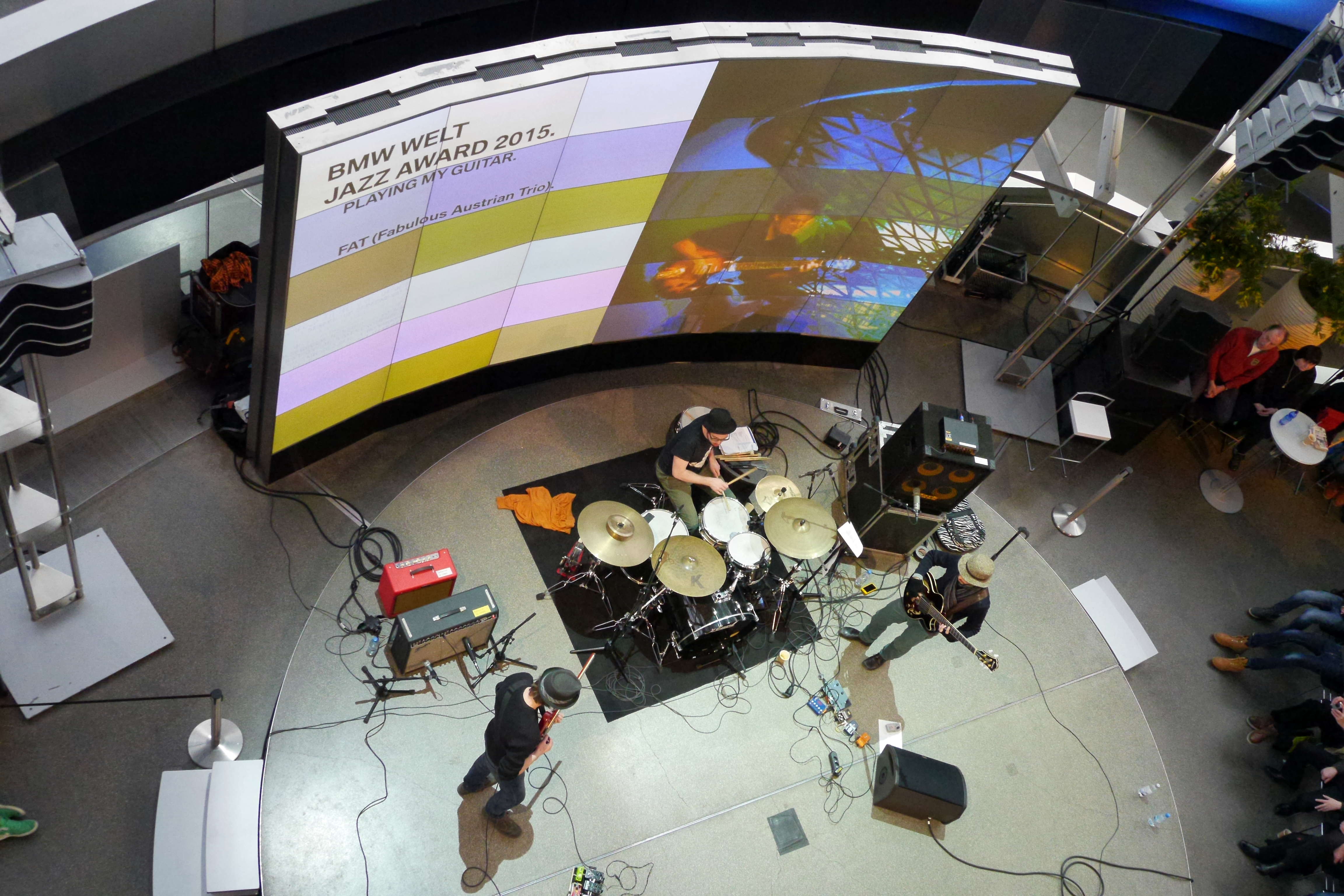 Den Auftakt des 7. BMW Welt Jazz Awards gestaltete vor zwei Wochen das Michel Sajrawy Trio mit arabeskem Gitarrenjazz, der den Orient in die futuristische Kuppel des BMW Welt-Doppelkegels brachte. Konzert Nummer zwei bestritt das österreichische Trio FAT des in Los Angeles lebenden Wiener Gitarristen Alex Machacek. FAT heißt ausgeschrieben Faboulous Austrian Trio und der Name ist Programm: Gitarrist Alex Machacek, Bassist Raphael Preuschl und Schlagzeuger Herbert Pirker erzeugen zu dritt sagenhafte Klanggebilde, die in ihrer Wucht an eine große Formation denken lassen und deren Komplexität von Altmeistern wie Allan Holdsworth oder Frank Zappa inspiriert wurden. Thomas J. Krebs war dabei und dokumentierte das Konzert für www.jazzzeitung.de.