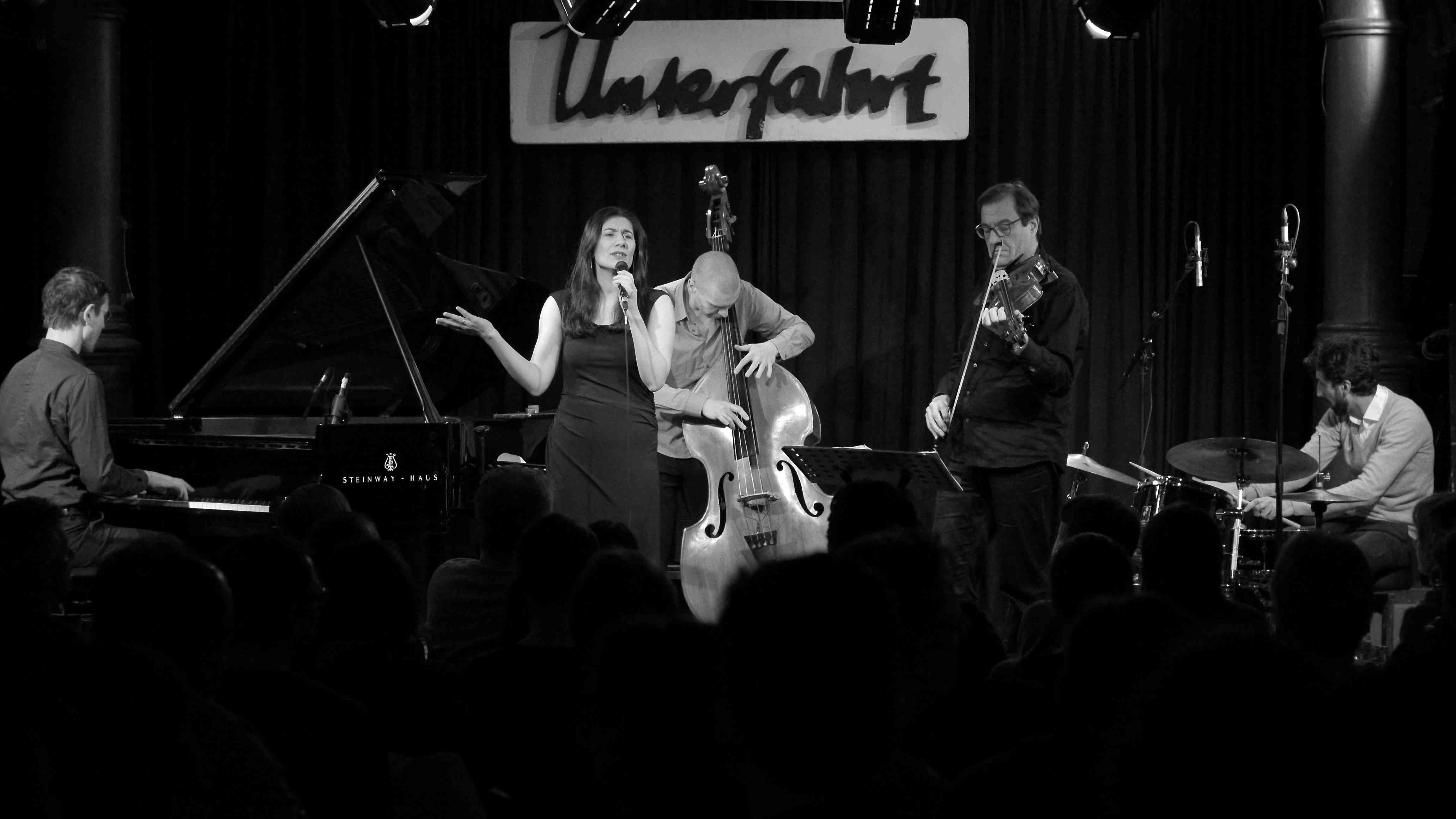 Von Thomas J. Krebs – Vollbesetztes Haus am Samstagabend in der Münchner Unterfahrt: „Orient trifft Okzident“! Cymin Samawatie präsentierte dort mit ihrer Gruppe Cyminolgoy die gerade auf ECM erschiene CD „Phoenix“. Eine kontinuierliche Weiterentwicklung der Kombination persischer Lyrik mit kammermusikalischen, zeitgenössischen, jazzigen Klängen, diesmal erweitert um eine wunderbare Klangfarbe mit Martin Stegner an der Viola. Cymin Samawatie entließ das Publikum, verzaubert vom Klang ihrer Stimme und ihrer Band, nach einem grandiosen Abend und berührenden Momenten wieder ins winterliche Münchner Wochenende. Alle Fotos: Thomas J. Krebs