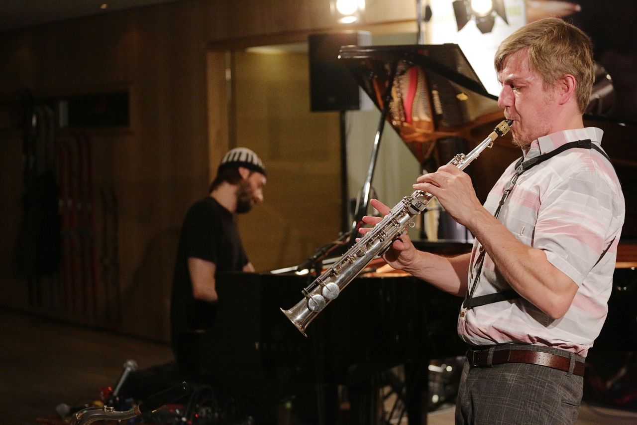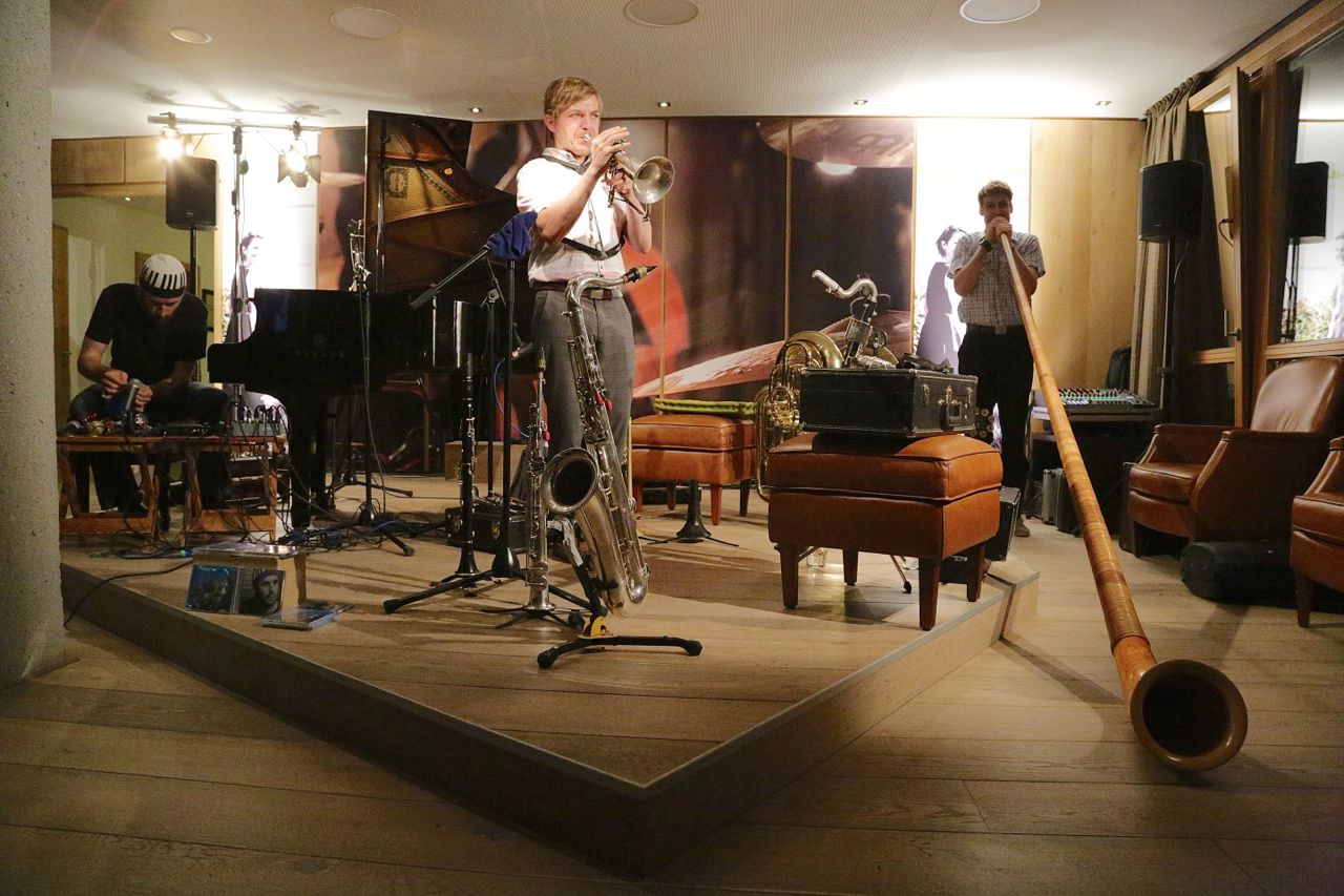 Text und Fotos von Ralf Dombrowski – Ab der siebten Oktave wird die Obertonreihe chromatisch. Gut zu wissen für Blasinstrumente ohne Ventile, aber kaum zu spielen, vor allem, wenn es sich bei dem Teil um ein Alphorn handelt. Tatsächlich beherrschen nur wenige Musiker weltweit überhaupt das chromatische Agieren am Alphorn, und zwei davon gaben sich am Wochenende am Achensee im Kronthaler beim Alpenjazz Festival die Klinke in die Hand. Der eine heißt Johannes Bär und war als Teil des Trios Random/Control des österreichischen Pianisten David Helbock zu Gast. So wortkarg er am Tresen sich an der Konversation beteiligte, so eloquent war er auf der Bühne und erwies sich als ein Souverän sämtlicher Brass-Instrumente, dessen Kosmos sowohl die Derivate der Volksmusik als auch die verschiedenen Stilexkurse von Thelonious Monk bis Hermeto Pascoal umfasste. So wie Bär nahmen auch seine Partner Helbock mit Klavier, Percussion und Electronics und Andi Broger mit diversen Klarinette und Saxofonen reichlich Instrumente zur Hand, um ihre wild strukturelle und ungemein virtuose Mischung der Einflusslinien kreativ zu entfalten.