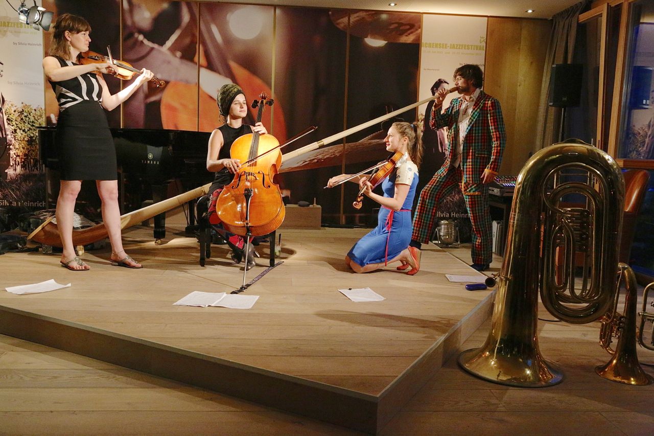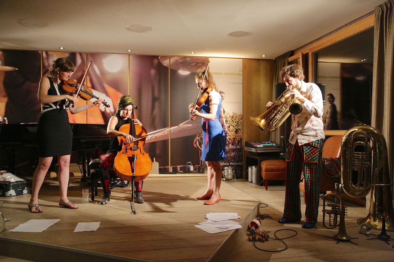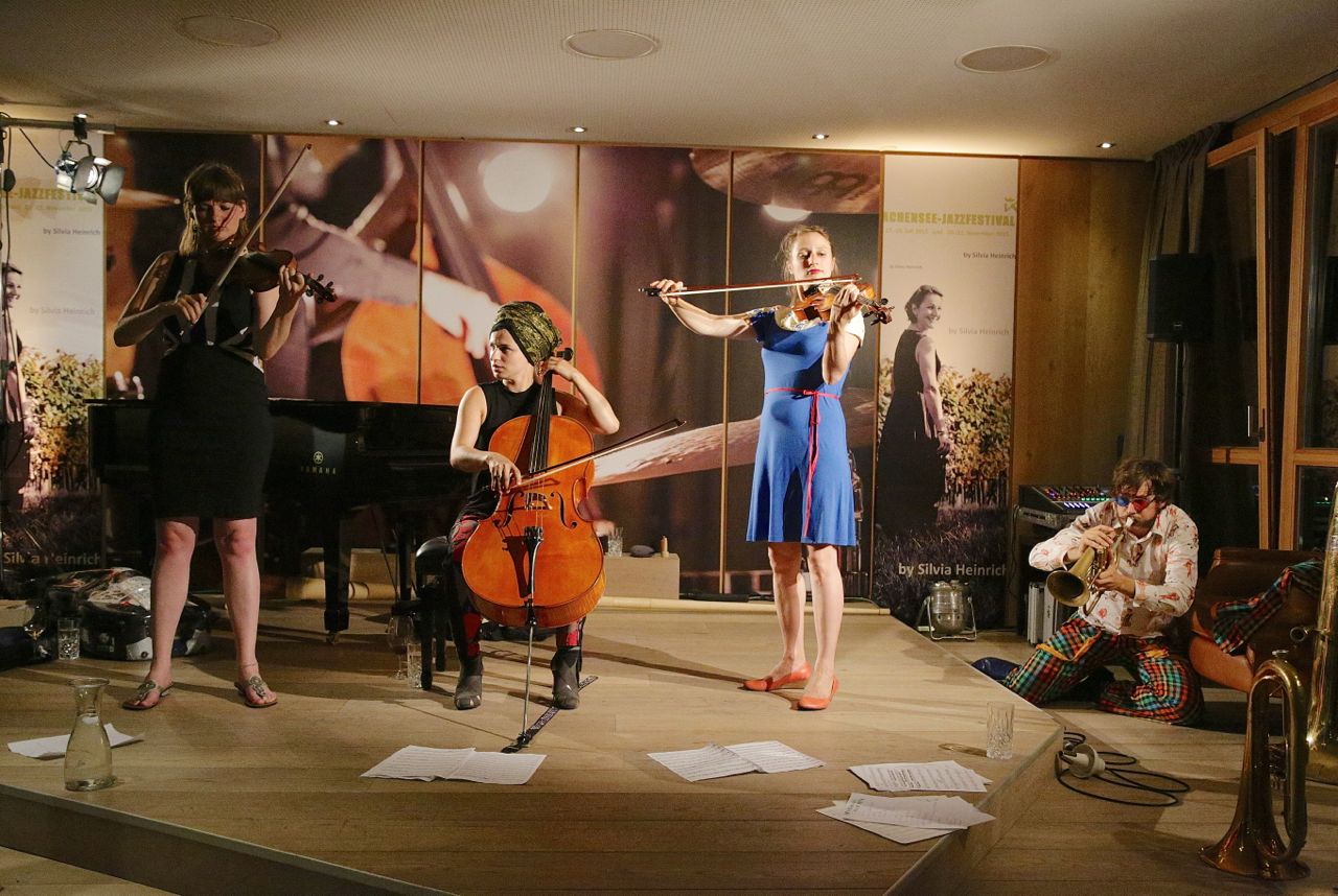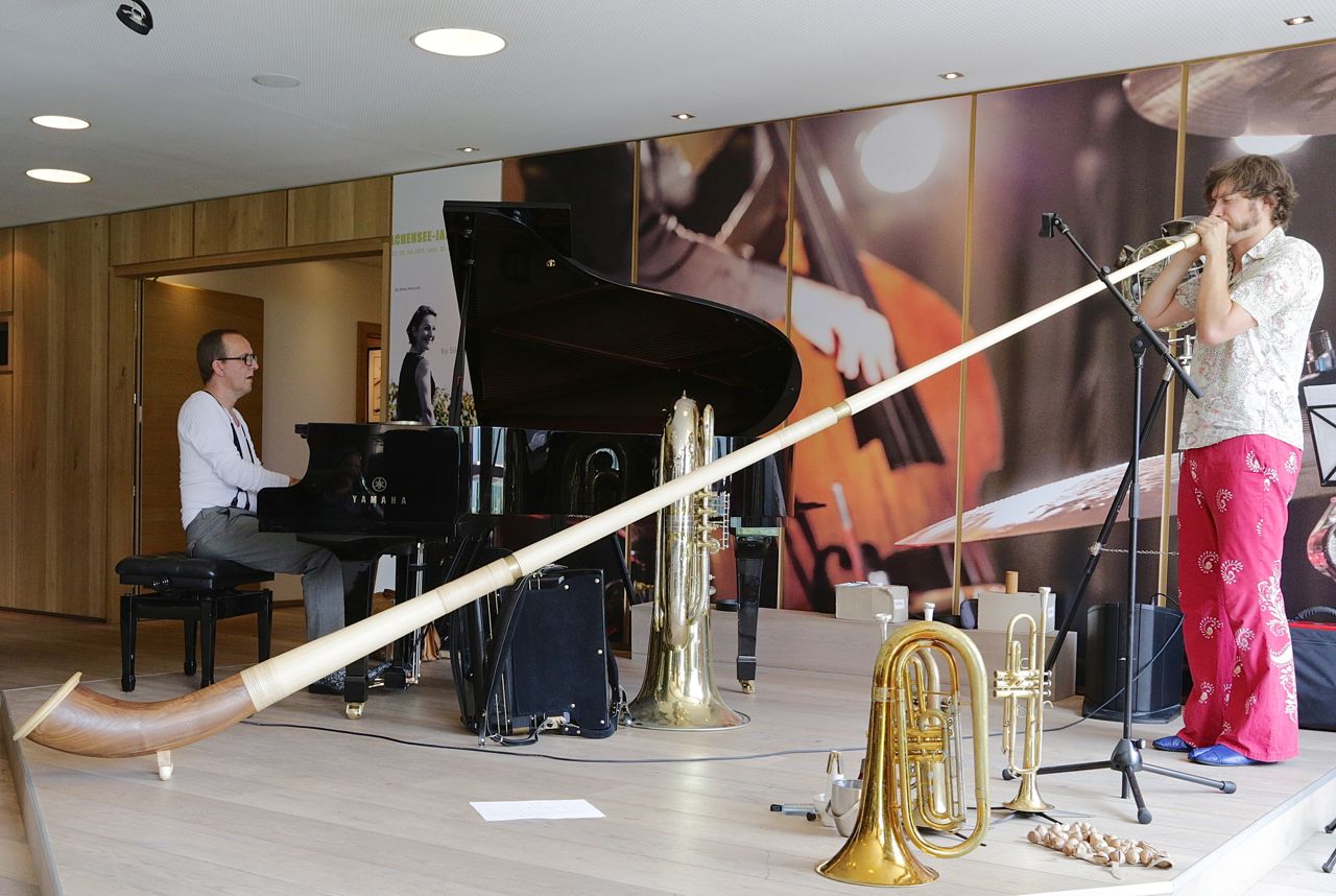 Der zweite Brass Gigant hieß Matthias Schriefl. Er griff von der Königstuba bis zum Alphorn zu diversen Varianten der Instrumentenfamilie und empfahl sich in zwei Projekten darüber hinaus auch als inspirierter Improvisator und sperriger Humorist aus dem Geiste des Musikantischen. Ein Konzert brachte ihn mit dem Streichtrio Netmakisum aus der Steiermark zusammen, drei Musikerinnen mit ähnlichem Spaß an der Relativierung von gestalterischen Gewohnheiten, wie er ihn selbst hatte. Das andere war eine Premiere der Zusammenarbeit mit dem Tiroler Pianisten Christian Wegscheider, dessen pointiert reduzierte Spielweise sich gut mit den Linien der Blasinstrumente ergänzte. In beiden Fällen war die Musik hedonistisch hybrid, eine rasante Mixtur von Einflüssen aus diversen Sphären. Wer bislang zweifelte, dass es so etwas wie Alpenjazz gebe, der konnte am Achensee sich eines Neuen belehren lassen.