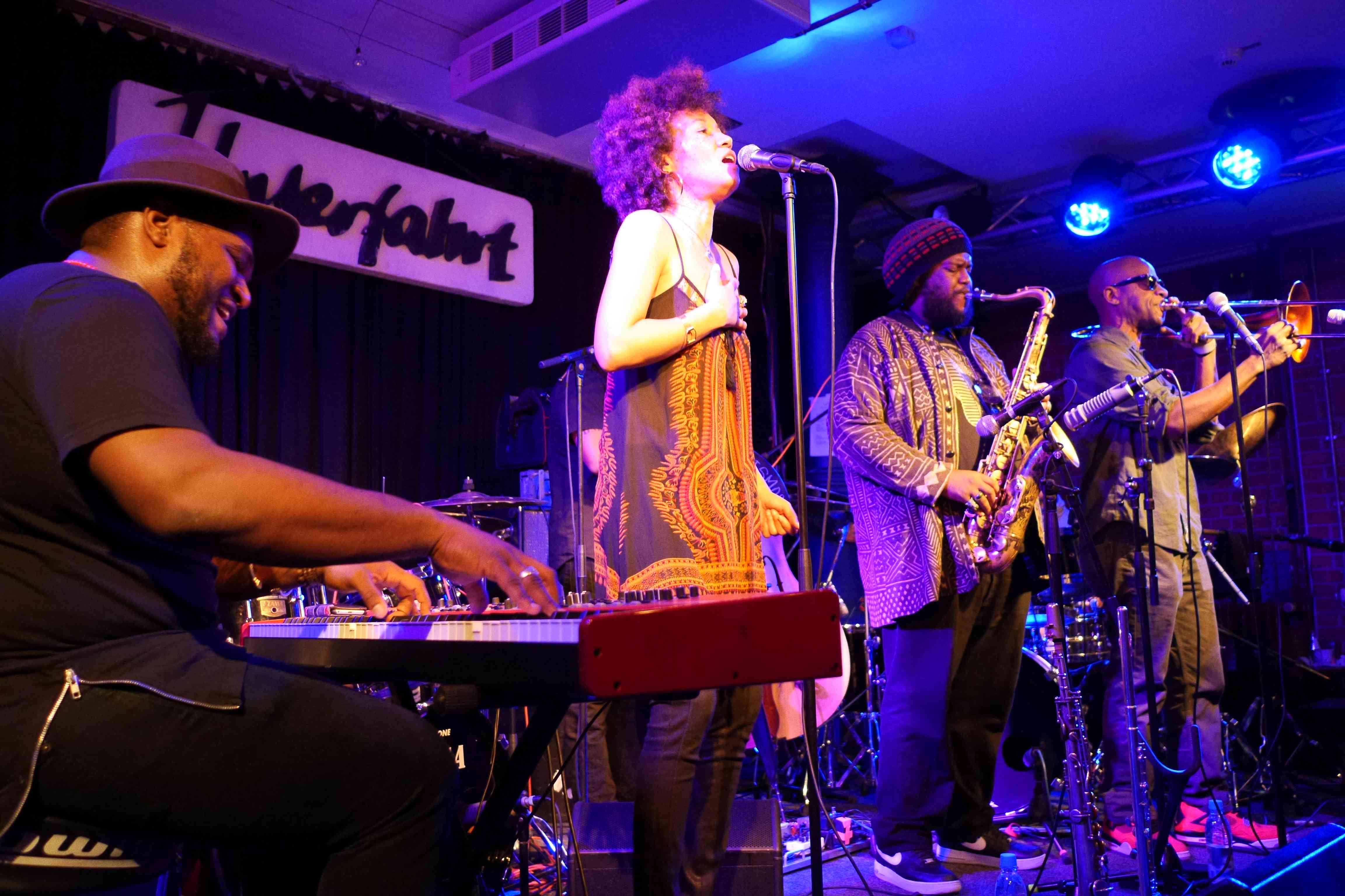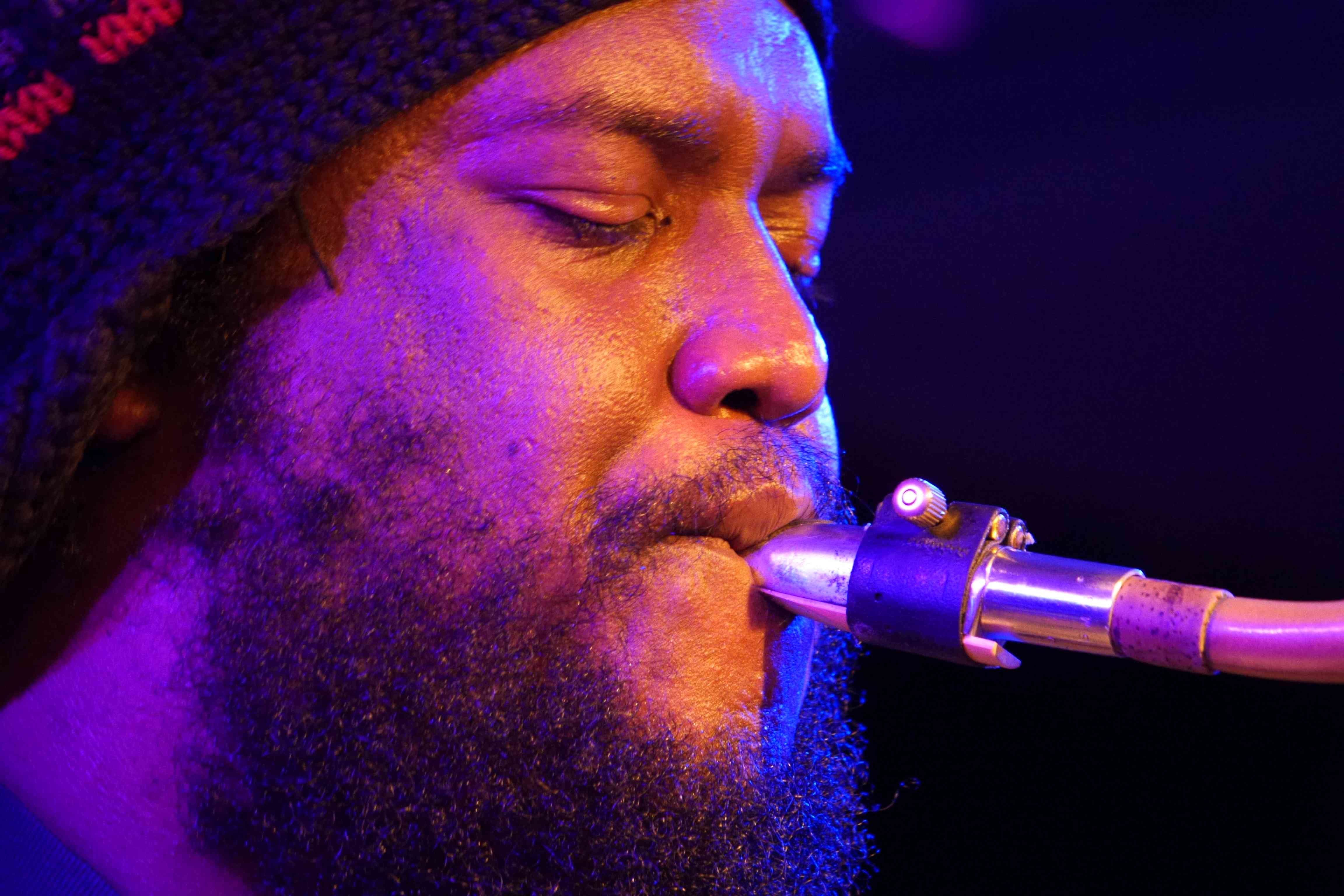Als Kamasi Washington den Vertrag für sein Konzert in der Unterfahrt unterschrieb, war noch nicht klar, dass er so berühmt sein würde. Wenig später jedoch nahm der Hype seinen Lauf und so quollen die Reservierungslisten derart über, dass er gleich zweimal hintereinander spielen musste, zwei Konzerte auf unterschiedlichem Niveau der künstlerischen Energie. Denn die erste Runde um sechs war zwar konzentriert, aber im Vergleich zum Konzert um neun Uhr doch deutlich gedämpfter. Ein wenig erholt von den Strapazen einer eng getackteten Europatournee, drehte die Band schließlich auf und präsentierte eine unterhaltsame, stellenweise zu sich hypnotisch steigernden Kollektivmomenten verdichtete Musik, die deutliche Wurzeln im Soul Jazz der Sechziger hatte.