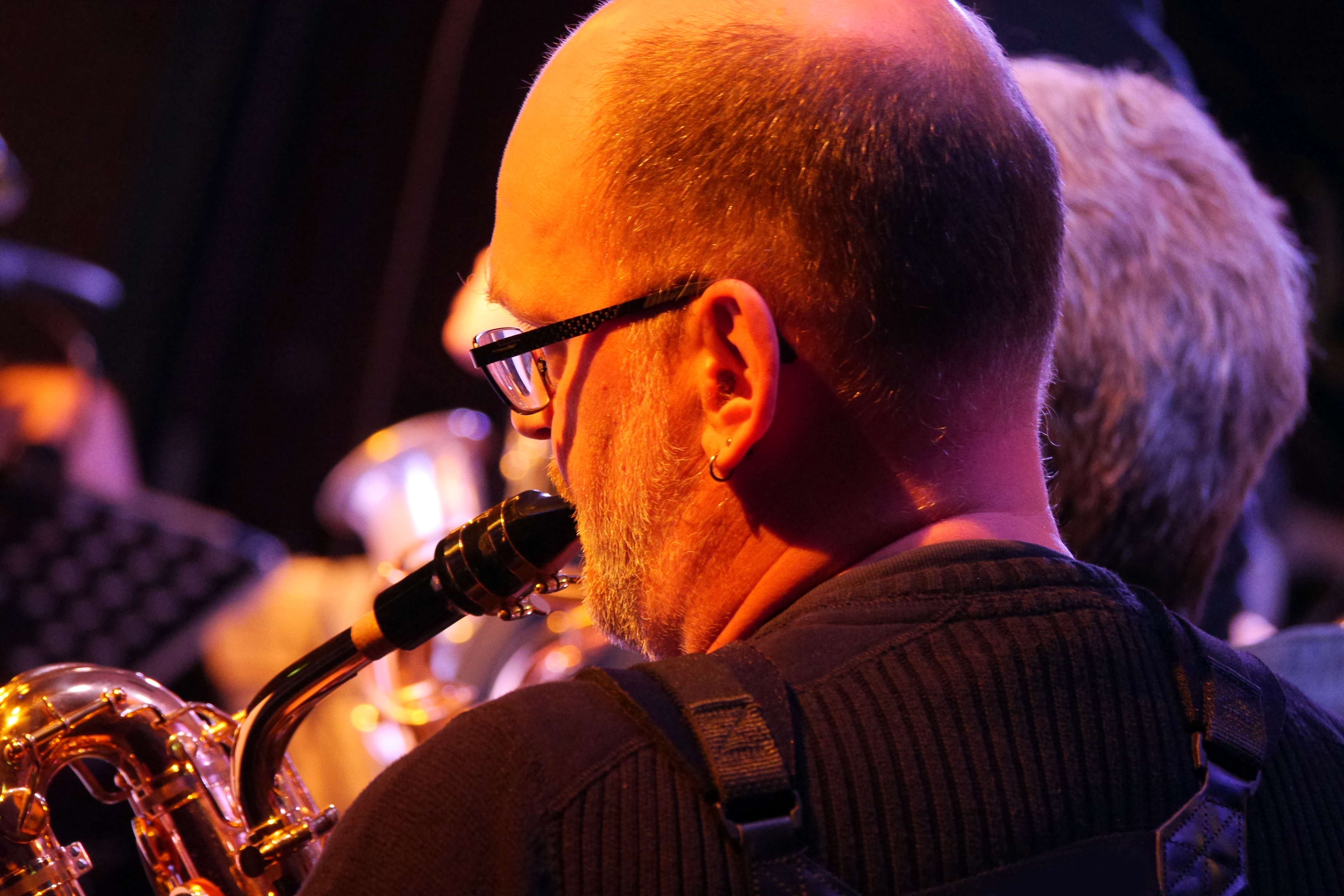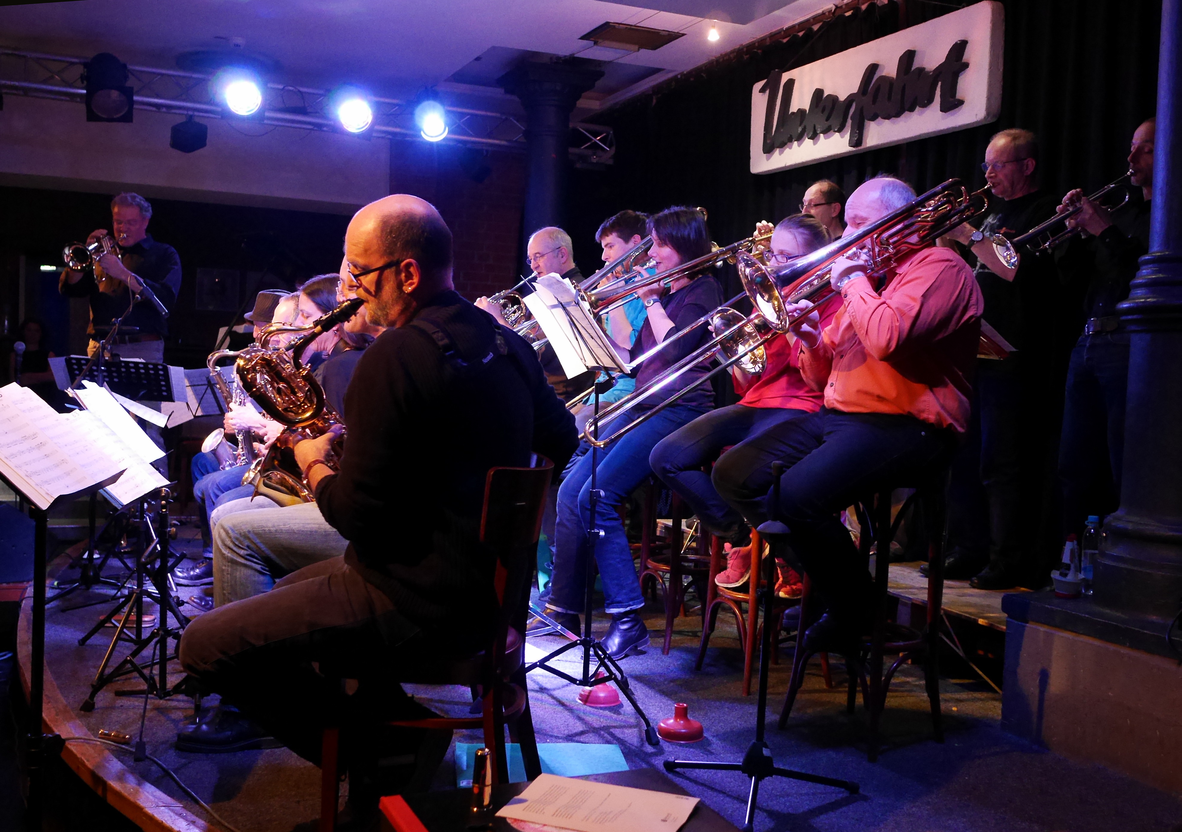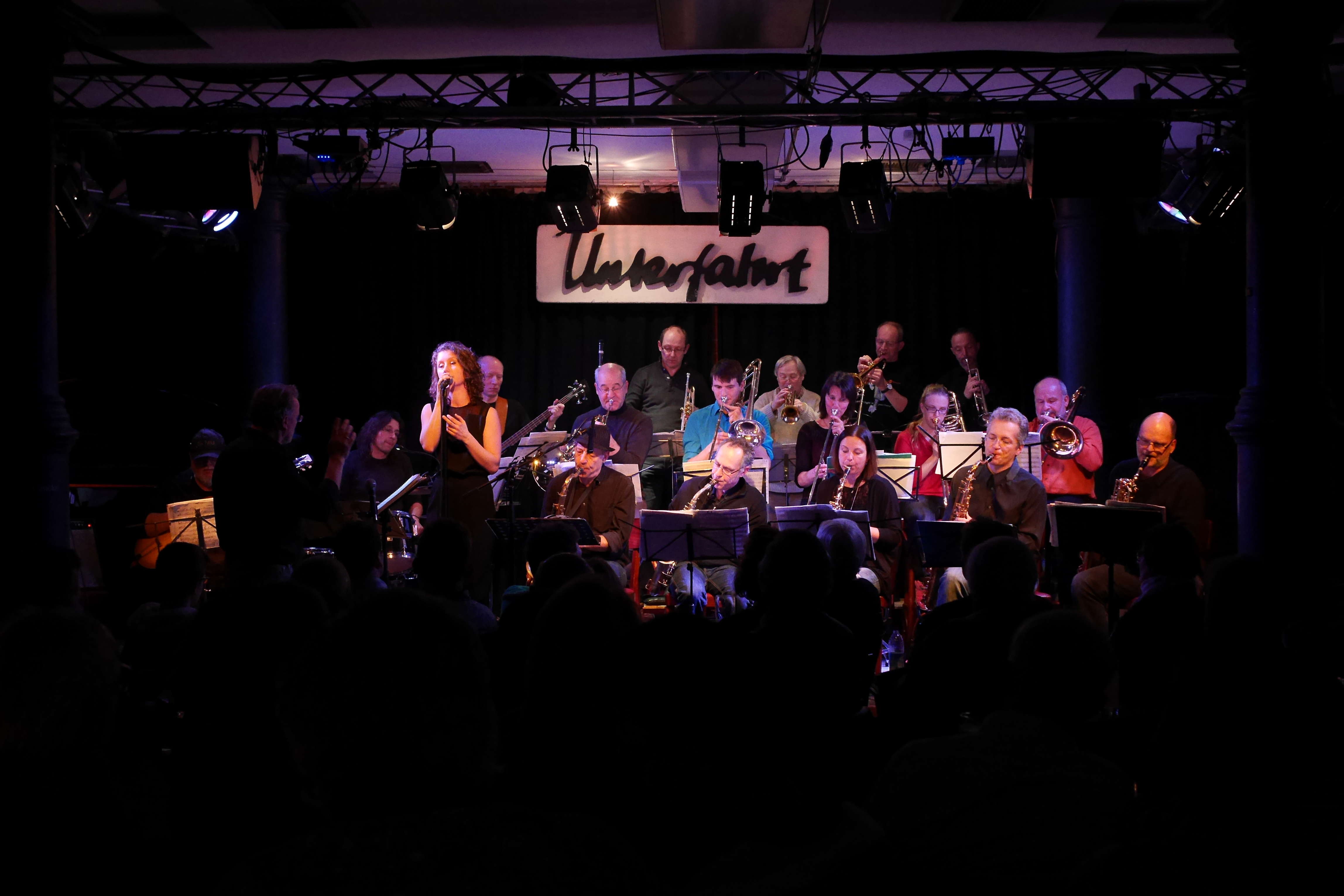 Montag ist Big Band Tag in der Unterfahrt. Und ungefähr alle zwei Jahre tritt in diesem Rahmen dort auch die seit mittlerweile zwölf Jahren bestehende Original Triad Big Band unter Leitung des Trompeters Heinz Dauhrer auf. So auch am vergangenen Montag. Das Besondere an gerade dieser Big Band ist, dass sie sich aus Lehrern und Freunden des Kulturvereins 3klang e.V. sowie Musikern der Münchner Jazz-Szene zusammensetzt. So bleibt das Ganze spannend und relaxt, denn man will musizieren und einfach Spaß dabei haben, genau so wie die Lehrer auch ihre Schüler im 3klang unterrichten. Ob Kompositionen von Duke Ellington, Louis Armstrong, Glenn Miller, Earth Wind & Fire, Filmmusiken oder Big Band Klassiker, Repertoire wie Arrangements sind mit den Jahren gewachsen und erwachsen geworden. Auf einem derart konstanten Niveau, dass die Big Band demnächst Duke Ellingtons Sacred Concert (!) aufführen wird (dick im Kalender anmarkern und hingehen: Samstag, 05.03.2016, 19:30h, Pfarrkirche St. Georg in Freising). Eine mehr als gelungene Kostprobe daraus bekamen die Fans in der Unterfahrt bereits vorab zu hören. Es war ein ungemein angenehmer, harmonischer Abend, der gute Laune machte und … Lust auf mehr. Thomas J. Krebs hat diesen Abend fotografisch festgehalten.