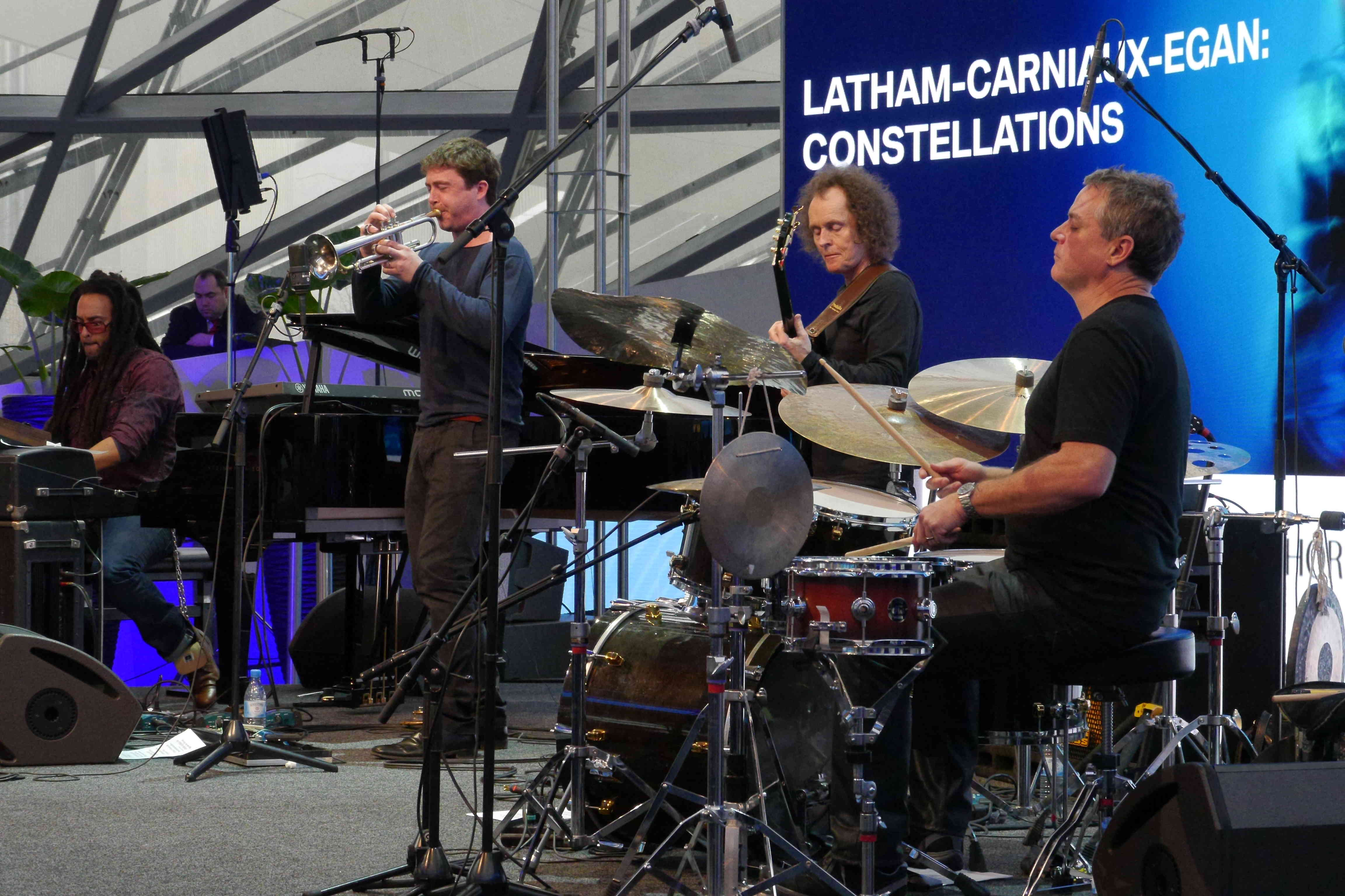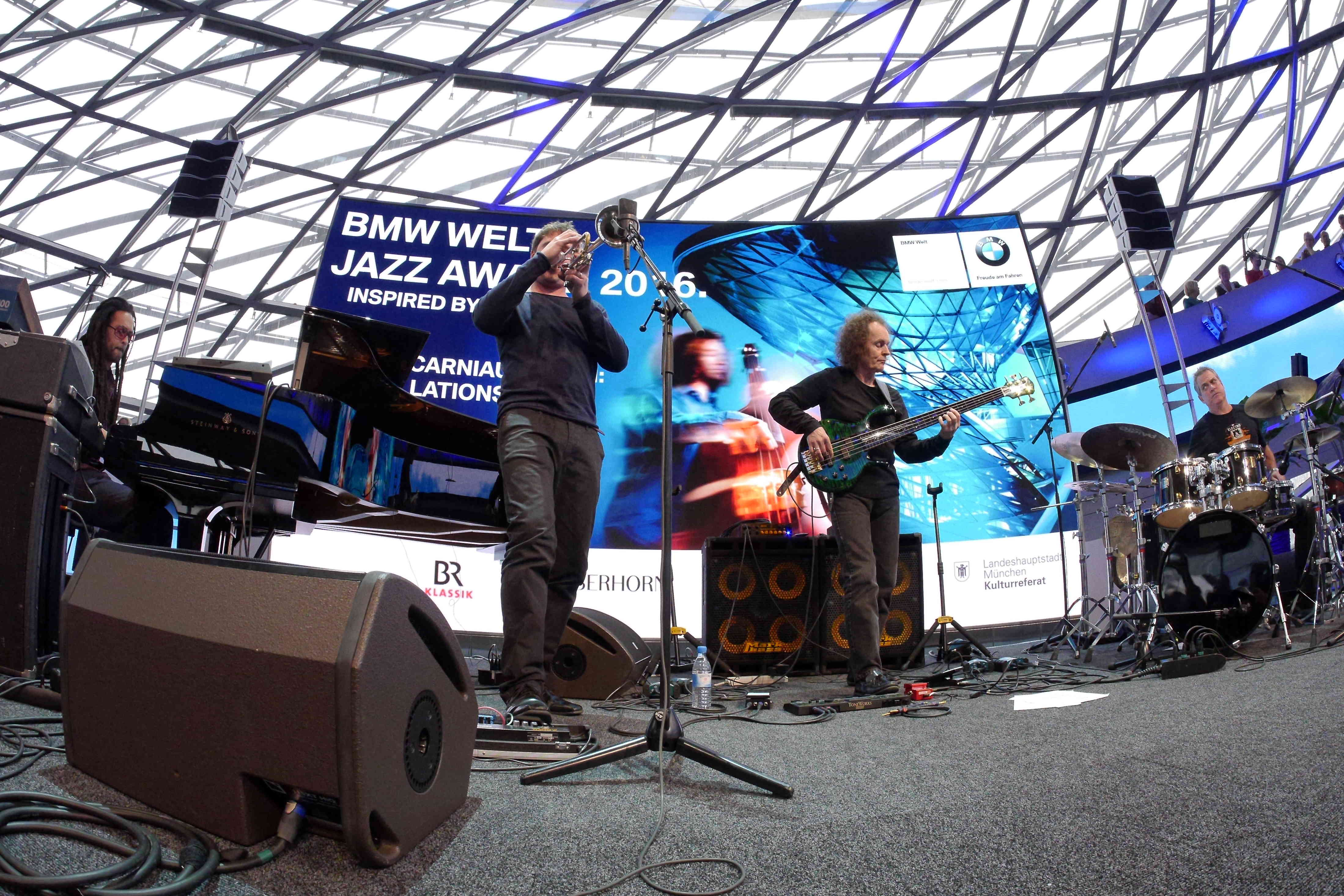 Die Inspirationsquelle war die Musik von Björk – das musikalische Ergebnis ist knalliger New Yorker Keller-Funk. Am vergangenen Sonntag stellte sich die fünfte Band der Competition des BMW Welt Jazz Award: Der Schlagzeuger Karl Latham war zusammen mit Bassist Mark Egan, Keyborder Nick Rolfe sowie Trompeter Ryan Carniaux angetreten. Nach einem etwas längeren Anlauf gelang es der Band im zweiten Set, das Publikum für sich zu gewinnen und zu Ovationen hinreißen zu lassen. Das Event hat für uns der Fotograf Thomas J. Krebs mit den Bildern dieser Galerie dokumentiert.