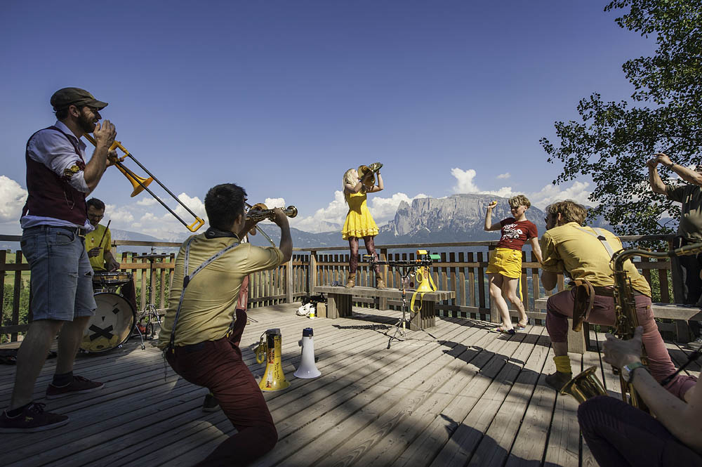 Das Südtirol Jazzfestival ist bekannt für seine besonderen, oftmals ungewöhnlichen Spielorte. Was erwartet uns 2016? Das Eröffnungskonzert verkörpert eine völlig neuartige Form der italo-österreichischen Kooperation. In einem Konzertsaal aus Apfelgroßkisten der Obstgenossenschaft Fruchthof Überetsch treffen die sentimentalen Serenatas Süditaliens auf den einzigartigen Charme des Wiener Lieds und natürlich auf modernen Jazz. „Kinzelbinders Melting Orchestra“ ist der Titel dieser Veranstaltung und symbolisiert die Vermischung der Kulturen, der Musik, die aus dem Herzen des Wiener Akustikduos „Die Strottern“ und der Seele des neapolitanischen Trios ASSURD kommt. Das Eröffnungskonzert ist gleichzeitig Vorgeschmack auf ein Konzert dieser Ensembles im Gebirge: das bereits zur Tradition gewordene Bergkonzert auf der Comici Hütte, am Fuße des Langkofels in 2154 Meter Höhe.