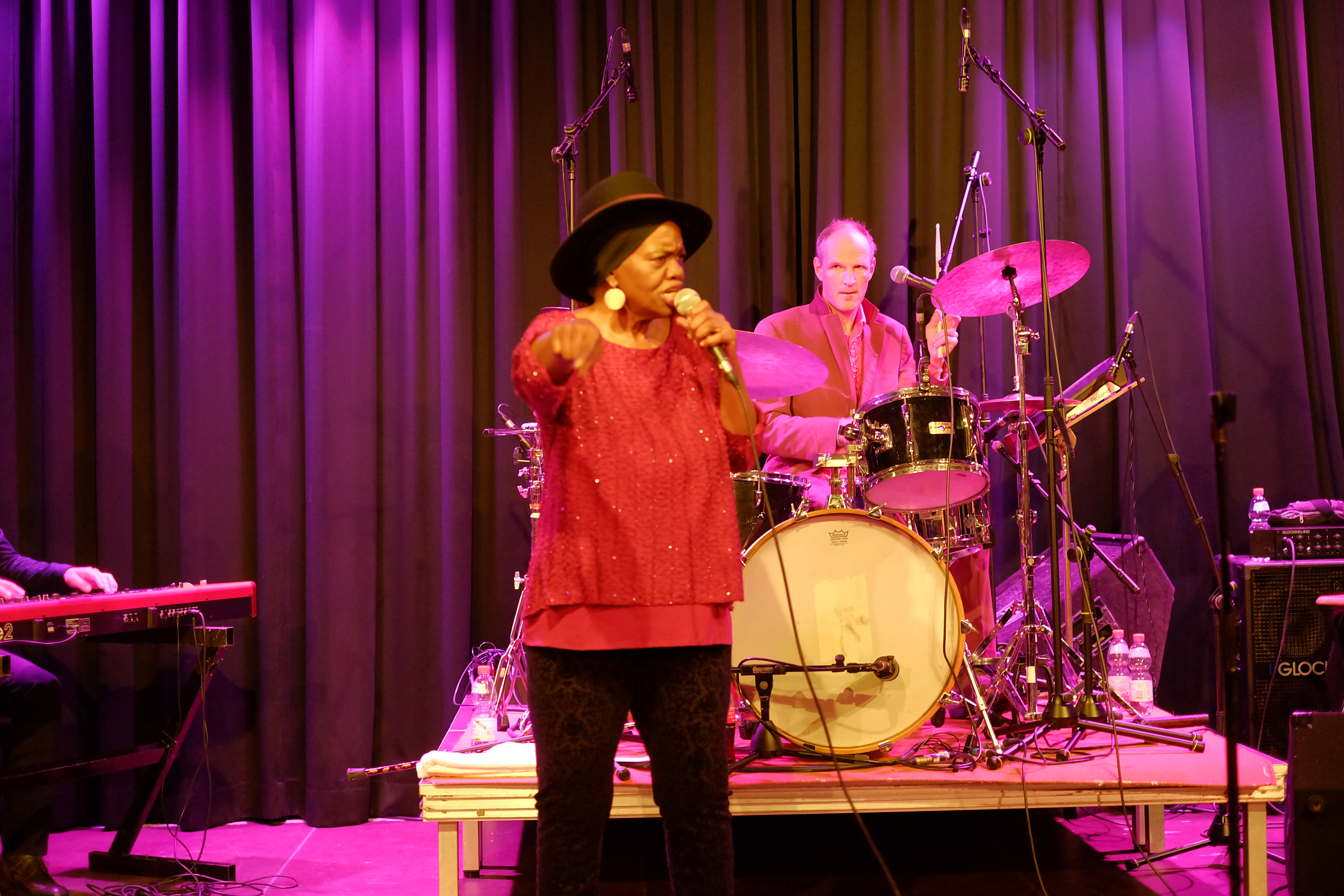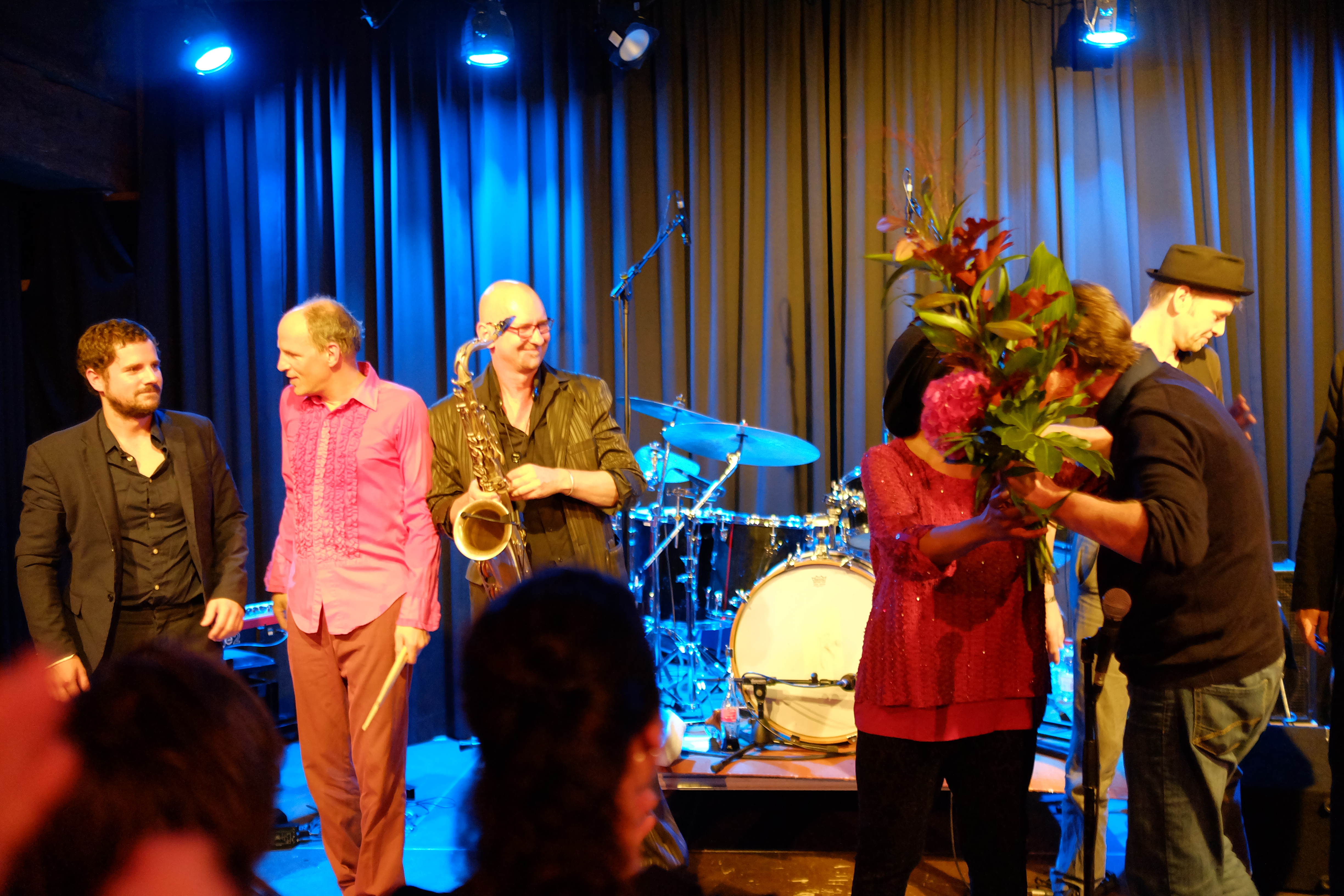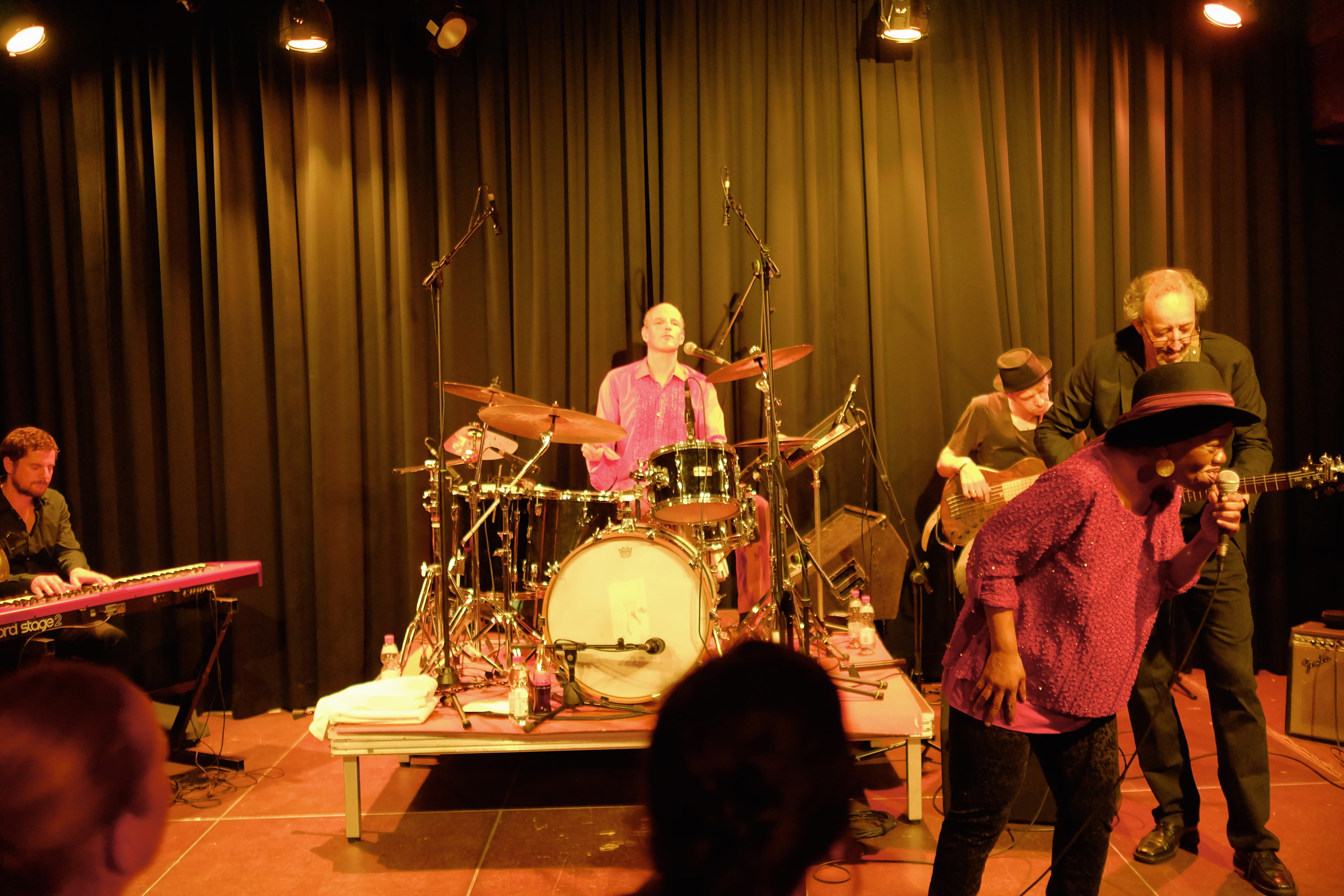 Das hat von Anfang bis Ende sowas von gefetzt! Die Nujazz-Formation „Club des Belugas“ aus Wuppertal brachten den Saal im Leeren Beutel am 6. Oktober zum Kochen. Gleich während des zweiten Liedes forderte Sängerin Brenda Boykin einen Herrn zum Tanzen auf. Die aufgeweckte Dame sorgte sowieso eine wunderbare Stimmung mit ihren Witzchen, Anekdoten und ungebrochener Lebensfreue – ganz abgesehen von ihrer Wahnsinnsstimme. Aber auch ihre Mitstreiter, darunter Mickey Neher am Schlagzeug, Matze Bangert, Bass, Roman Babik am Keyboard und Detlef Höller Gitarre, boten höchste inspirierte Instrumentalkunst. ug – Fotos von Dietmar Grün