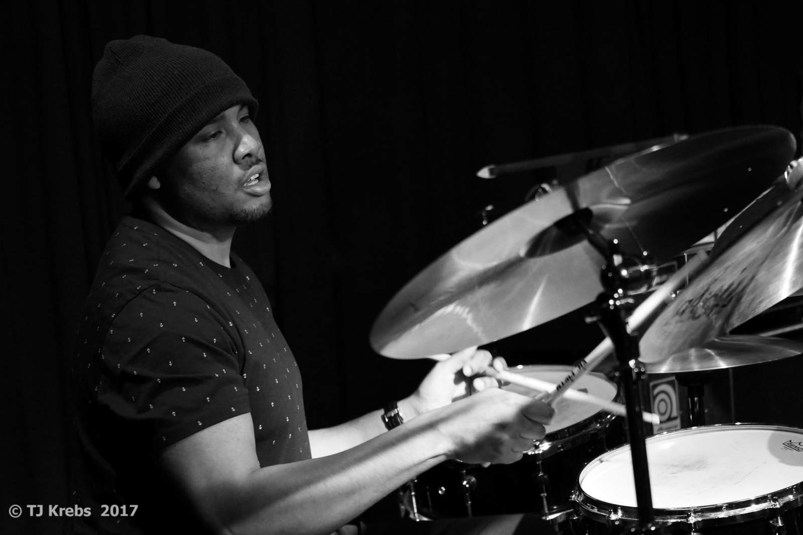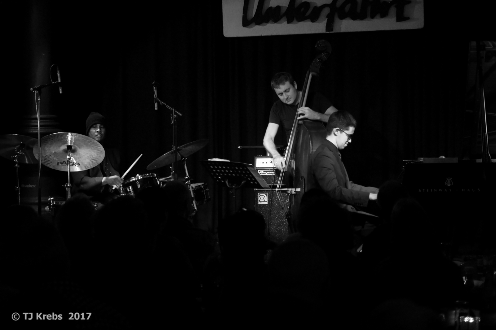 Quincy Jones presents: … und das Publikum kam und huldigte dem Pianisten Justin Kauflin, der zum ersten Mal in der Münchner Unterfahrt gastierte. Das ehemalige Wunderkind am Klavier und der Violine verlor mit 11 Jahren aufgrund einer seltenen Krankheit sein Augenlicht. Der Jazz rettete ihn praktisch und ist seitdem Passion und große Liebe, nicht zuletzt beeinflusst durch seinen ehemaligen Lehrer und Mentor Clark Terry. Gemeinsam mit seinem langjährig vertrauten Drummer Billy Williams und Thomas Fonnesbaek filigran und einfühlsam am Bass, verwandelten die drei den Club in einen swingenden Jazz-Tempel: andächtige Stille bei Solostücken, funkensprühende Soli, mitreißendes Triospiel und quasi als Höhepunkt der Beatles Song „ A day in in the life“ der, letztlich durch Kauflins gefühlvolle Interpretation, in unglaublich dynamischen Jazzgefilden gipfelt. Ein begeisterlicher Abend „… Junge komm bald wieder …“!