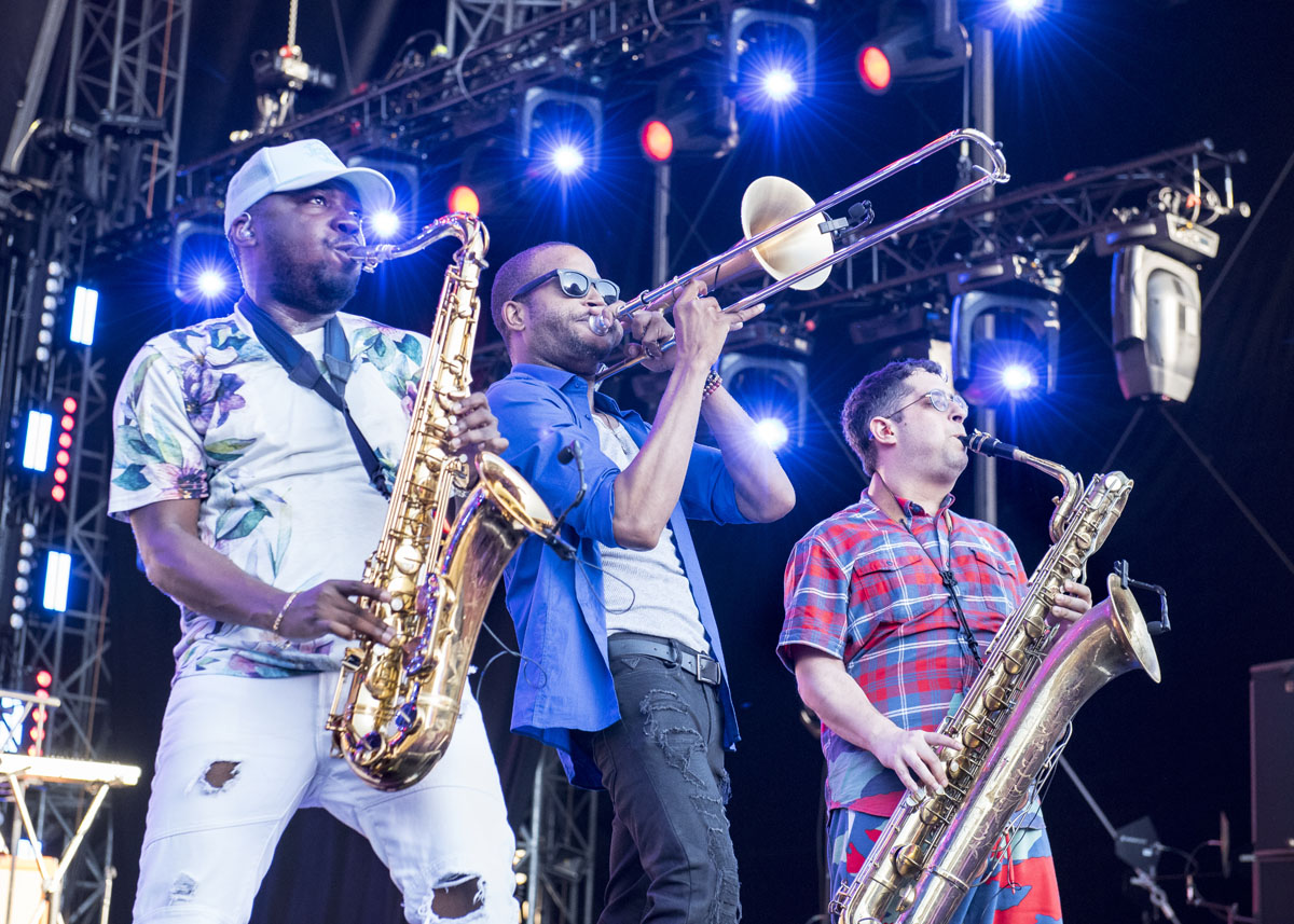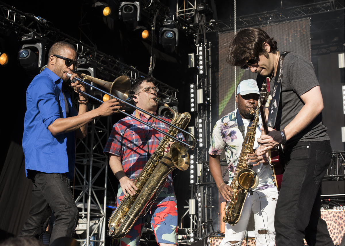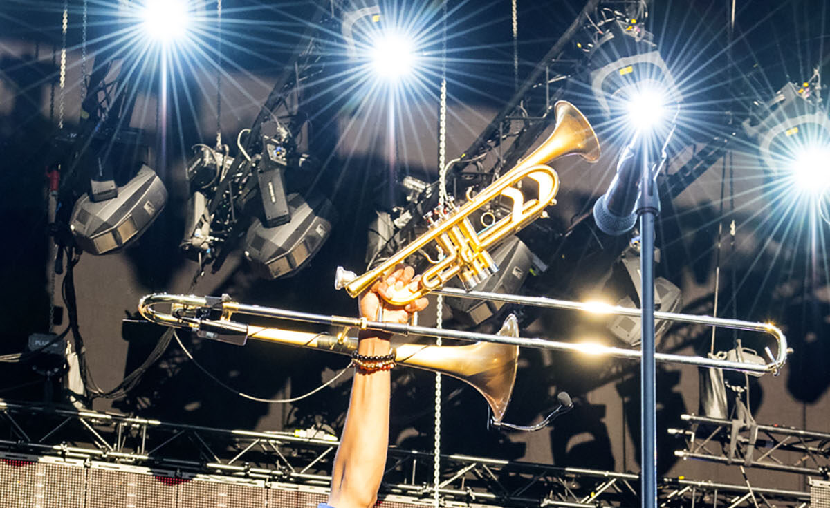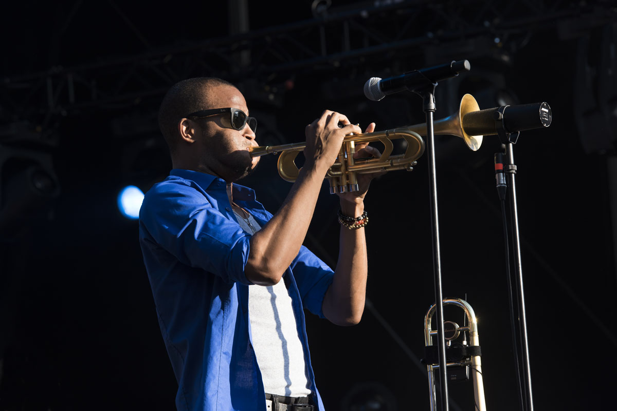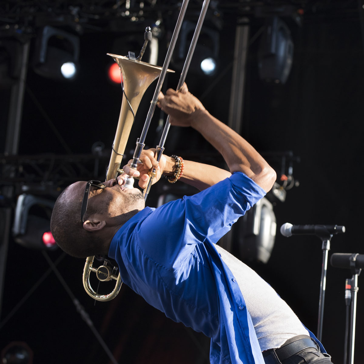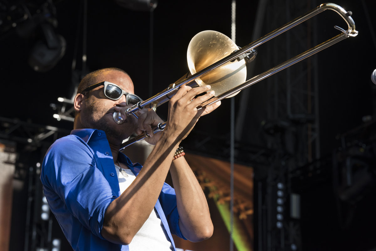 Jan Delay mag es der JazzZeitung.de verzeihen, dass für die Galerie mehr Fotos von Trombone Shorty ausgewählt wurden als von ihm. Das mag an der selektiven Jazz-Wahrnehmung der Redaktion liegen. Als echtes New Orleans-Gewächs steht Shorty für einen Dixie-, Funk- und Blues-orientierten Jazzgroove, der sich häufig an der Kante zur Tanzmucke bewegt, aber dann doch nie auf dem Dancefloor ausrutscht und ins Seichte driftet. Als perfekter amerikanischer Showman lieferte Shorty exakt 60 Minuten Power-Pop-Funk-Jazz ab und keine Minute mehr. Seine druckvolle New Orleans Show inszenierte der kurzgewachsene Posaunist im Zusammenspiel mit seinen virtuosen Sideman: Mike Bass am viersaitigen E-Bass, Pete Murano mit einer exzessiven E-Gitarre, Joey Peebles mit solidem Rockjazz-Schlagzeug sowie die temperamentvollen Saxophonisten BK Jackson und Dan Oestreicher, die den James Browns-Horns Konkurrenz machen könnten. Das Repertoire umfasste in etwa Shortys jüngste CD „Parking Lot Symphony“ mit Nummern wie „Here Come the Girls” oder „Where It At?“. Trombone Shorty spielt nicht nur Posaune wie sein Name vielleicht glauben machen möchte: Virtuose Trompeteneinlagen und originelle Songs aus Eigenproduktion zeigen ihn auch in Stuttgart als vollendeten Showman, Sänger, Bandleader, Dirigenten, Komponisten und auch Blechbläser.