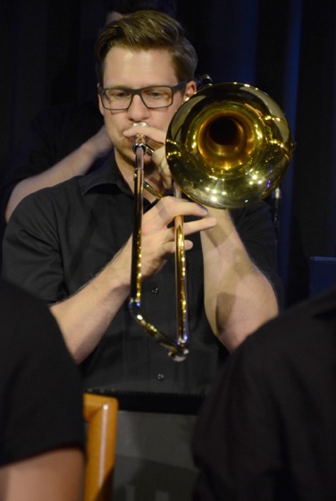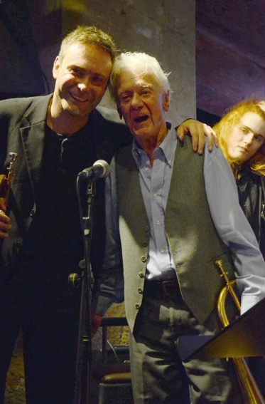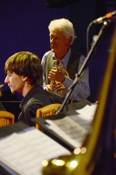 „Weiter klatschen“, forderte Lorenz Kellhuber das Publikum forsch-fröhlich auf, als sich die Musiker der Uni-Bigband durch die eng gepackten Stuhlreihen zu ihren Plätzen schlängelten. Kellhuber selbst verschwand hinter einer Steinsäule und setzte von dort am Flügel einige dramatische Akkorde zum Auftakt für einen gleichermaßen unterhaltsamen, wie packenden Abend. Mit dem „A-B-C Blues“ von Bob Brookmeyer wählte das Orchester unter Leitung des Trompeters Benny Brown einen kraftvollen Einstieg. Damit machte es gewissermaßen von Anfang deutlich, wo der Hammer hängt. Unerwartete melodische Wendungen und abrupte harmonische Wechsel wurden problemlos gemeistert und zeigten die gute Verfassung, in welcher der studentische Klangkörper sich präsentierte. Dazu trugen auch die beiden Profimusiker Felix Fromm, der die Posaunen-Section verstärkte, und Brown (tp) bei, der hier sein Debüt als Bigband-Leader gab. Nach einem Workshop mit dem UJO hatte Kellhuber die beiden gefragt, ob sie beim Konzert mitspielen und – im Fall des Trompeters – ihn am Dirigentenpult vertreten würden. Beide willigten sofort ein, hatten sie doch bereits als Mitglieder im Jazzorchester Regensburg Kontakt zur Stadt. „Er spielt wie Anfang 20 und sieht auch garantiert nicht aus wie 87“, kündigte Kellhuber nach der ersten Nummer gut gelaunt den niederländischen Gastsolisten an. Eine leichte Unsicherheit beim Erklimmen der Bühne war gänzlich weggeblasen, als Ack van Rooyen sein Instrument zu einer wunderbar entspannten Ballade ansetzte, einer leichtfüßigen, brasilianisch inspirierten Komposition, bei der das Orchester seine weiche, leise Seite hervorkehrte. Anfänglich ein wenig kurzatmig, überzeugte van Rooyen auf ganzer Linie und eroberte das Publikum sozusagen im Sturm. Sowohl mit seinem geschmeidigen Ansatz, dem warmen, herrlich schlanken Ton und einer zurückhaltenden emotionalen Phrasierung setzte er dem Bigbandsound ein ums andere Mal leuchtende Glanzlichter auf. Höhepunkte des Abends waren zwei Duette, die sich van Rooyen auf dem Flügelhorn mit dem Trompeter Benny Brown lieferte, und ein unbegleitetes Duo mit Kellhuber. „Mit ihm am Piano“, freute sich der sympathische Niederländer, habe er „endlich wieder einen Partner gefunden“ mit dem der das gefühlvolle „My One And Only Love“ wie früher mit Jörg Reiter, seinem langjährigen Duopartner aus Stuttgart, spielen könne. Obwohl fast zwei Generationen zwischen den beiden so unterschiedlichen Musiker liegen, geriet die einst von Frank Sinatra gesungene Liebesschnulze zu einem der eindrücklichsten und bewegendsten Momente des Abends. Tiefen Eindruck hinterließ auch ein Stück, „Autumn Bugle“, das der Flügelhornist „all jenen gewidmet hat, die gegangen sind“. Das sind von Albert Mangelsdorff, mit dem er jahrzehntelang im United Jazz & Rock Ensemble spielte, Gil Evans und Clark Terry, bis zu Peter Herbolzheimer, in dessen Rhythm Combination and Brass er lange gespielt hat, viele befreundete Jazzgrößen aus der ganzen Welt.