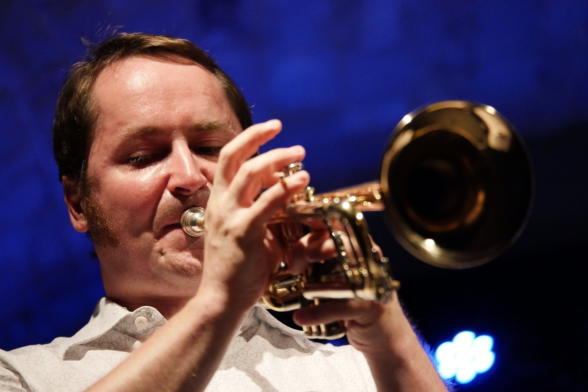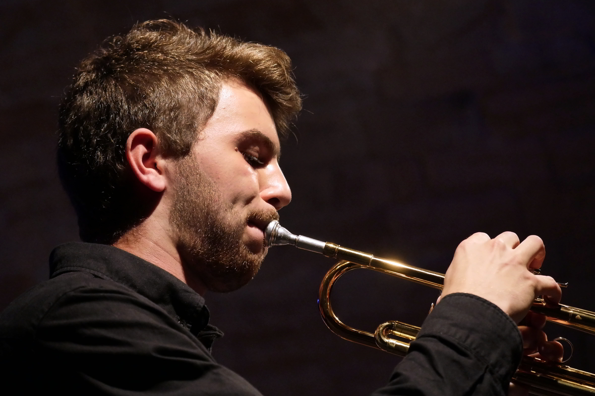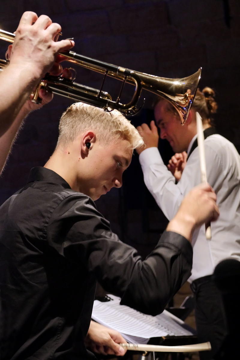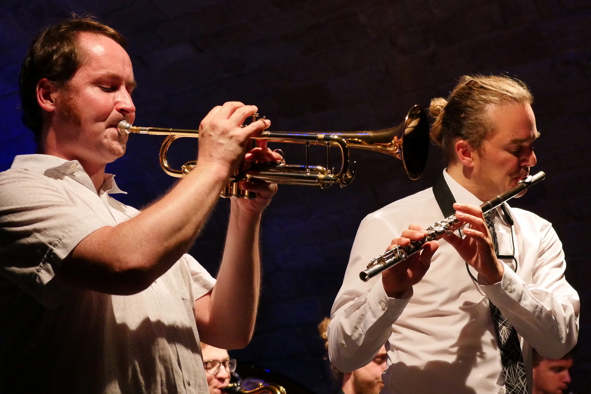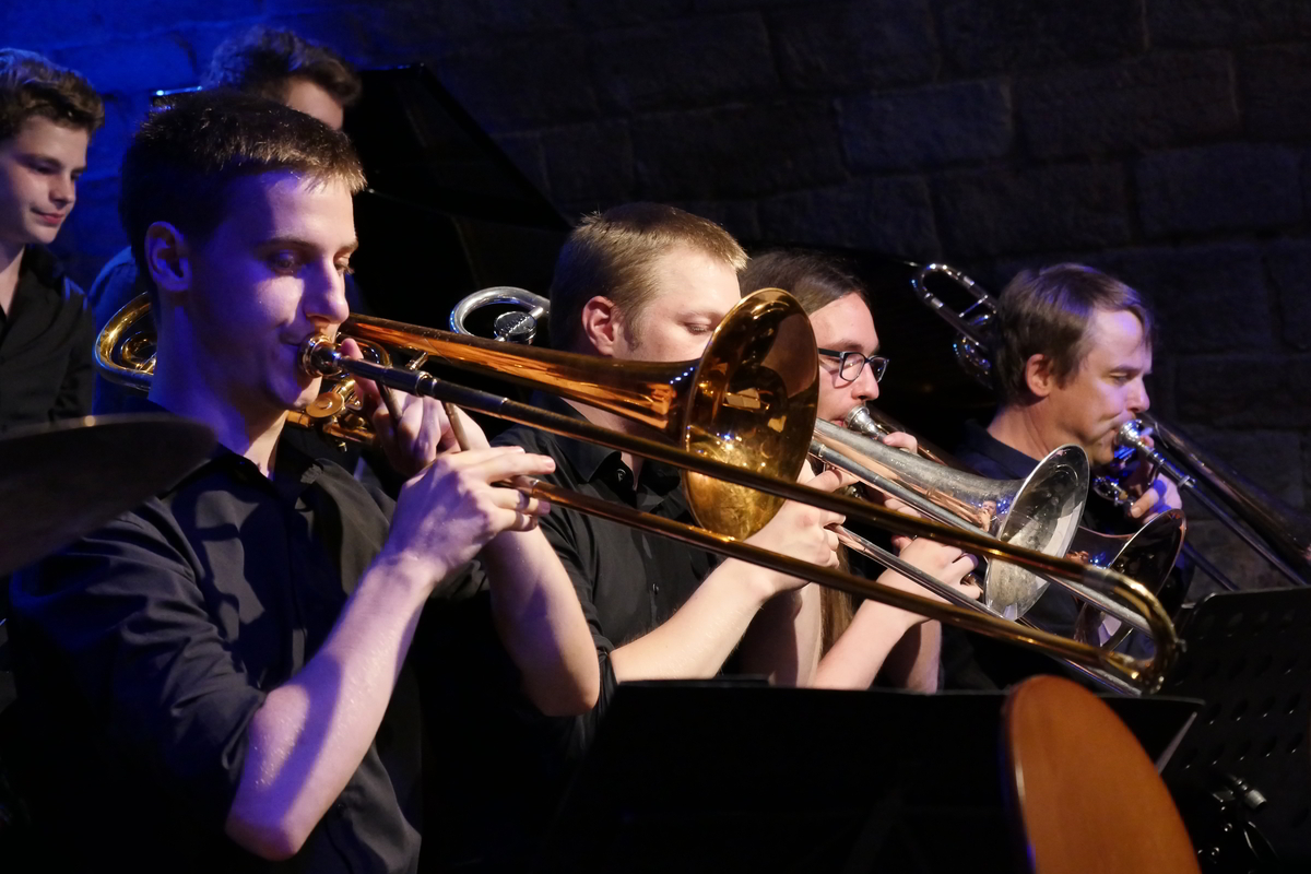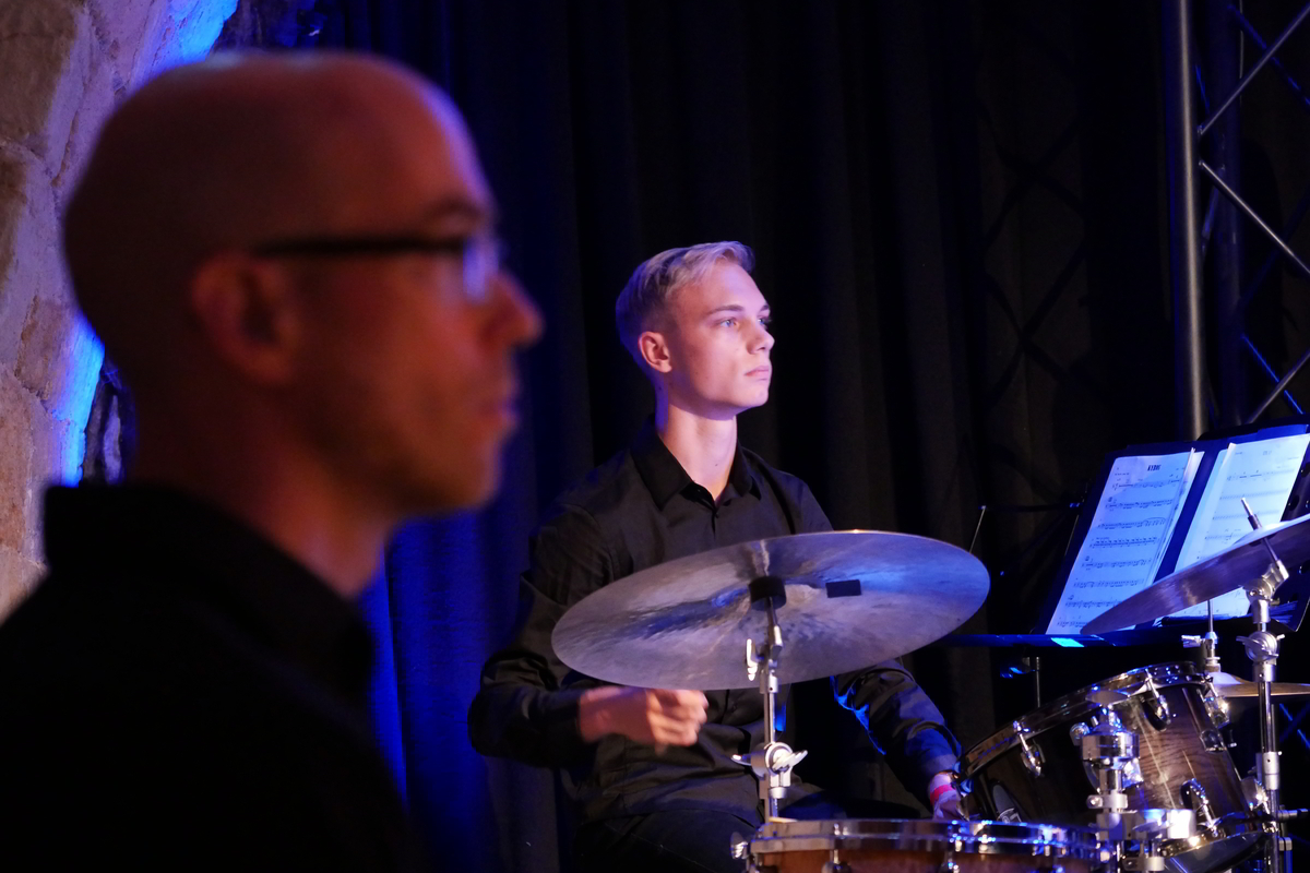 Martin Auer im Quintett mit Florian Trübsbach an den Reeds, dem Bassisten Andreas Kurz, Bastian Jütte am Schlagzeug und dem Pianisten Rolf Langhals unter Leitung des Trompeters im „Sommercamp“ mit dem Jugend-Jazzorchester Sachsen.