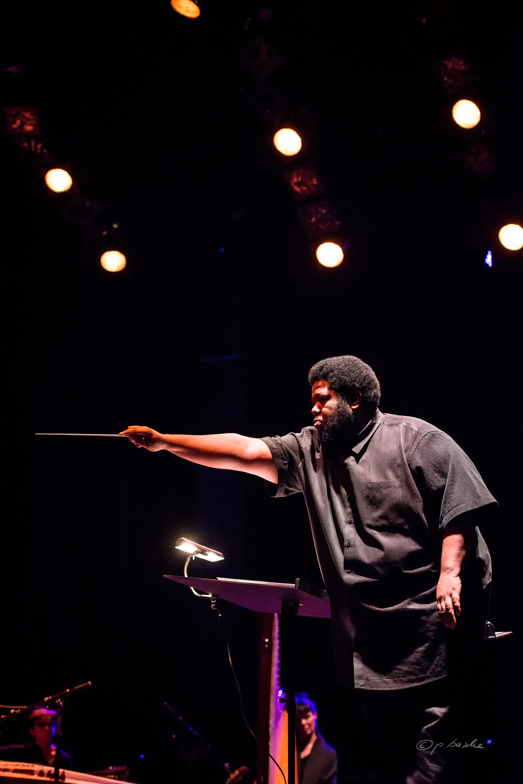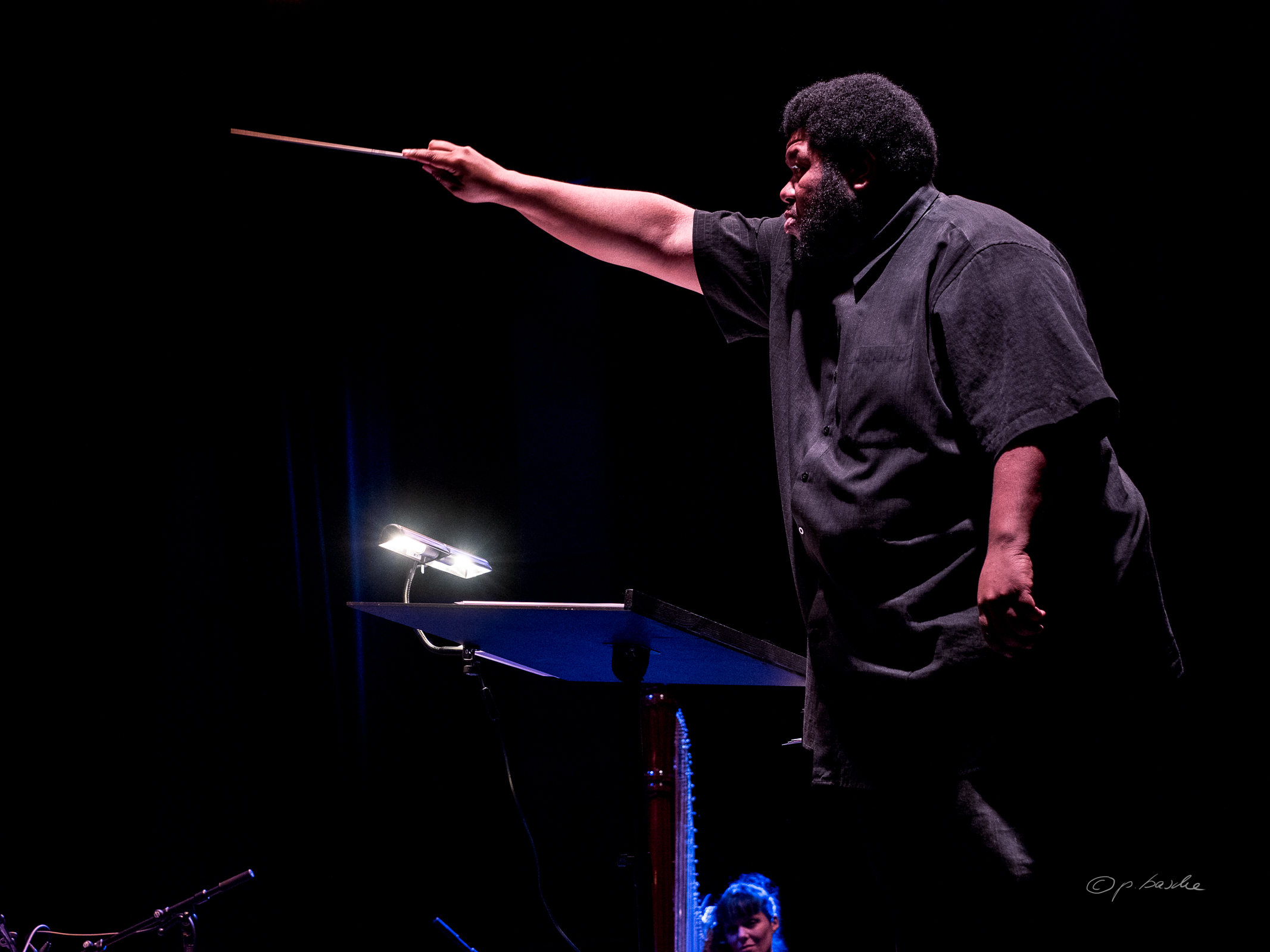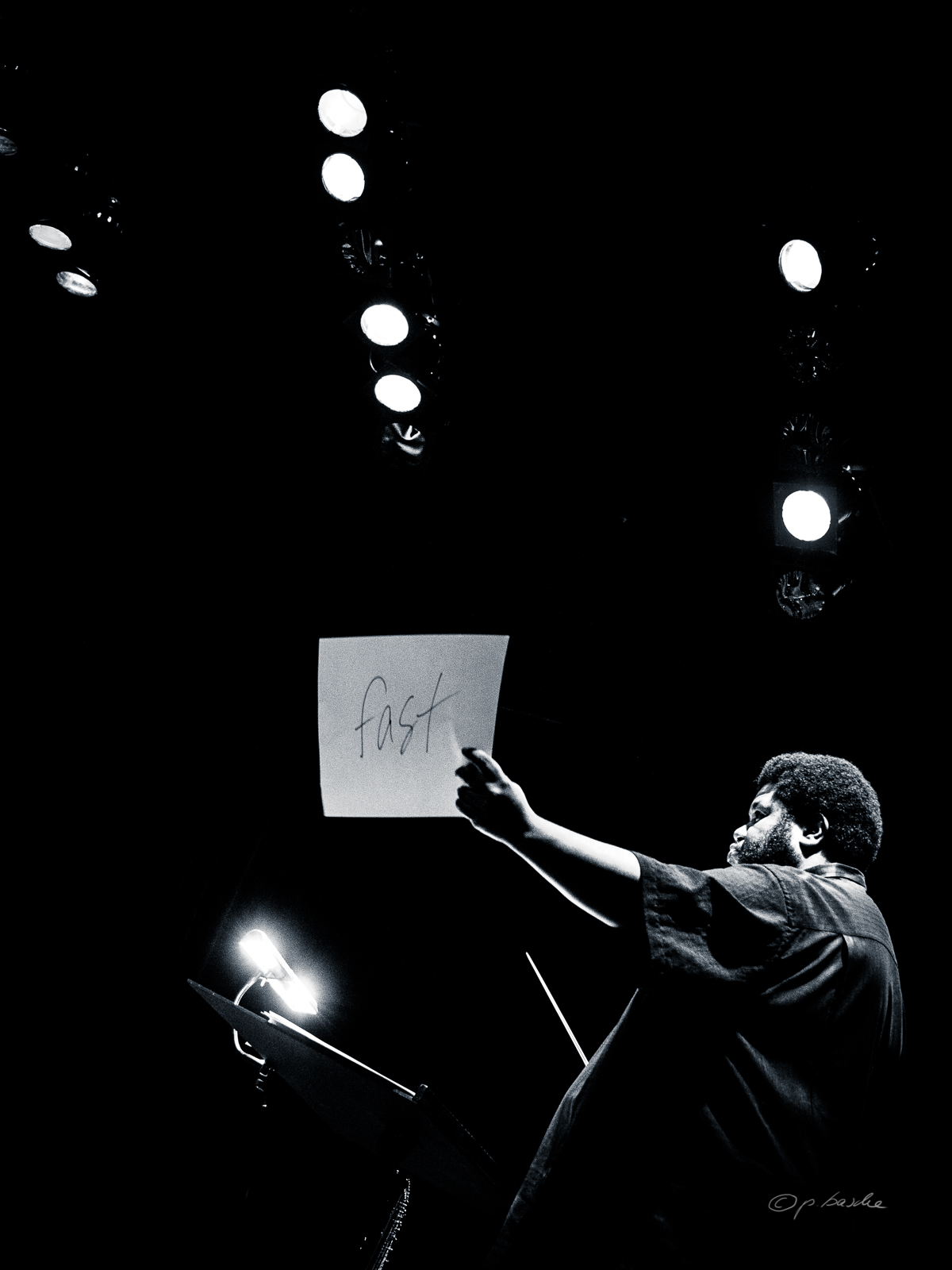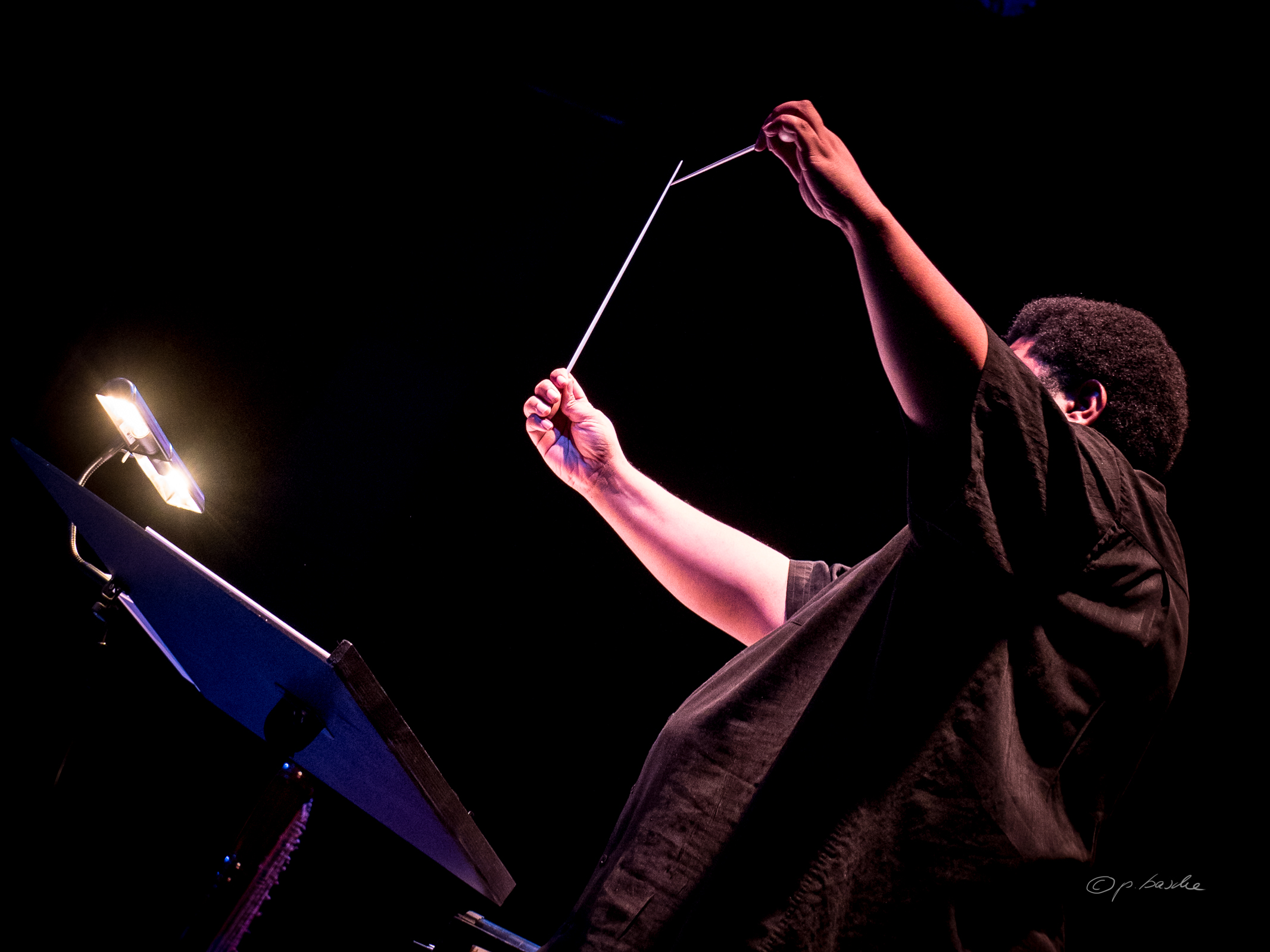 So auch an diesem Abend. Was da passiert ist, ist ebenso schwierig wie einfach zu beschreiben. Man nennt das wohl Instant-Composition. Was passiert da? Ein Ensembleleiter („Conductor“), eben Tyshawn Sorey, ordnet mit mehr oder minder vorgestalteten kleinen Aktionsvorgaben eine neue Komposition in Echtzeit. Das wird über Handzeichen und Zettel mit Spielanweisungen zwischen Conductor und Musikerinnen kommuniziert. Material für den Conductor sind also musikalische Ideen (1) und die Musikerinnen (hier sind es 20! – siehe Liste unten). (2) mit ihren Instrumenten (3), ihre Reaktionen auch untereinander (4) und der „Spirit“ des Conductors selbst (5).