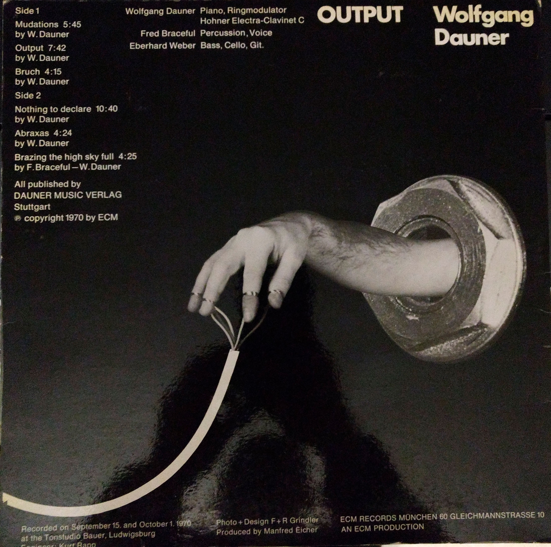 Aber unter den heutigen Bedingungen kann man es auch ander herum sehen. Dass, was da Birne und Gehirn ist, geht verwandelt über in das Stromnetz. So ergibt schließlich auch der Titel der Platte einen Sinn: Output heißt der und nicht Input. Der Output ist dann schließlich das, was hinten auf der Platte steht, die Stücke nämlich. Man wird Netzbetreiber. Und eben genau das ist es, was ECM jetzt angeblich auch geworden ist. Lange hat man sich geziert bei ECM, nun – auf wessen Druck auch immer oder aus neuer Einsicht – hat es sich geändert. Dauner hat die in unvergleichlich hellseherischer Weise (na, Glühbirne = hell!) geahnt. Nein: Ich bin sicher: Gewusst!