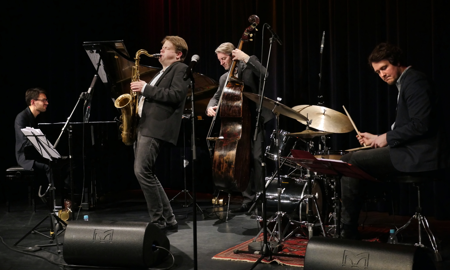 Die Germeringer Jazzreihe „JAZZ it!“ eröffnete das Jahr 2018 am vergangenen Freitag mit einer hochkarätigen deutschen Jazz-Formation. Die Band um den Saxophonisten Denis Gäbel, mit Sebastian Sternal am Piano, dem Bassisten Martin Gjakonovski und Silvio Morger an den Drums, boten relaxten und gleichzeitig ungemein spannenden Jazz. Beeindruckend, wie homogen die vier Musiker interagieren zu den harmonisch ausgefeilten Kompositionen aus der Feder des Bandleaders, mit fein gesponnenen Themen, groovigen Elementen und inspirierten Improvisationen. Jeder lässt dem anderen Platz sich zu entfalten; man merkt sofort, dass die Gruppe seit Jahren zusammen spielt und sich jeder auf den anderen verlassen kann. Spielfreude pur!