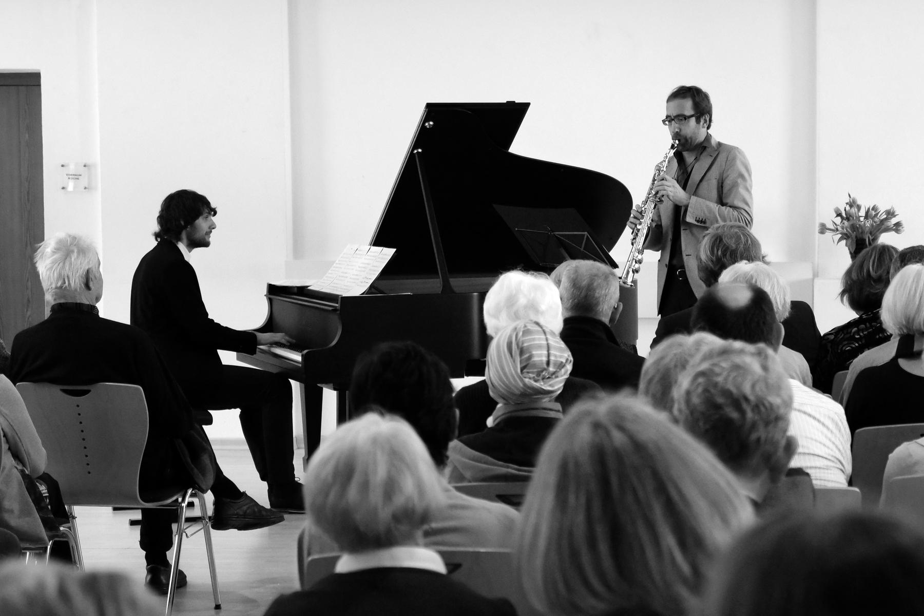 Eine besondere Matinee dieser Konzertreihe, stand sie diesmal ganz im Zeichen des Jazz und der Improvisation. Allerdings mit einem kleinen Wermutstropfen gleich zu Beginn: Elin, der außer Sopransaxophon auch ein Virtuose an der Bassklarinette ist, musste beim Konzert leider kurzfristig auf dieses herrliche Instrument verzichten, da es kurz vor dem Konzert umfiel und nicht mehr spielbereit war. Wie es im Jazz nun mal ist wurde das Programm kurzerhand umgestellt, und so spielten die beiden einfach Stücke für Piano und Sopransaxophon aus ihrem Repertoire… und die hatten es in sich! Außer Marcus Millers „Straight to the heart“ und Jan Garbareks „Twelve Moons“ standen vornehmlich eigene Kompositionen im Focus. Allesamt vorgetragen mit Verve und beseelten Improvisationen. Dabei entwickelten sich lyrische Zwiegespräche, geprägt von herrlichen Melodieläufen und zogen das Publikum in Bann, getreu dem Motto der Matinee „Rhythm changes“.