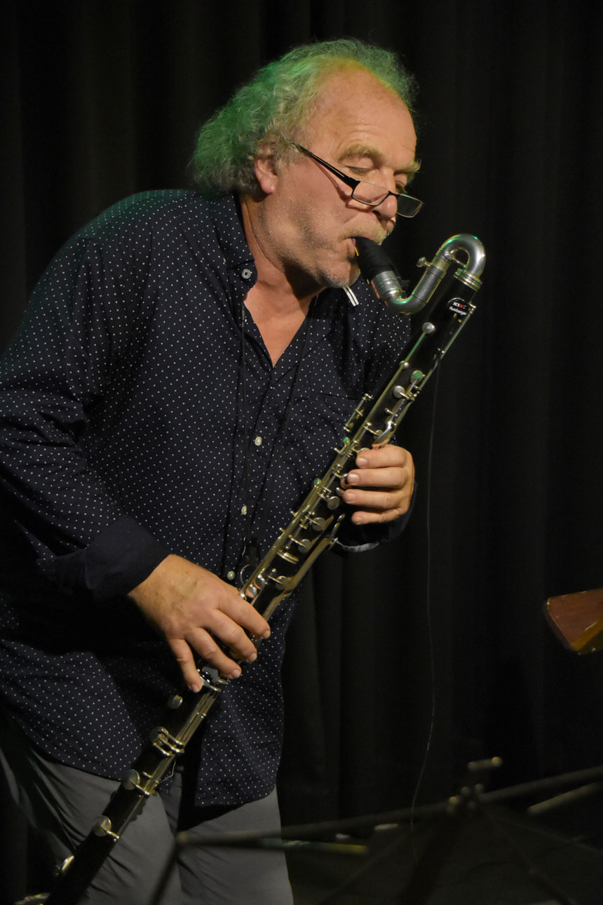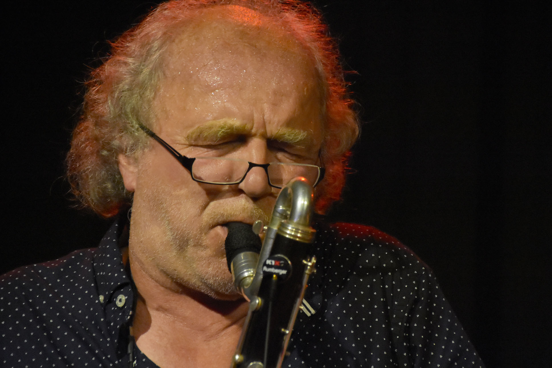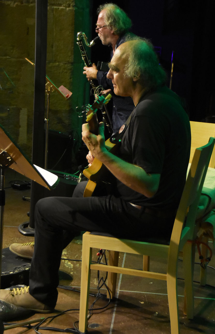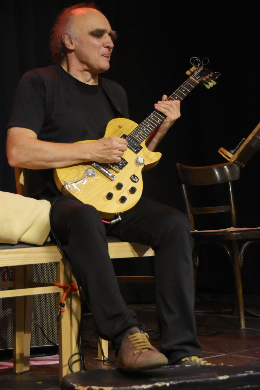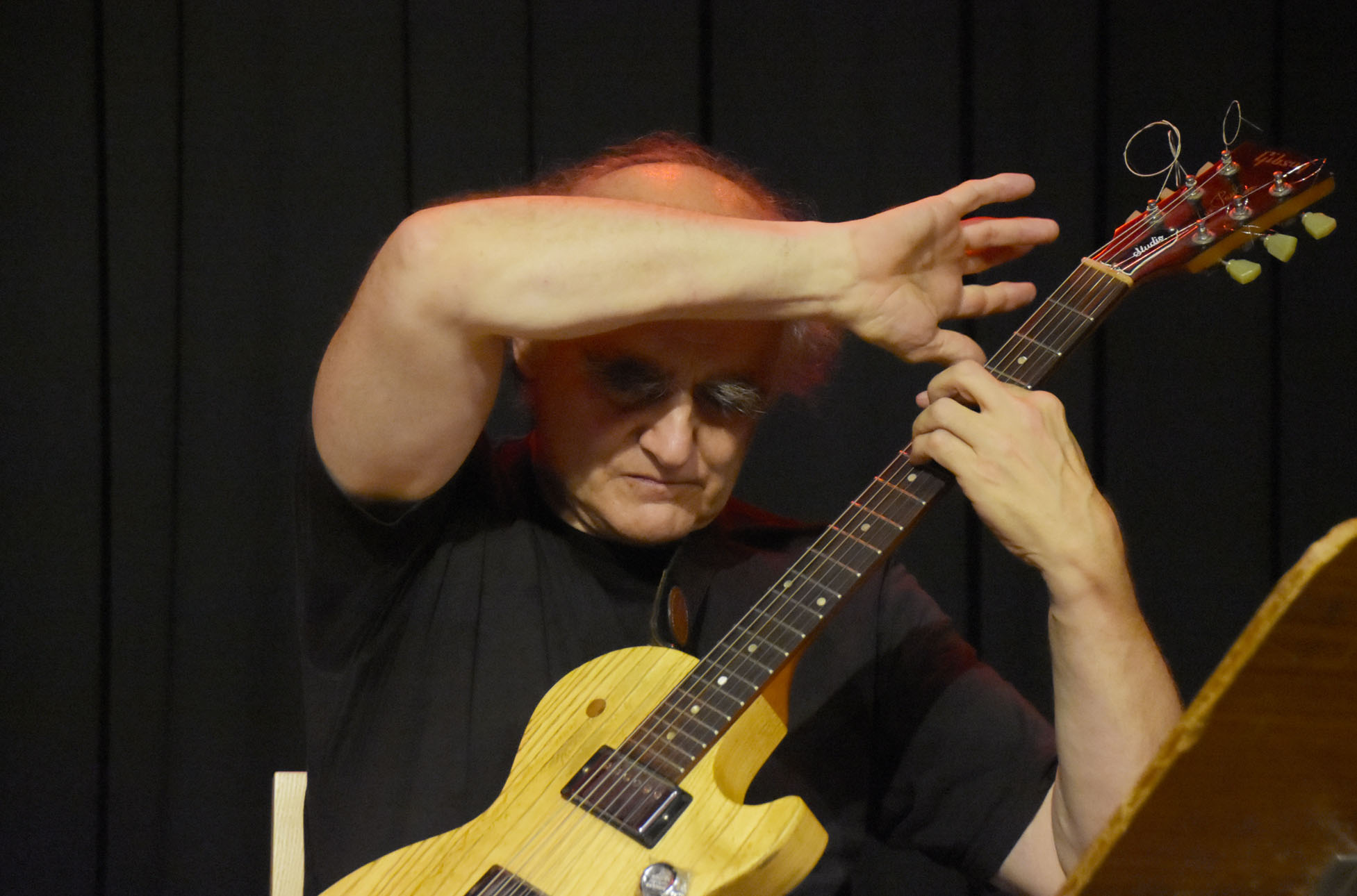 Die beiden Musiker stellten das von Sachse erarbeitete und arrangierte Programm „Hey Joe“ mit Kompositionen von Jimi Hendrix zum Auftakt des Herbstprogramms im Leeren Beutel vor. Es ist gewissermaßen eine Verneigung vor dem großen Idol und ein Dank, denn der Sachse verdankt dem Gitarren-Heroen seinen zweiten Vornamen. Als der jugendliche Beatfan 1967 mit einer Amateurband auftrat und niemand seinen Namen wusste, feierten ihn seine Kumpel nach dem Gig als „Joe“. Sachse war dem afroamerikanischen Rockgitarristen kurz zuvor in einer Beatclub-Sendung von Radio Bremen hoffnungslos verfallen. An Virtuosität und Vielseitigkeit hat der 69-Jährige sein Vorbild, das er bis heute überaus schätzt, längst überrundet. Dessen eruptive Energie und Emotionalität aber bleibt selbst in den wüstesten Akkordorgien, mit denen Sachse regelrechte Klangstürme auf der Bühne entfacht, im Prinzip unerreicht. In ausgeklügelten und durch die Bank spannenden Arrangements voller unerwarteter Wendungen, schriller Peitschenklänge und ausgefallener Ideen bleibt die Essenz der Hendrixschen Kompositionen erhalten und erkennbar. Dennoch erscheinen „Red House“, das Hin- und Hergeworfensein von „Manic Depression“, das sanfte „The Wind Cries Mary“, „Purple Haze“ oder das psychedelische „Burning of The Midnight Lamp“ in einem eigenen, manchmal sperrigen Klanggewand. Das expressive, manchmal hektisch-entfesselte Spiel des Saitenmeisters korrespondiert dabei bestens mit dem warmen Sound und den ausdrucksstarken Improvisationen des Bläsers, der gelegentlich auch die Bassfunktion übernimmt. Etwas mechanistisch wirkt manchmal die skurrile Fussarbeit Sachses. Damit klopft er auf seinem Instrumentenkoffer und einem mikrofonierten Plastiksack den Rhythmus straight durch, „durchtappt“ müsste man eigentlich korrekter formulieren. In Verbindung mit dem exzessiven Klangrausch eine auch physisch enorme Anstrengung, die sich am Schluss im schweißgetränkten T-Shirt deutlich und wohlverdient abzeichnet.