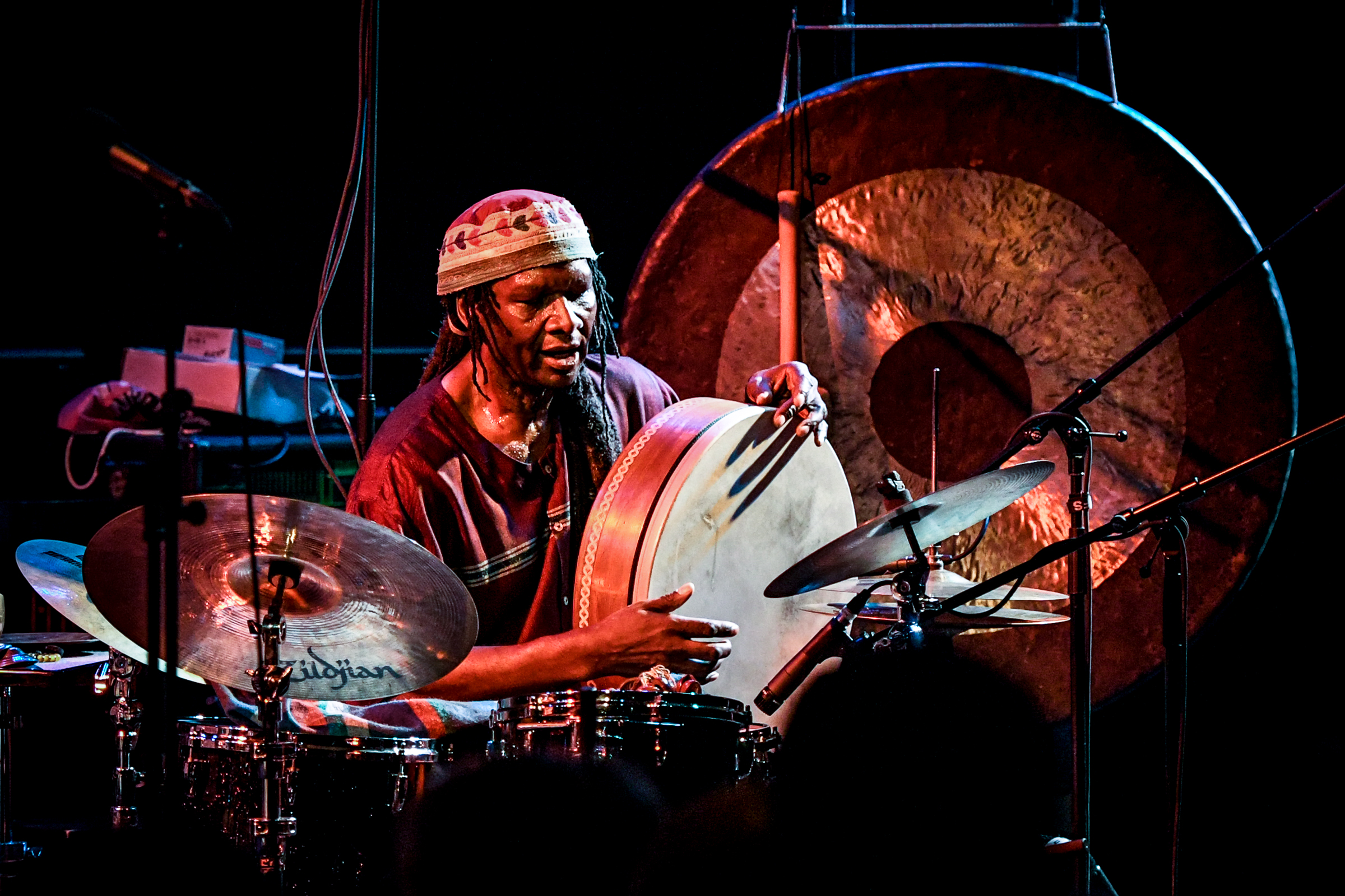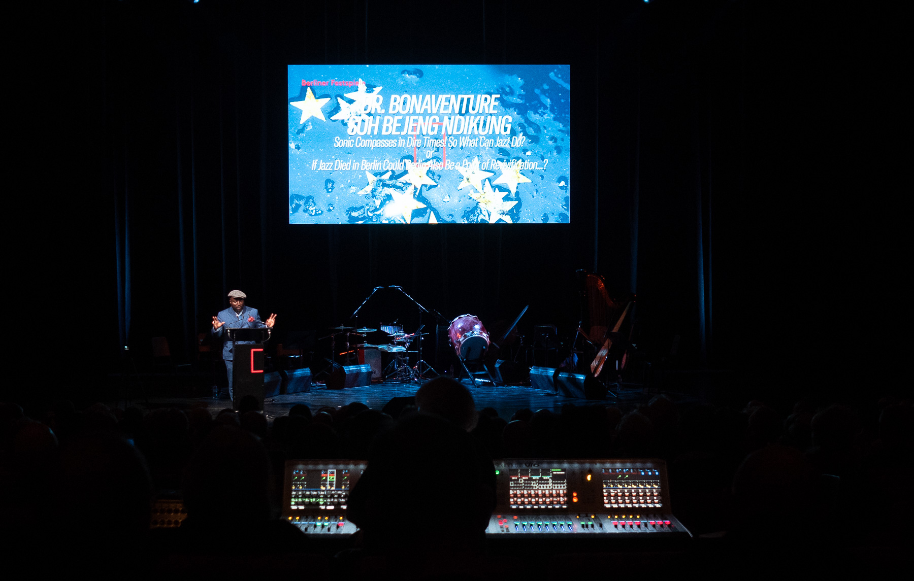 Programmatisch startete das Festival mit einem Vortrag von Bonaventure Ndikung „So What Can Jazz Do?“ fragt er sich und unsereinen. Was kann Jazz leisten in einer Zeit der zunehmenden Verdüsterung durch das Wiedererstarken von Faschismen, Unterdrückungen, Rassismus, Chauvinismus …. Was kann Jazz machen? Die Antwort ist reichhaltig und schwierig. Es geht dabei um Protest, um Geist (Spirit), es geht um „Heilung“, um eine gesellschaftliche „recalibration, to be save“. „There is hope“, sagt er und man will ihm glauben. Der Duktus des Pamphlets erinnert an die Wucht der 60er-Jahre Aufbruchbewegungen. Natürlich „Befreiung“ will man haben, aber eben doch nicht ohne ein Netz von Nebenbegriffen, die „Befreiung“ zu einem reichhaltigen und nicht leeren Begriff werden lassen.
