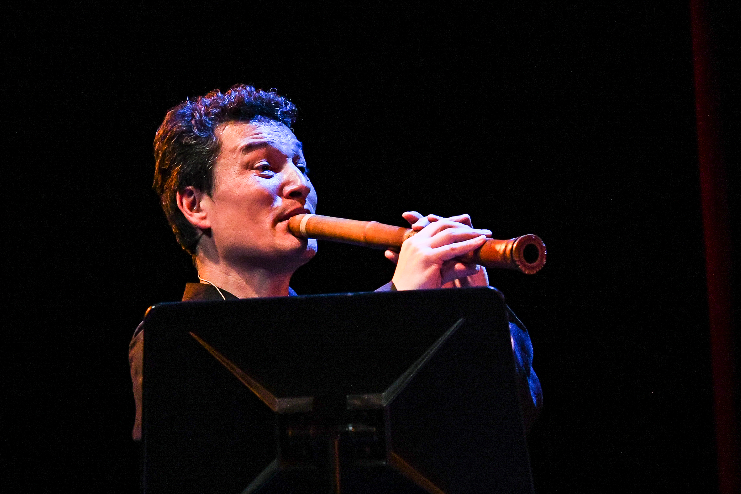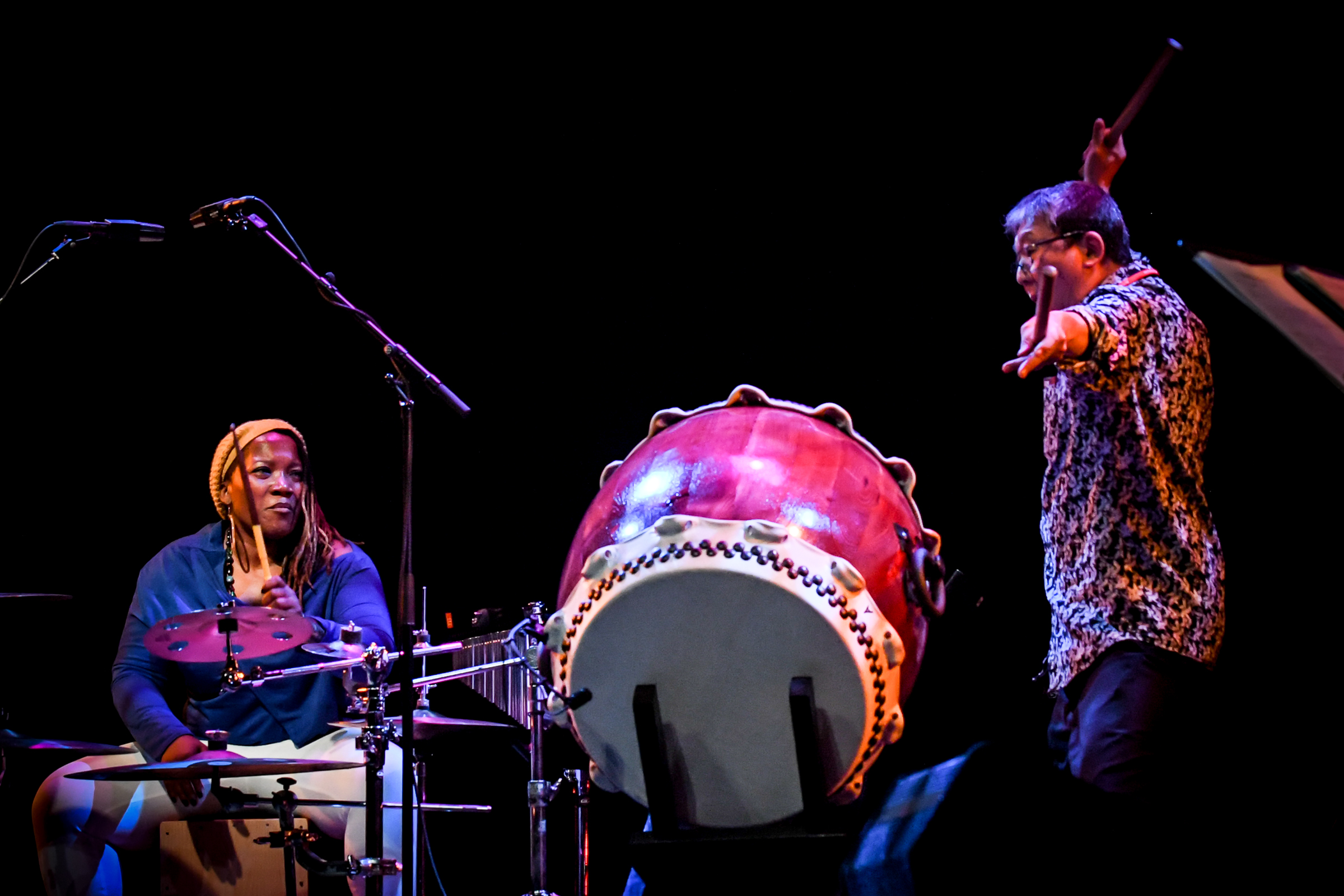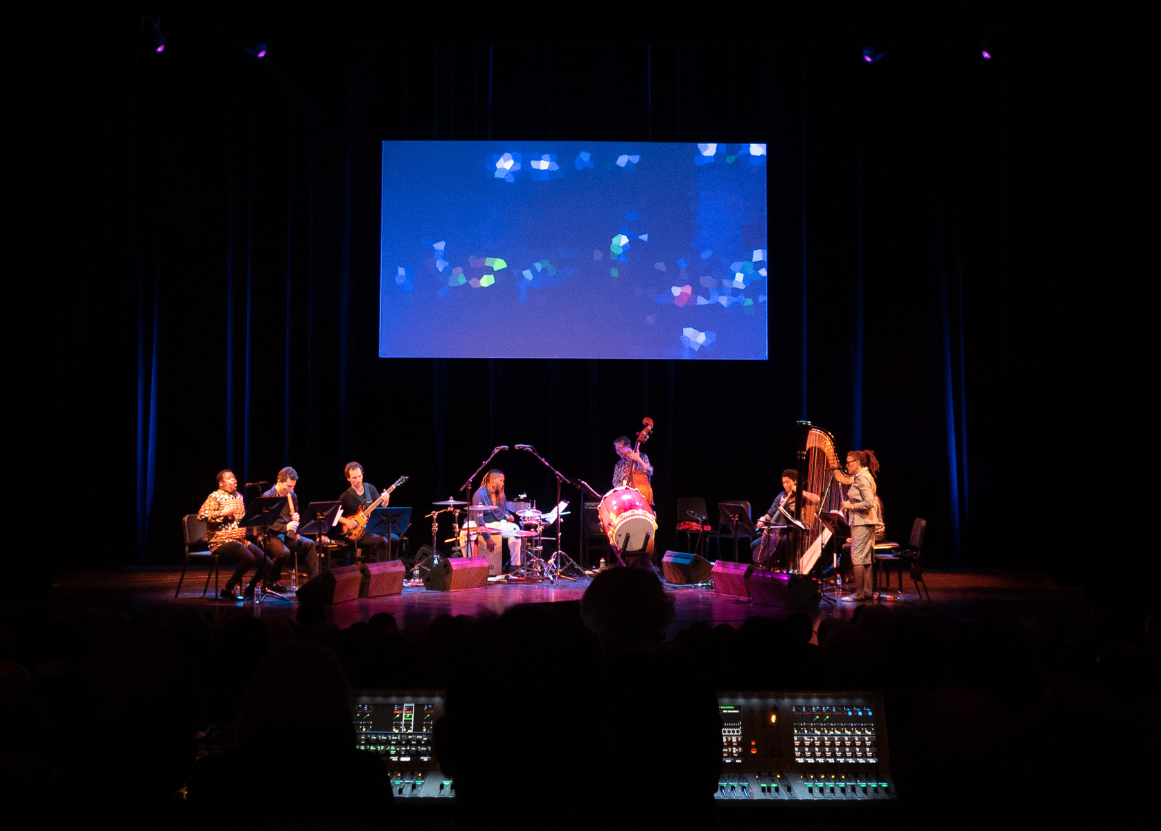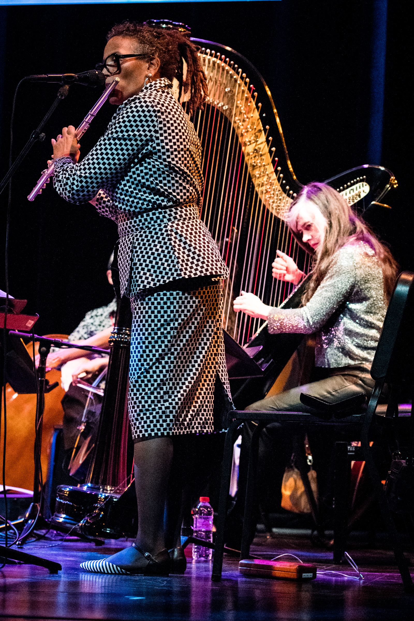 Doch zunächst musste es „Nicole Mitchell’s Black Earth Ensemble“ (USA) mit „Mandorla Awakening“ einzulösen versuchen. Noch im Saal, noch eingebunden in der Klammer des „Festspiel“-Hauses. In der Tat startet es mit einem sich steigernden Gewölle aus elektronischen Klängen, in das sich ein. Beat einbettet, um dann im Ensemble kraftvolle, energiereiche Blüten auszutreiben. Starker Beginn. Das Ensemble sortiert sich immer wieder in kleineren Duo- bis Quartettformationen. Harfe ist dabei, japanische Instrumente, Cello. Ein Wechselspiel aus archaischen und modernen Elementen, dann Ostinati (wohl afrikanischer Provenienz). Das geht so rhapsodisch über 40 Minuten. Leider trägt es nicht die ganz Zeit, die Momente fransen aus, die Dichtigkeit reißt. Erst zum Schluss, als eine Stimme hinzutritt, bekommt der Auftritt die Energie zurück. Ist es das, was Jazz kann?