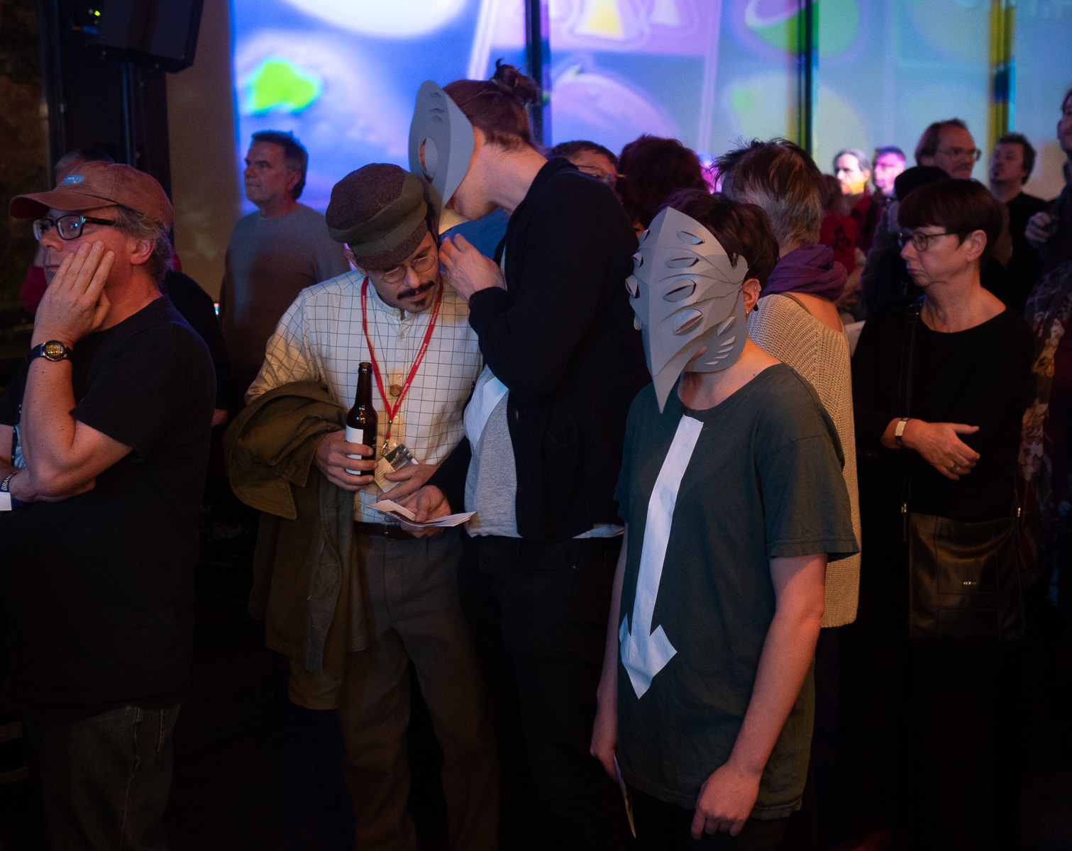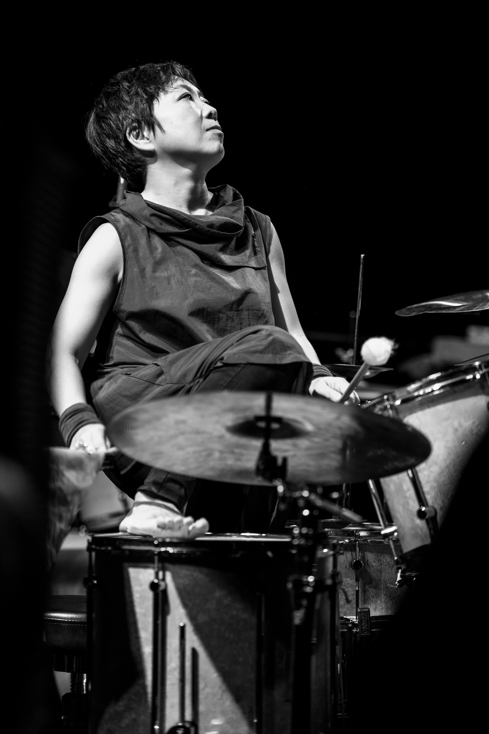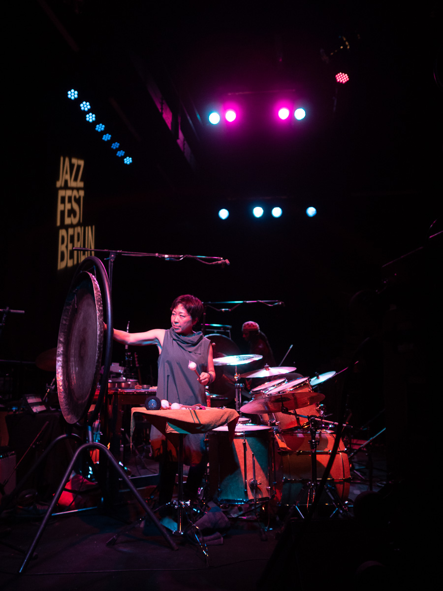 Oder ist es eher das, was dann in parallelen Veranstaltungen beispielsweise das Duo „Hamid Drake & Yuko Oshima“ (USA/Japan) in der doppelten Schlagzeugwelt ausbreiten, wenn sie einen musikalischen Sog erzeugen, ein Klanggeschehen erzeugen, das einen umhüllt und das in einem nachschwingt? Oder ist es auf der Unterbühne das „Kim Collective“ (Carte Blanche – 360° Multikanal-Installation/Live-Processing), in deren quasi unendlicher (rundeckiger) Improvisationswelt mit vogelartig maskierten Musikerinnen und Digitalbearbeiterinnen man sich häppchenweise aufladen oder entspannen kann. Oder ist es der Pianist Elias Stemeseder (Österreich), der sich im allgemeinen Geräuschpegel des Oberen Foyers seinen Improvisationskokon baut, in dessen musikalische Welt man wie durch eine unsichtbare Wand eintreten könnte? Um nur ein paar Beispiele zu nennen aus dem „Haus voll Jazz“.