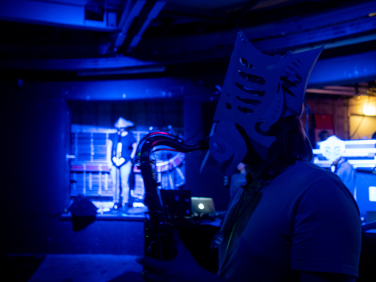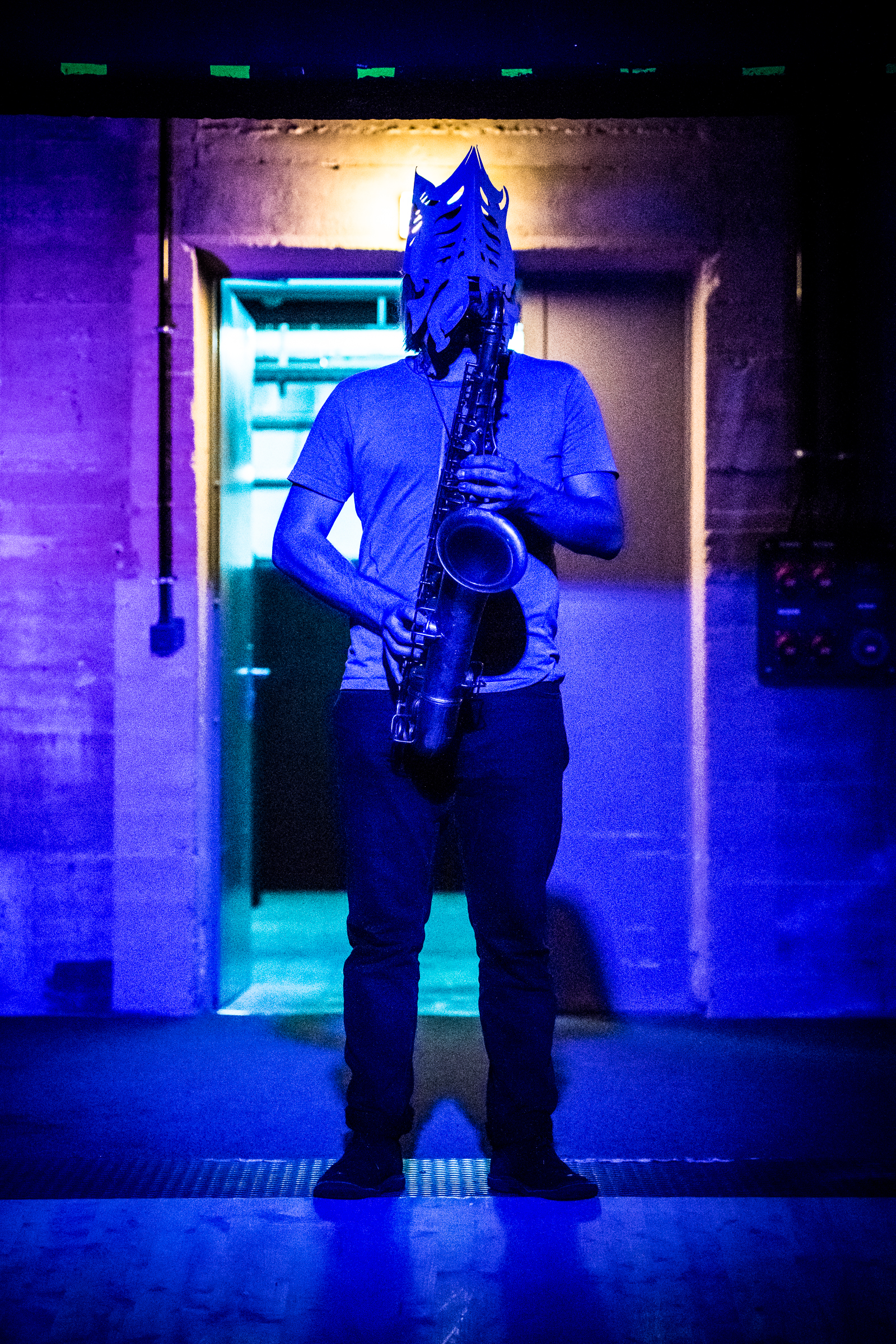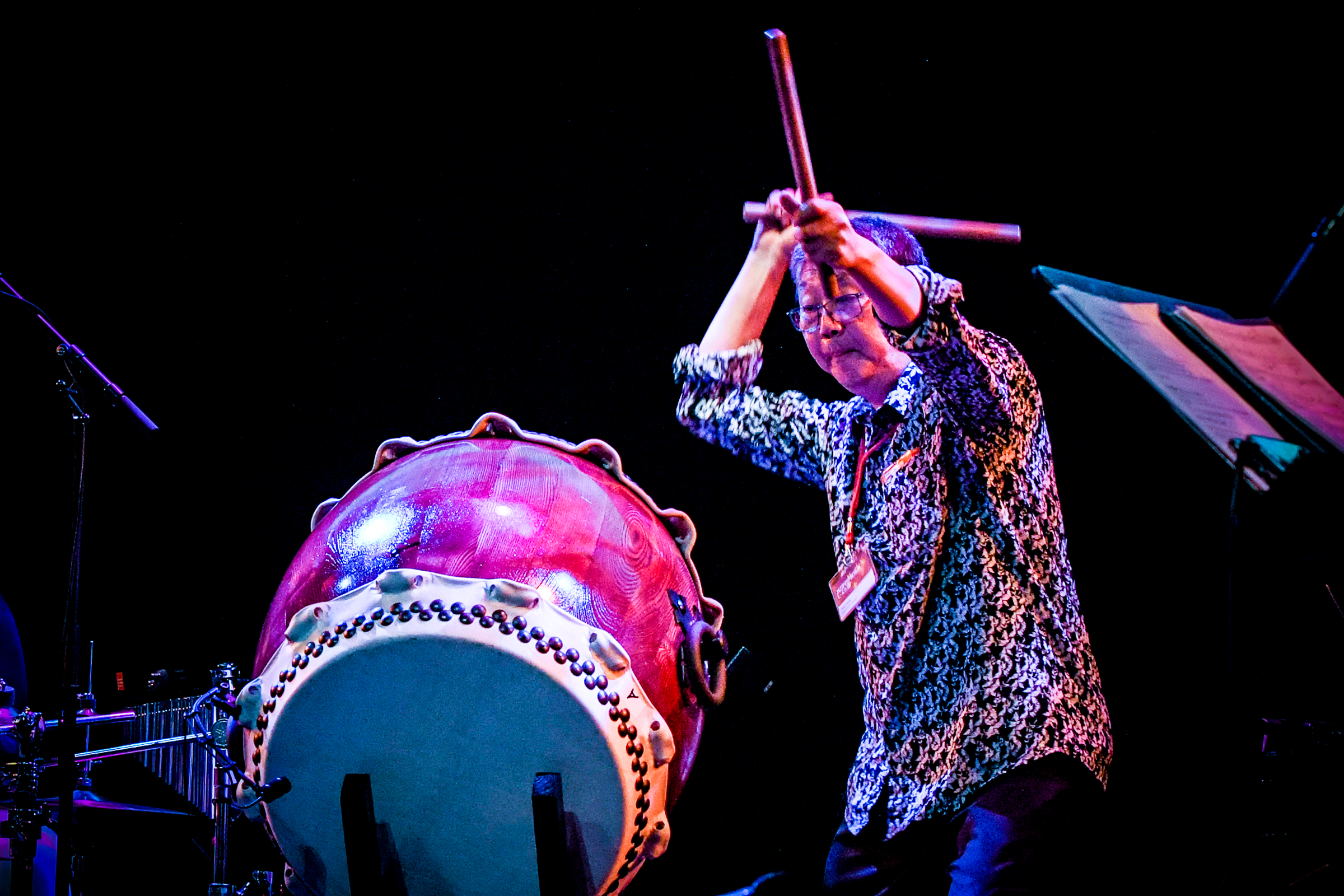 Oder ist es eher das, was dann in parallelen Veranstaltungen beispielsweise das Duo „Hamid Drake & Yuko Oshima“ (USA/Japan) in der doppelten Schlagzeugwelt ausbreiten, wenn sie einen musikalischen Sog erzeugen, ein Klanggeschehen erzeugen, das einen umhüllt und das in einem nachschwingt? Oder ist es auf der Unterbühne das „Kim Collective“ (Carte Blanche – 360° Multikanal-Installation/Live-Processing), in deren quasi unendlicher (rundeckiger) Improvisationswelt mit vogelartig maskierten Musikerinnen und Digitalbearbeiterinnen man sich häppchenweise aufladen oder entspannen kann. Oder ist es der Pianist Elias Stemeseder (Österreich), der sich im allgemeinen Geräuschpegel des Oberen Foyers seinen Improvisationskokon baut, in dessen musikalische Welt man wie durch eine unsichtbare Wand eintreten könnte? Um nur ein paar Beispiele zu nennen aus dem „Haus voll Jazz“.