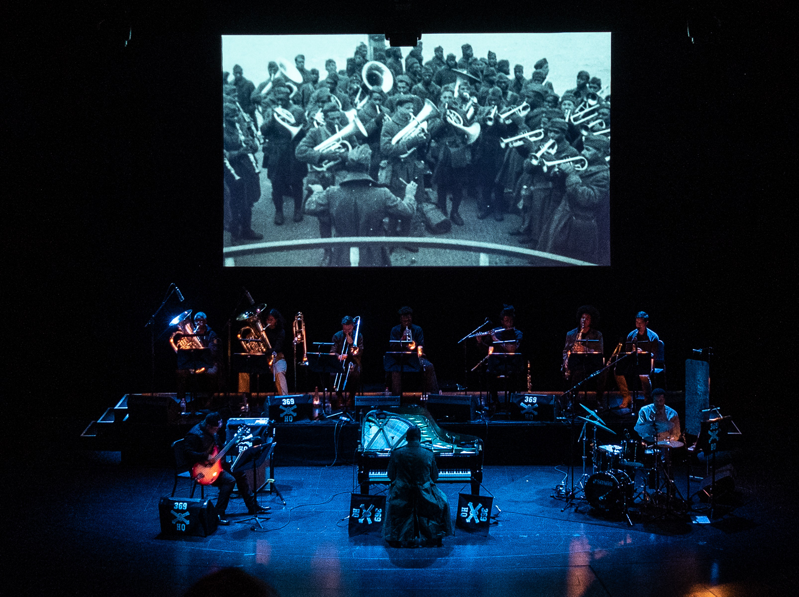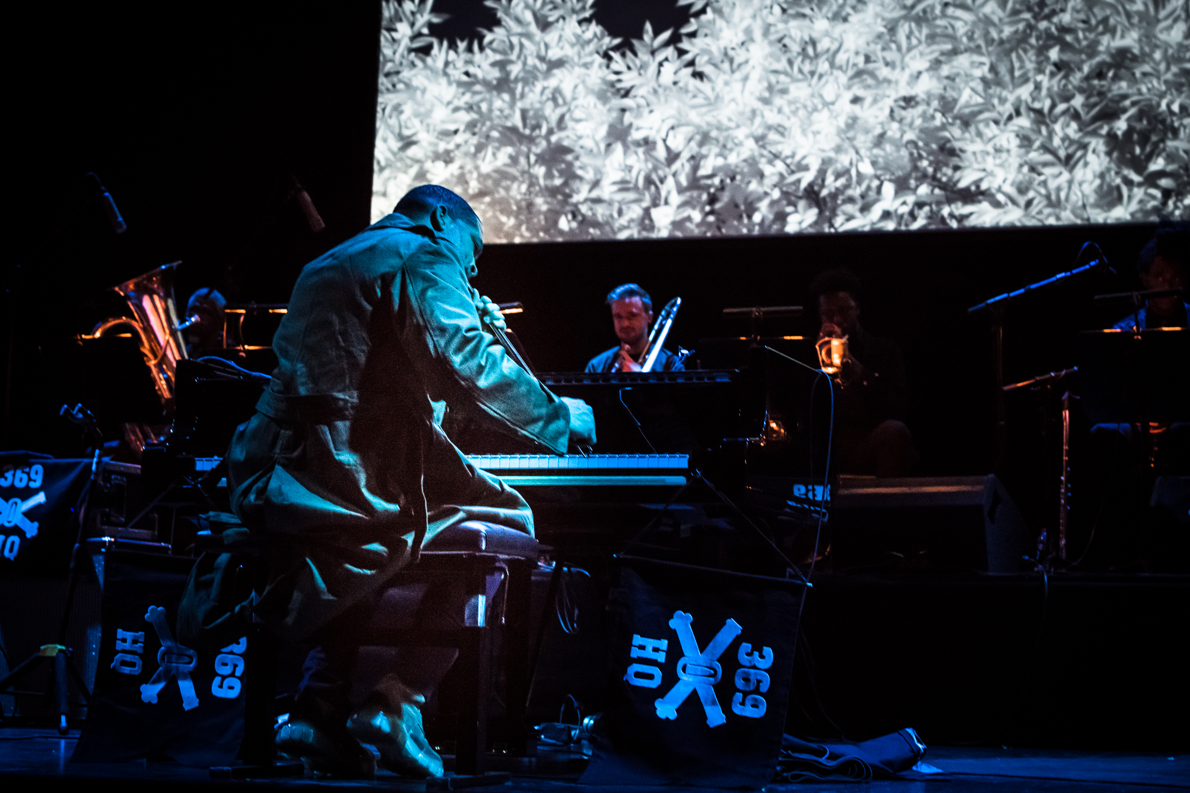 Der nächste „Star“ wartete schon mit Jason Moran am Bühnenran. Mit dem Projektnamen „James Reese Europe & the Absence of Ruin” erinnerte er an einen schwarzen Musiker, der im ersten Weltkrieg als Freiwilliger der USA in Europa als Soldat eingesetzt wurde und Musik mit seinen dann Harlem Hellfighters genannten Jungs spielte. Moran will die Erinnerung daran in die Gegenwart zurückholen. Der Auftritt ließe sich jetzt kleinlich im Ablauf beschreiben, von Herzschlägen, von Militär-Band-Klängen der Brass-section, deren Spektrum von Trauermusiken bis hin zu durchgedrehten Varietéstücken reicht, darin dann mal Subbass-Schwingungen zu elektronischen Klängen, markanten, knappen Piano-Soli. Es tauchen die Ghosts von Albert Ayler auf. Der Schlagzeuger rührt unermüdlich in der kochenden Ursuppe mit Spaß, mit Freude, mit Depressionen – eine dreckige-würzige Musik, dann eine fast ziemlich gerade, pure: New Orleans durch den Fleischwolf der Postmoderne gedreht. Und gegen Ende des Auftritts dann die Bilder auf der Leinwand mit schwarzen Soldaten der US-Army, die Bild für Bild aus der Vergessenheit treten und einen vorwurfslos anschauen, obwohl sie dazu genug Grund gehabt haben mögen dürften. Am Ende versammeln sich die Musikerinnen um den offenen Flügel aus dessen Mitte es rot leuchtet, während auf der Leinwand jemand vor einem Grab kniet. Das war alles beeindruckend und ohne Anflug von Wehleidigkeit.