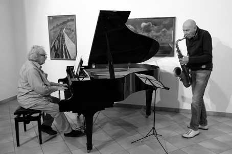 Pünktlich ging es dann los. Bis auf den letzten Platz ausverkauft, sehr intimer Rahmen im Konzertraum des Museums! Vor nunmehr 35 Jahren trafen van’t Hof und Sauer zum ersten Mal beim Jazzfestival in der Hamburger Fabrik aufeinander. Weitere zehn Jahre verstrichen bis die beiden wieder zusammen fanden, und nun musizieren sie in regelmäßigen Abständen, wenn die Termine passen. Ein Gipfeltreffen zweier Titanen, die traumwanderlisch zusammen musizieren, aufeinander hören, reagieren und improvisieren. Kraftvoll, ungezügelt und kompromisslos spielten die beiden eigene Kompositionen wie „The Preacher“, „Merel“ oder das beeindruckende Schlussstück „Peace“. Das Publikum erlebte pointierte, intensive Konversationen der beiden Ausnahmemusiker auf ihren Instrumenten. Auch ohne Synthesizer und Elektronik sorgte van’t Hof mal für verfremdete Klänge an seinem Piano, da wurden dann einfach die Noten auf die Saiten gelegt, und schon saß van’t Hof wieder der spielerische der Schalk im Nacken, während Heinz Sauer kraftvoll in sein Horn blies. Erdige Klänge bestimmten den Sound. Das macht dieses Duo aus: straight im Spiel, immer humorvoll, niemals dogmatisch.