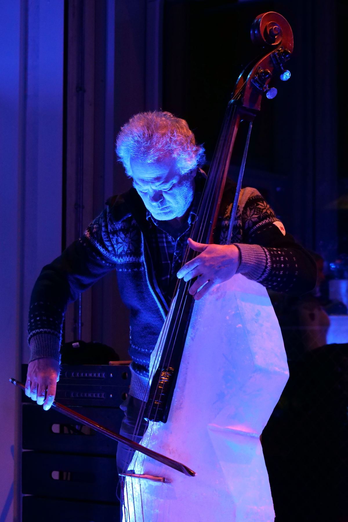 Am zweiten Abend von Isungsets „Ice Music“ trat er gemeinsam auf mit Arve Hendriksen an der Trompete, verschiedenen Eis-Hörnern & Gesang, Anders Jormin mit einem Eis-Bass (!), der Sängerin & Soundtüftlerin Maria Skranes und – last not least – unterstützt von Ina Charlotte Mo (Eis-Assistenz), sowie Isungsets langjährigem Sounddesigner Asle Karstad. Eigentlich sollte auch dieses Konzert Open Air auf dem Rooftop München Hoch5 stattfinden, auf dem parallel auch eine eindrucksvolle Eis-Foto-Szenografie des Schweizer Künstlers Eric Mutel zu sehen war, musste dann aber witterungsbedingt in den Dachsaal des Gebäudes verlegt werden. Nichtdestotrotz eine eindrucksvolle Performance, die Terje Isungset mit seinen Begleitern dort aufführte.