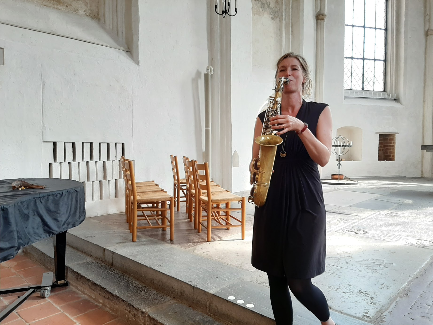 Tief berührend auf ganz eigene Art war ein Solo-Auftritt der deutschen Saxophonistin Nicole Johänntgen zu früher Morgenstunde in der alten Klosterkirche. Nicole Johänntgen schritt mit dem unverstärkten Altsaxophon, während sie spielte, das Kirchenschiff ab, durch die Publikumsblöcke hindurch, und schickte zunächst ganz langsame Töne behutsam in den Raum. Dann wieder blies sie Arpeggien und nutzte dabei die rund 6 Sekunden Nachhall der Kirche für reizvolle Überlagerungen, so dass man Akkorde zu hören glaubte, oder schwenkte das Saxophon nach links und nach rechts, um die Töne wie einen klingenden Schweif durch den Raum zu ziehen. Geradezu umhüllt von Klang wurde man nach und nach in dem sakralen Raum durch nur ein einziges Instrument. Der Raum wurde zu Musik, die Musik zu Raum. Auf zarte Art spirituell war dieses Hör-Erlebnis dabei, das begeisterte – oder besser: beseelte – Zuhörer hinterließ und heutiger Betriebsamkeit etwas auf ganz leise Art Existenzielles entgegensetzte. Auch das einer der Momente, die man nie wieder vergisst. Und einer der bewegendsten.