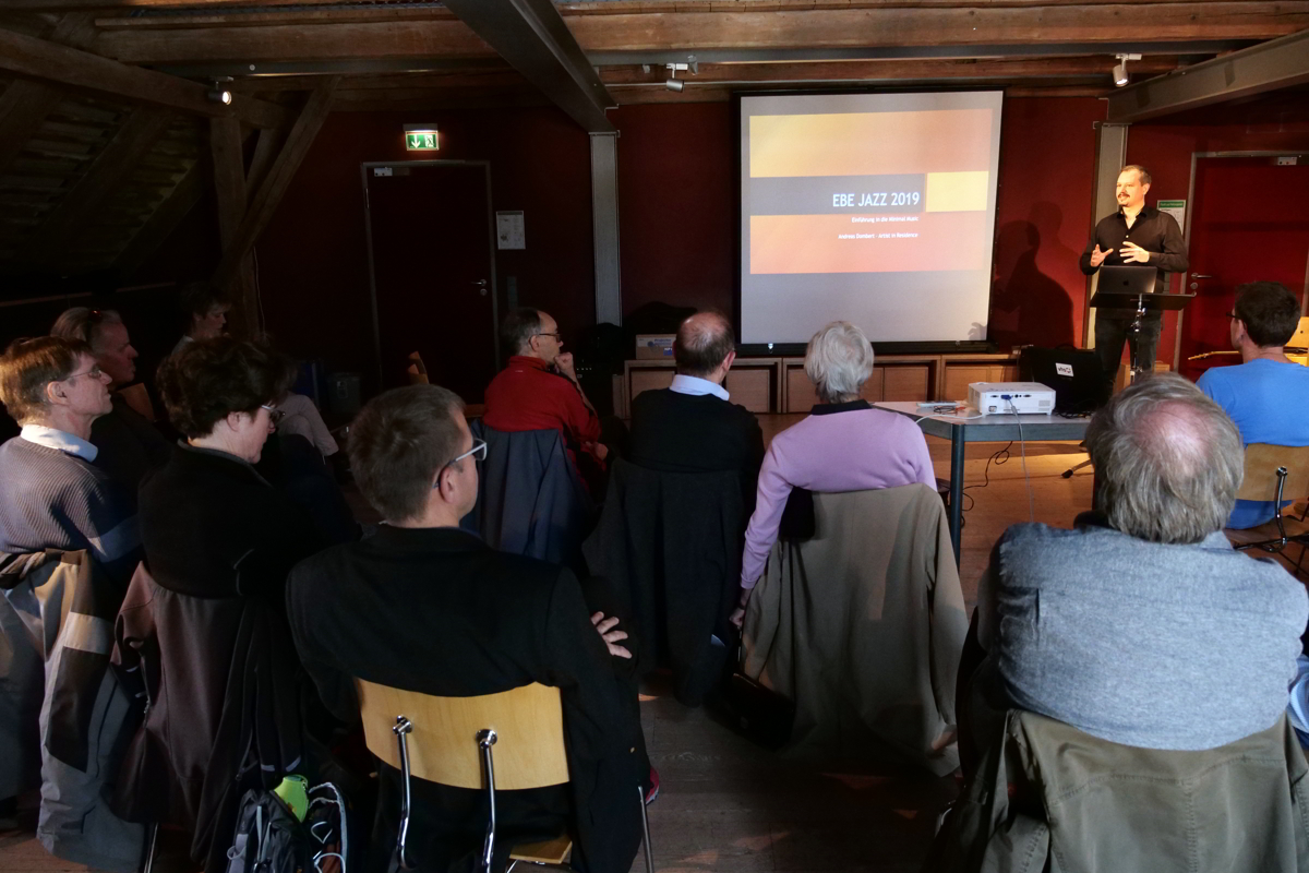 Für die Konzentration auf’s Wesentliche und vor allem auch die Lachmuskeln sorgte der Kabarettist Piet Klocke, mit Unterstützung von Nicole Johänntgen am Saxophon. Die Weiterbildung förderte der Gitarrist Andreas Dombert als Artist in Residence mit einem Konzert und „Jazz Talk“ über Minimal Music, sowie einem profunden Workshop für Jazzgitarre.