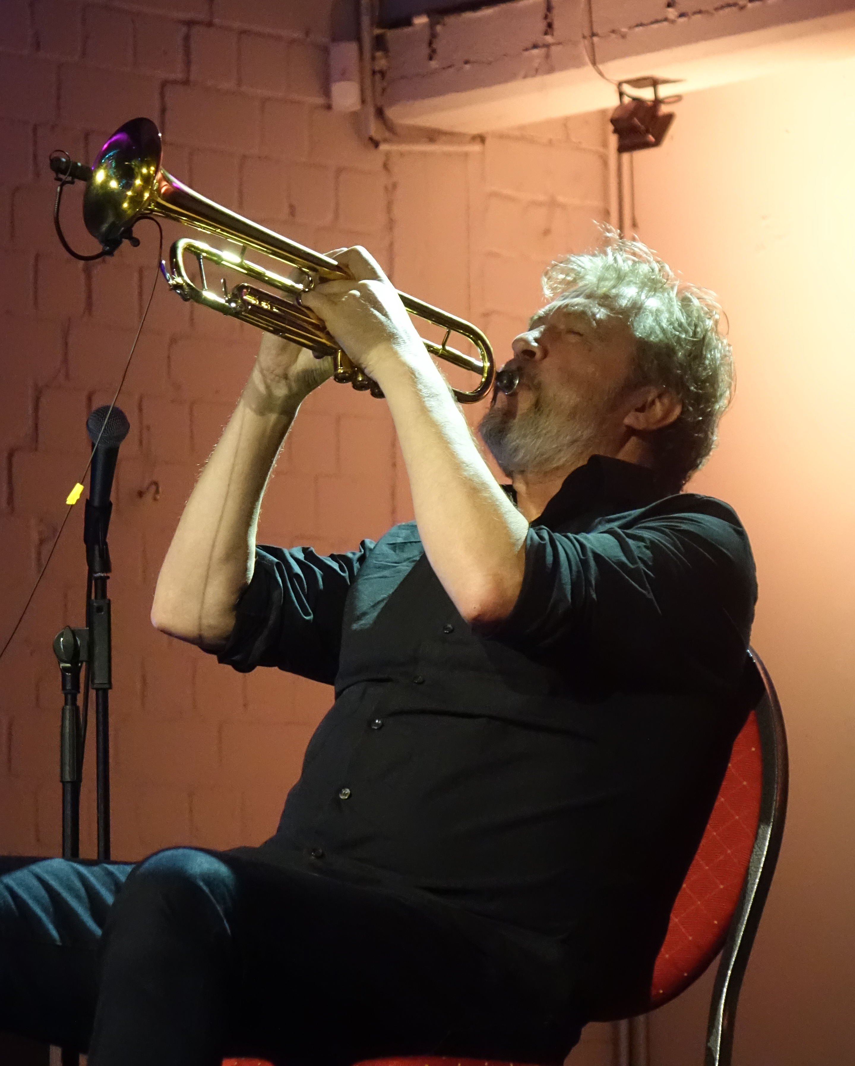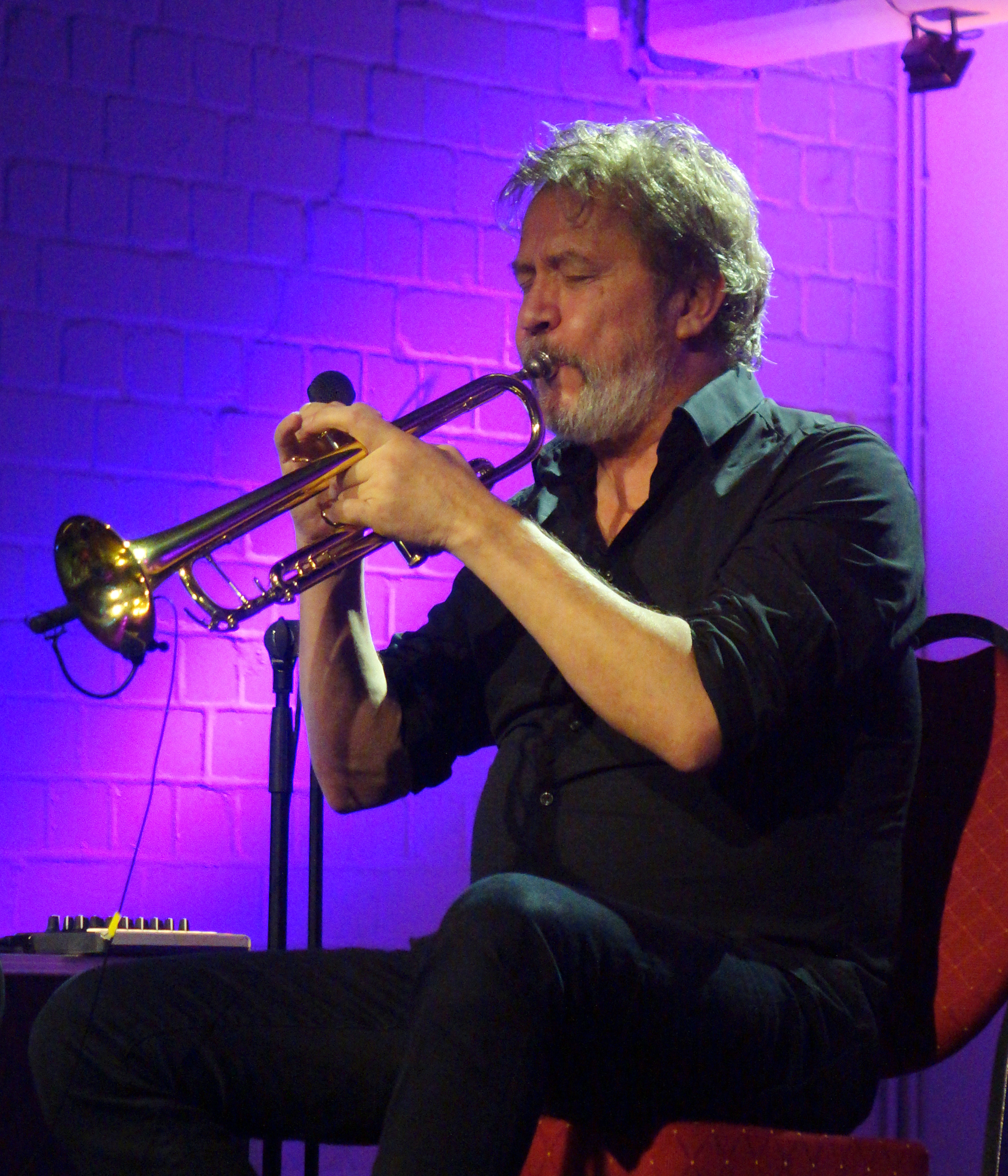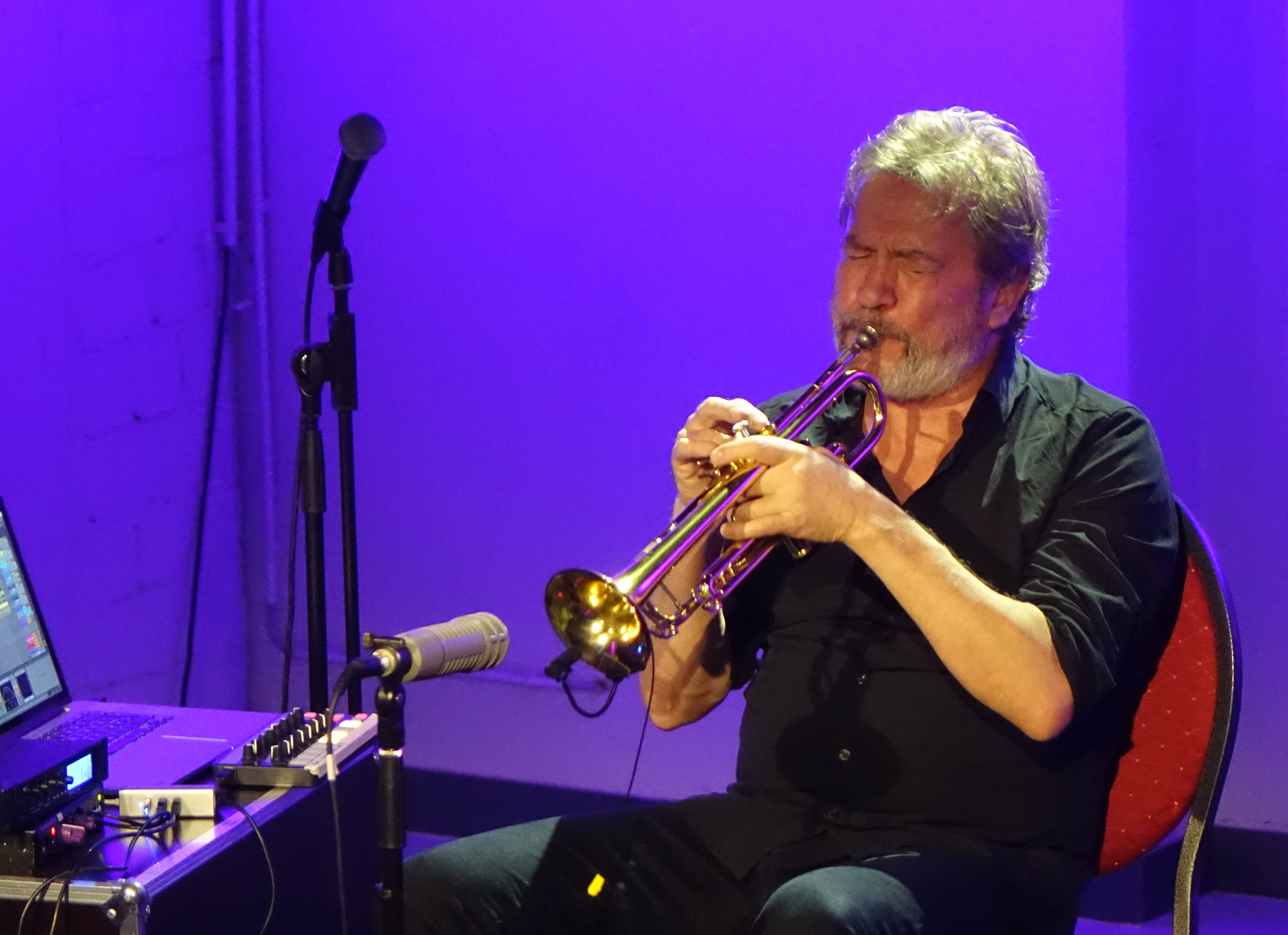 Molvaer schöpft aus all dem eine mächtige, eigene Diktion und rückt den etwa 250 auch teilweise von weither angereisten musikbegeisterten Menschen in der weitläufigen Industriehalle betörend nah. Oft mit einer Hand am Laptop bzw. einem kleinen Mischpult, bedient er simultan zur Trompete seine virtuelle „Band“. Imaginäre Chöre kommen aus der Ferne. Dumpfe, gedämpfte Minimal-Techno-Beats erzeugen diese nervös-unnahbare Aura, als würde man draußen vorm Berghain stehen. Stimmen-Samples durchdringen verhallte Galaxien. Die Landschaften, in denen sich Molvaers Trompetenspiel auf eine Art Suche begibt, sind weit und unvorhersehbar. Seine „Stimme“ auf dem Horn ist voller kühler, sphärischer Strahlkraft und doch auch zerbrechlich-einsam zugleich. Manchmal „singt“ sein Trompetenton in einer Art Unisono. Nie einen Ton zu viel offenbaren die pentatonischen oder modalen Tonfolgen, die er in seinem frei atmenden Spiel bevorzugt.