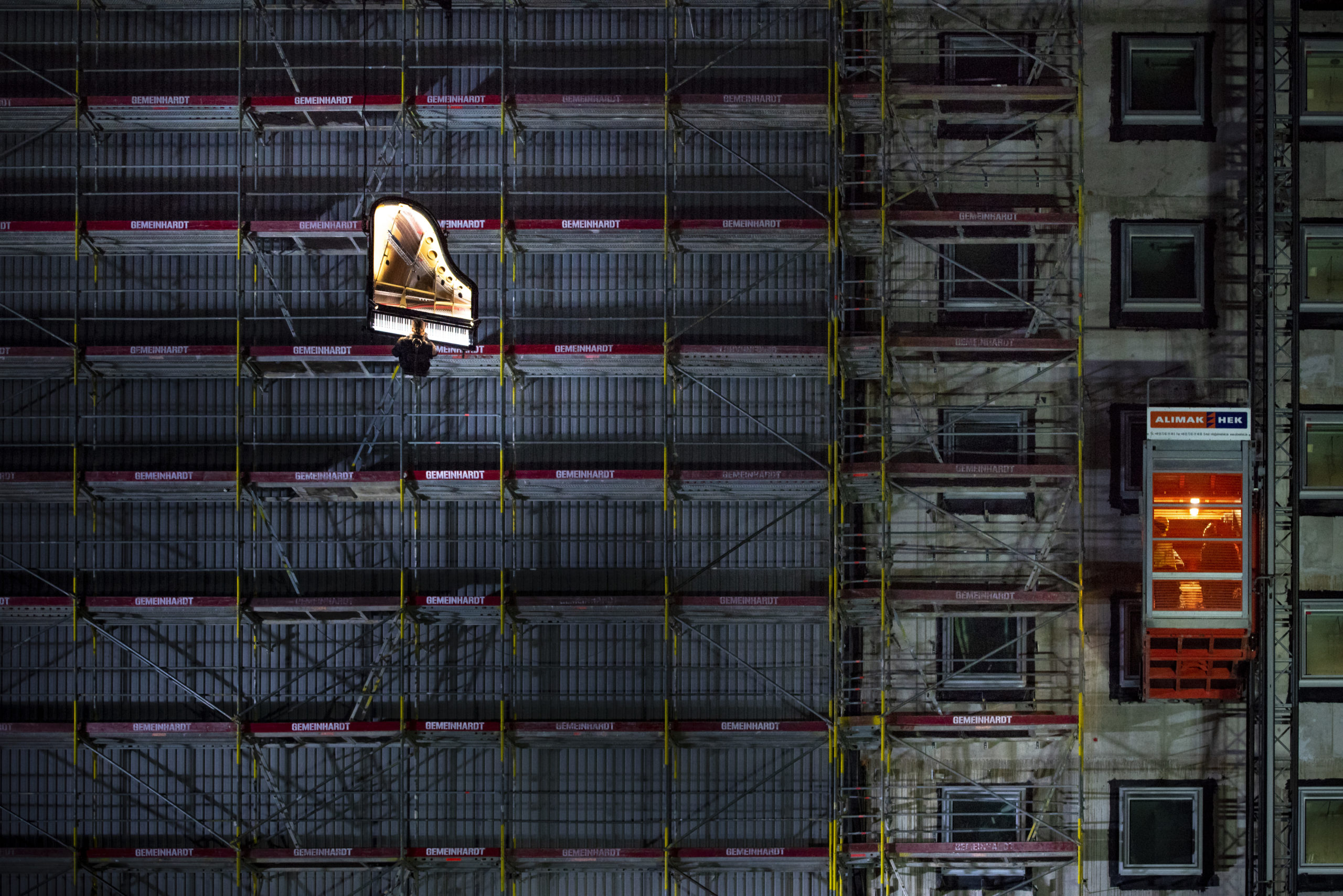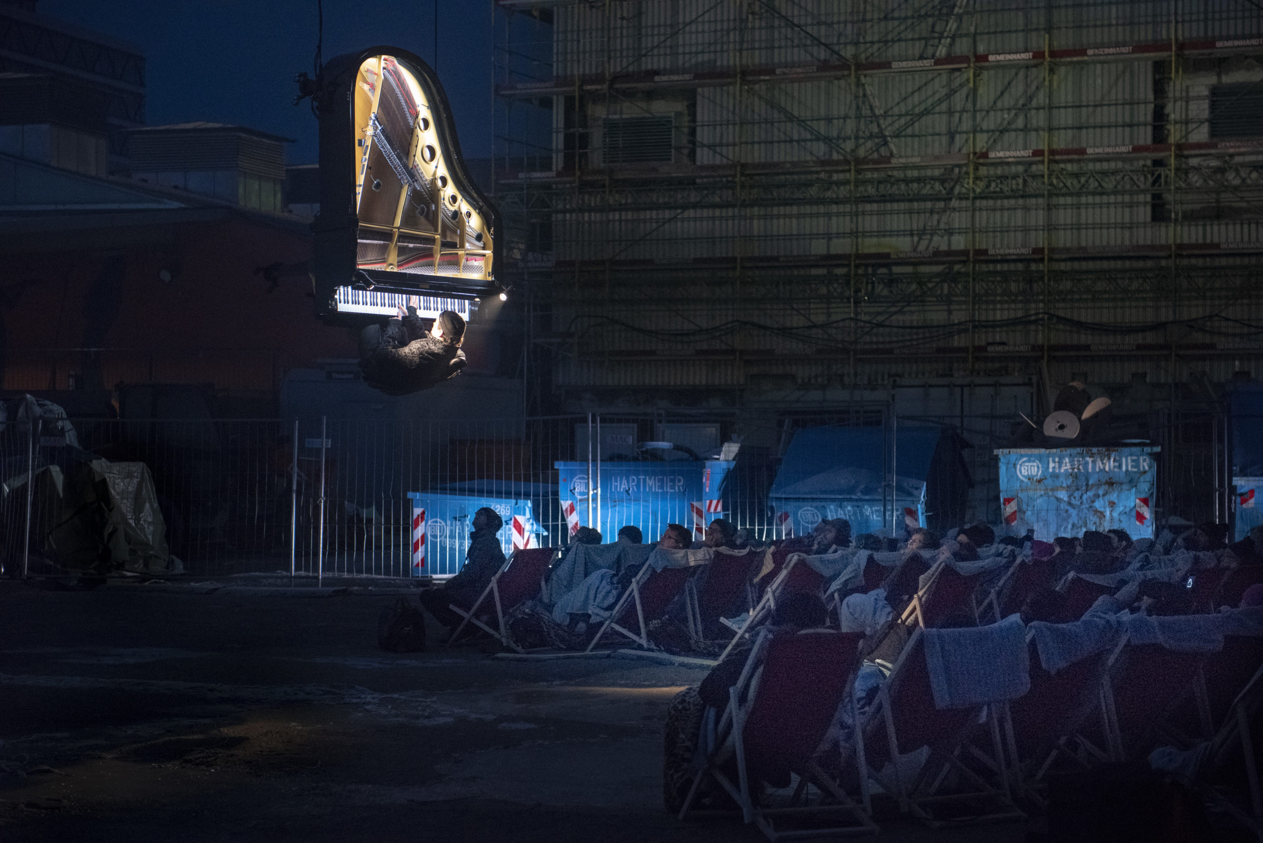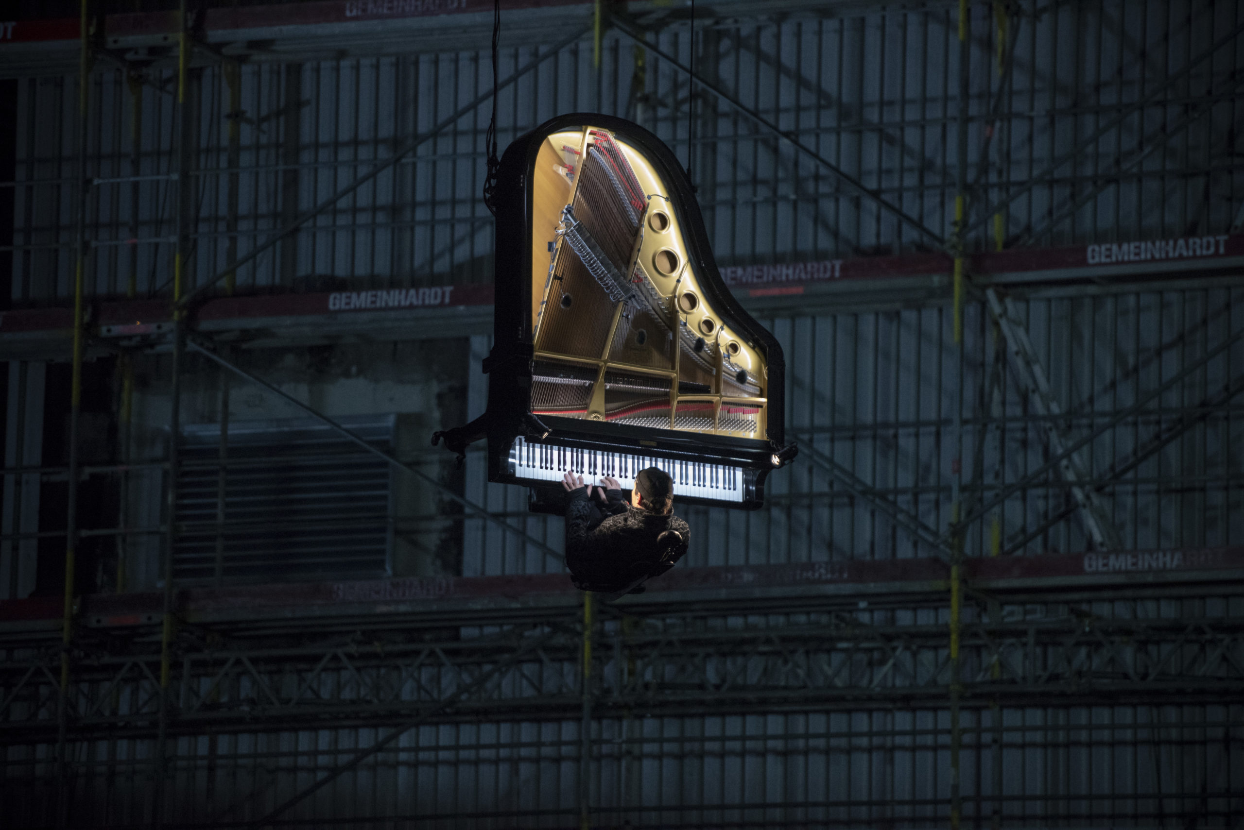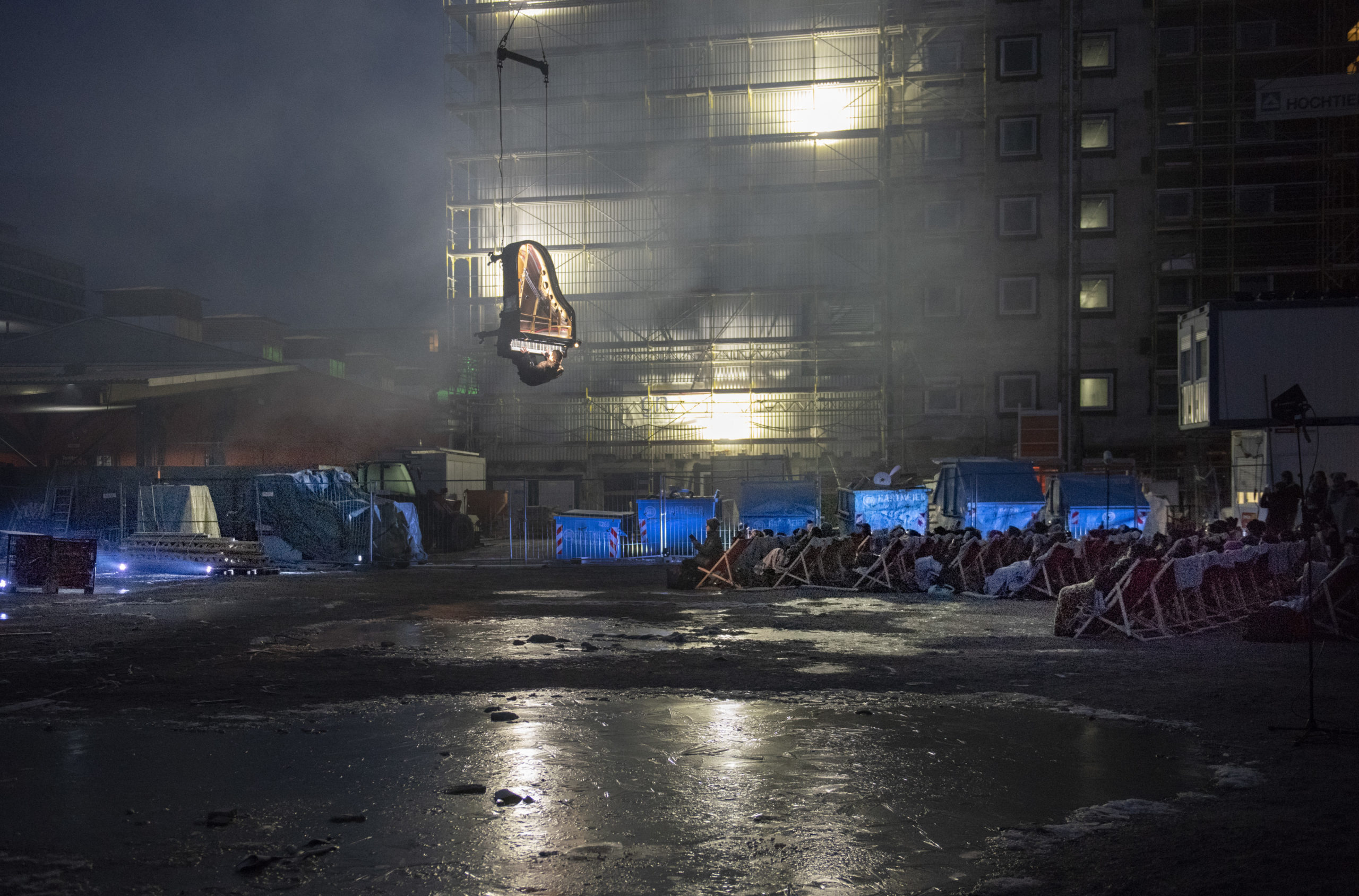 Der Veranstalter whiteBOX geht im neuen Jahr nicht nur mit Eismusik aufs Dach oder mit Musik unter Wasser, sondern traut sich mit „Piano vertical“ in schwindelnde Höhen. Die Produktion des Schweizer Pianisten und Komponisten Alain Roche ist atemberaubender Stunt, urbane Poesie und technologisches Meisterstück in einem. Dieses Wochenende war es so weit: „Piano vertical – Chantier“ fand am 24., 25. und 26. Januar 2020 jeweils bei Tagesanbruch kurz vor 7.00 Uhr morgens auf dem Grundstück des zukünftigen Konzerthauses statt. Alain Roche hing dabei mit seinem eigens dafür konstruierten Konzertflügel in großer Höhe am Ausleger eines Baukrans und gab ein etwa 45-minütiges Konzert. Die Fotografin Susanne van Loon hielt die faszinierende Choreographie von Flügel, Pianist und Baustelle für die Jazzzeitung fest.
