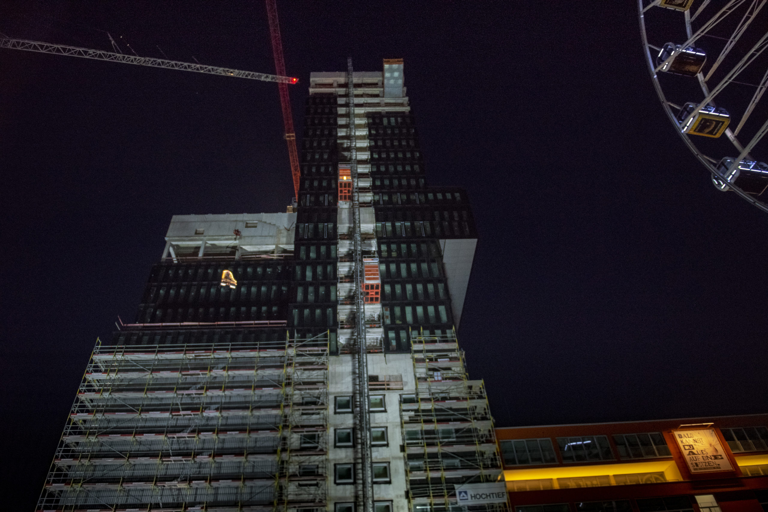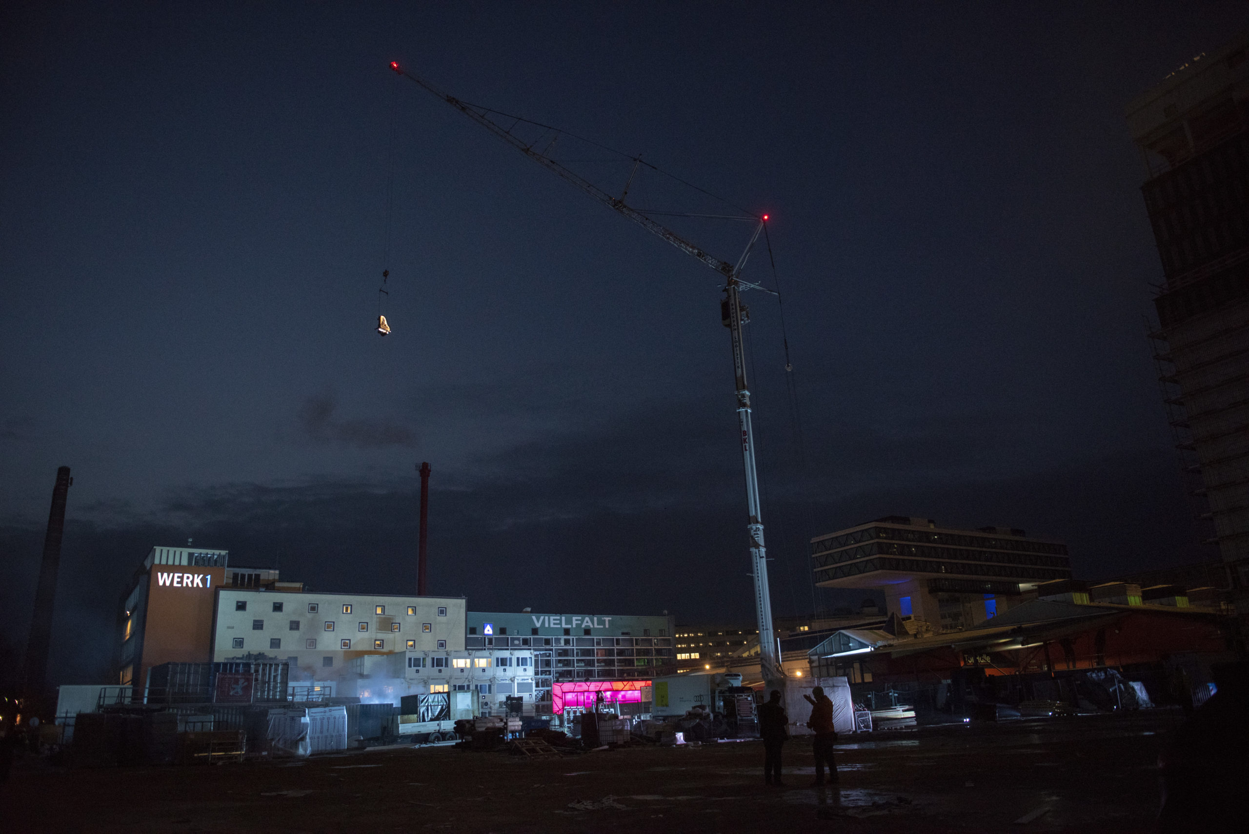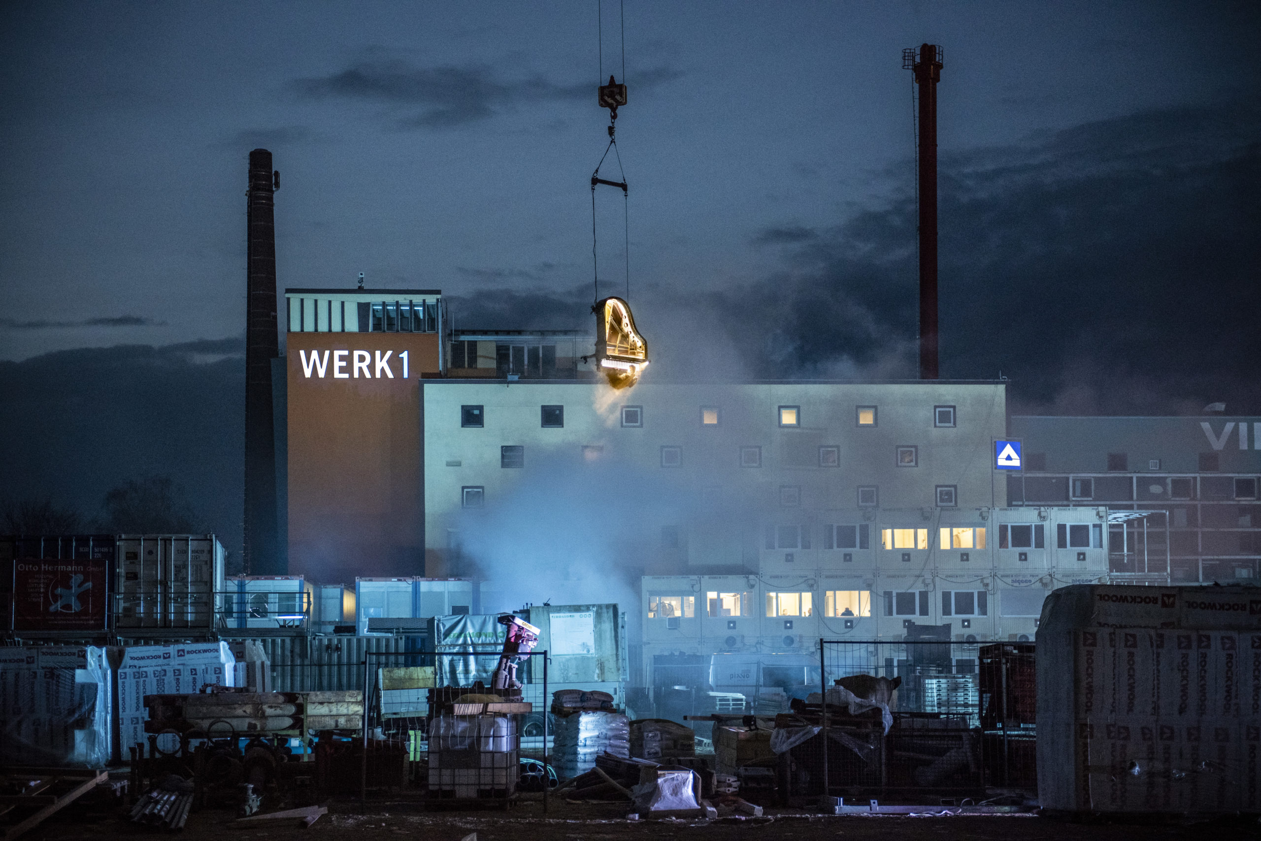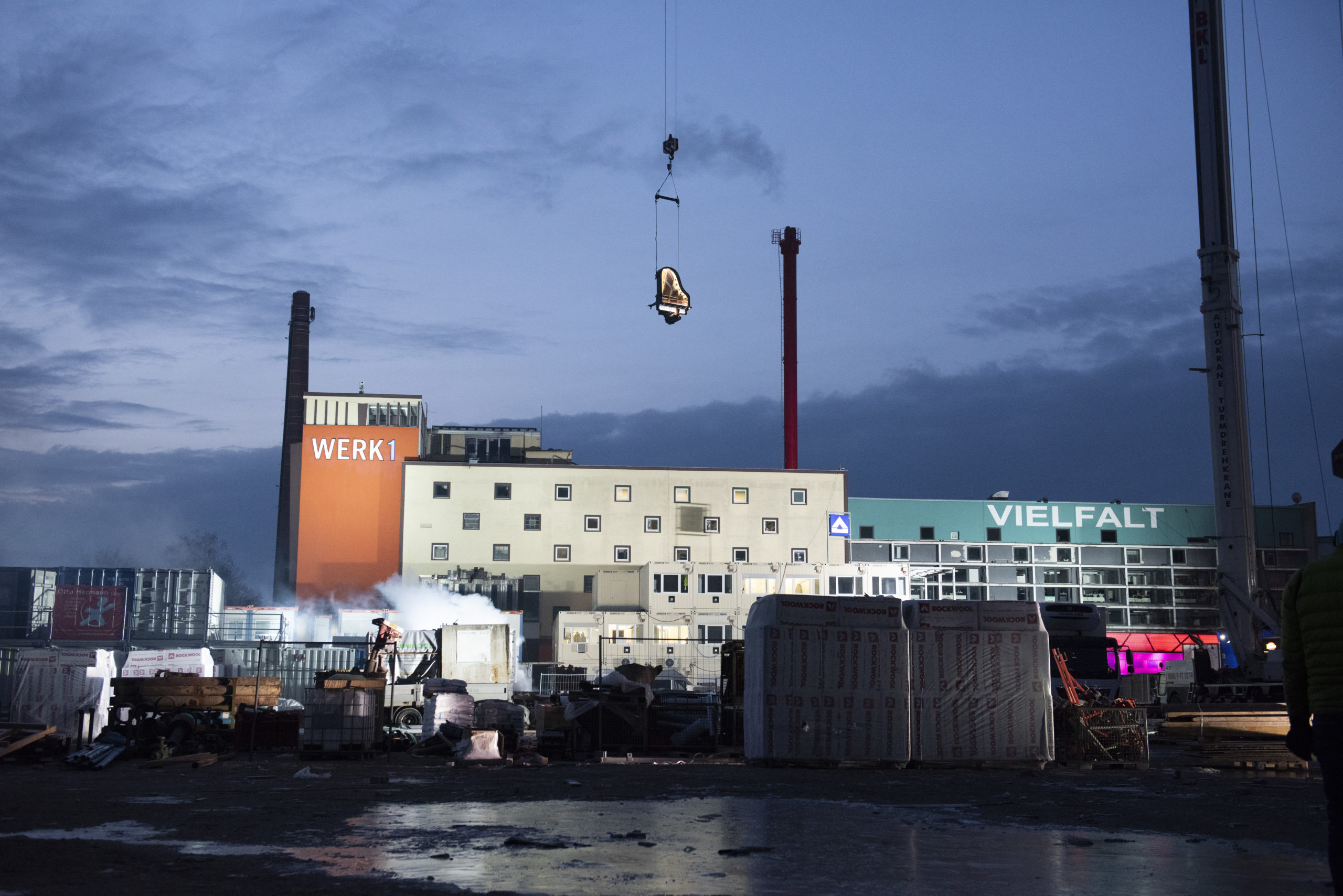 Der Veranstalter whiteBOX geht im neuen Jahr nicht nur mit Eismusik aufs Dach oder mit Musik unter Wasser, sondern traut sich mit „Piano vertical“ in schwindelnde Höhen. Die Produktion des Schweizer Pianisten und Komponisten Alain Roche ist atemberaubender Stunt, urbane Poesie und technologisches Meisterstück in einem. Dieses Wochenende war es so weit: „Piano vertical – Chantier“ fand am 24., 25. und 26. Januar 2020 jeweils bei Tagesanbruch kurz vor 7.00 Uhr morgens auf dem Grundstück des zukünftigen Konzerthauses statt. Alain Roche hing dabei mit seinem eigens dafür konstruierten Konzertflügel in großer Höhe am Ausleger eines Baukrans und gab ein etwa 45-minütiges Konzert. Die Fotografin Susanne van Loon hielt die faszinierende Choreographie von Flügel, Pianist und Baustelle für die Jazzzeitung fest.
