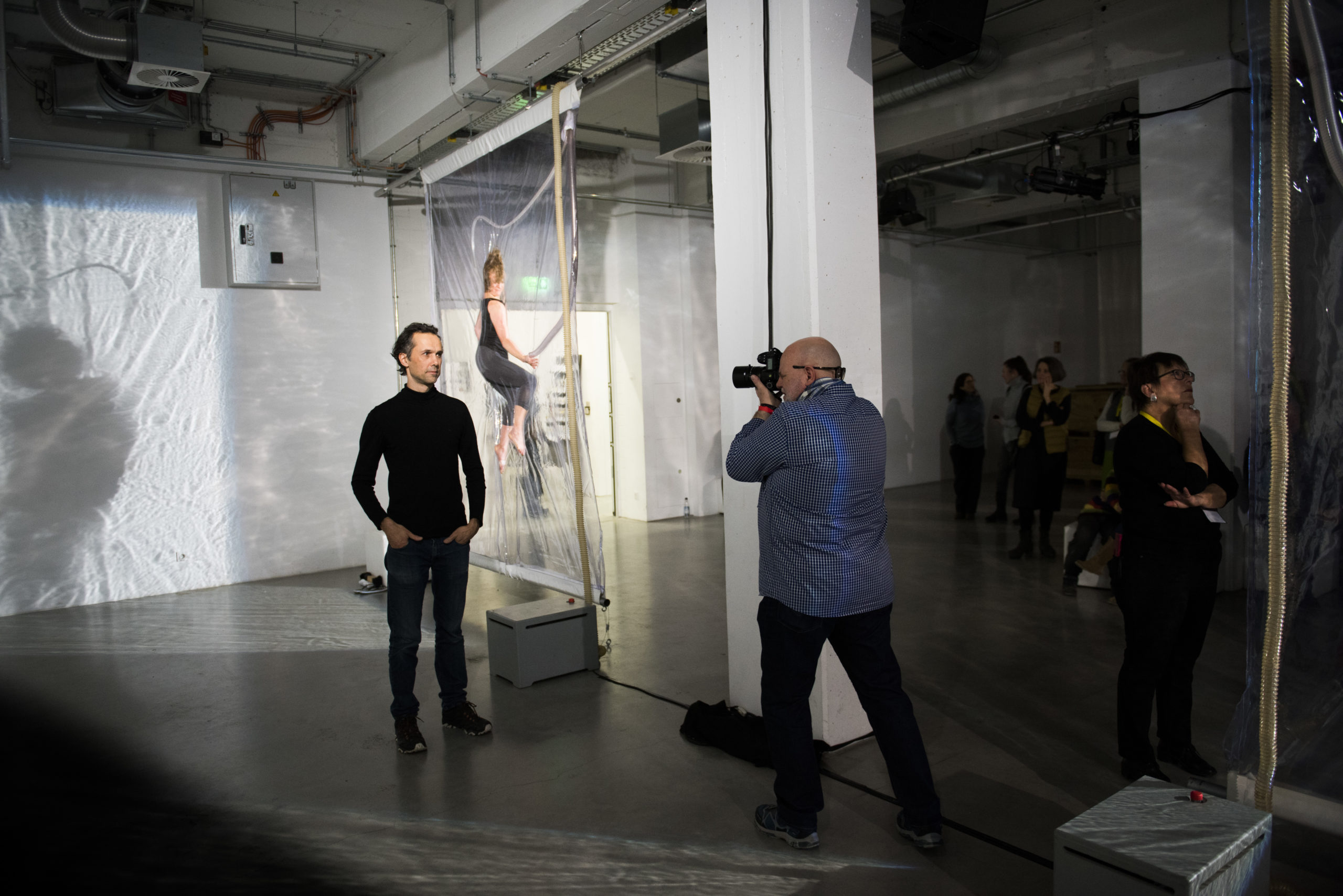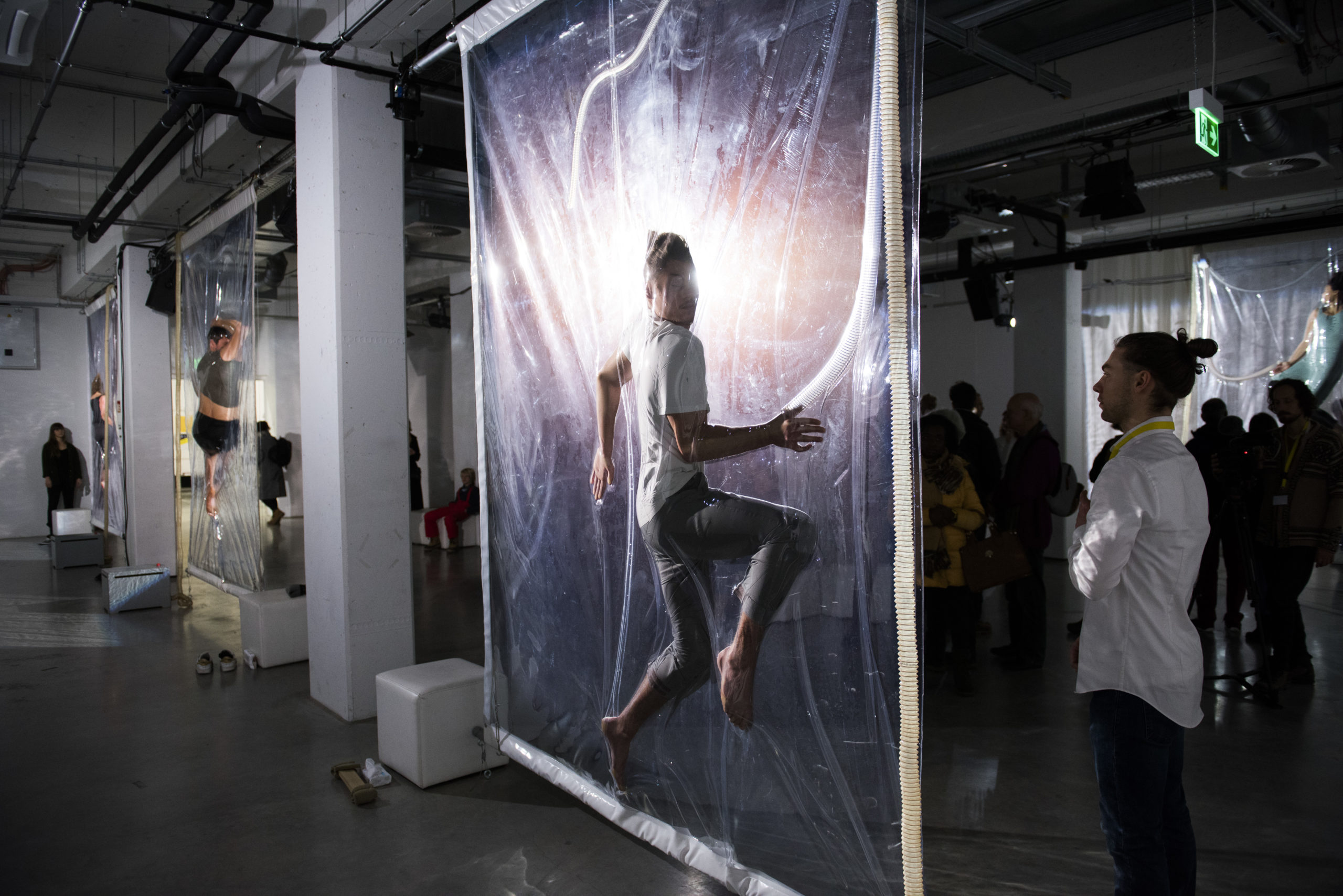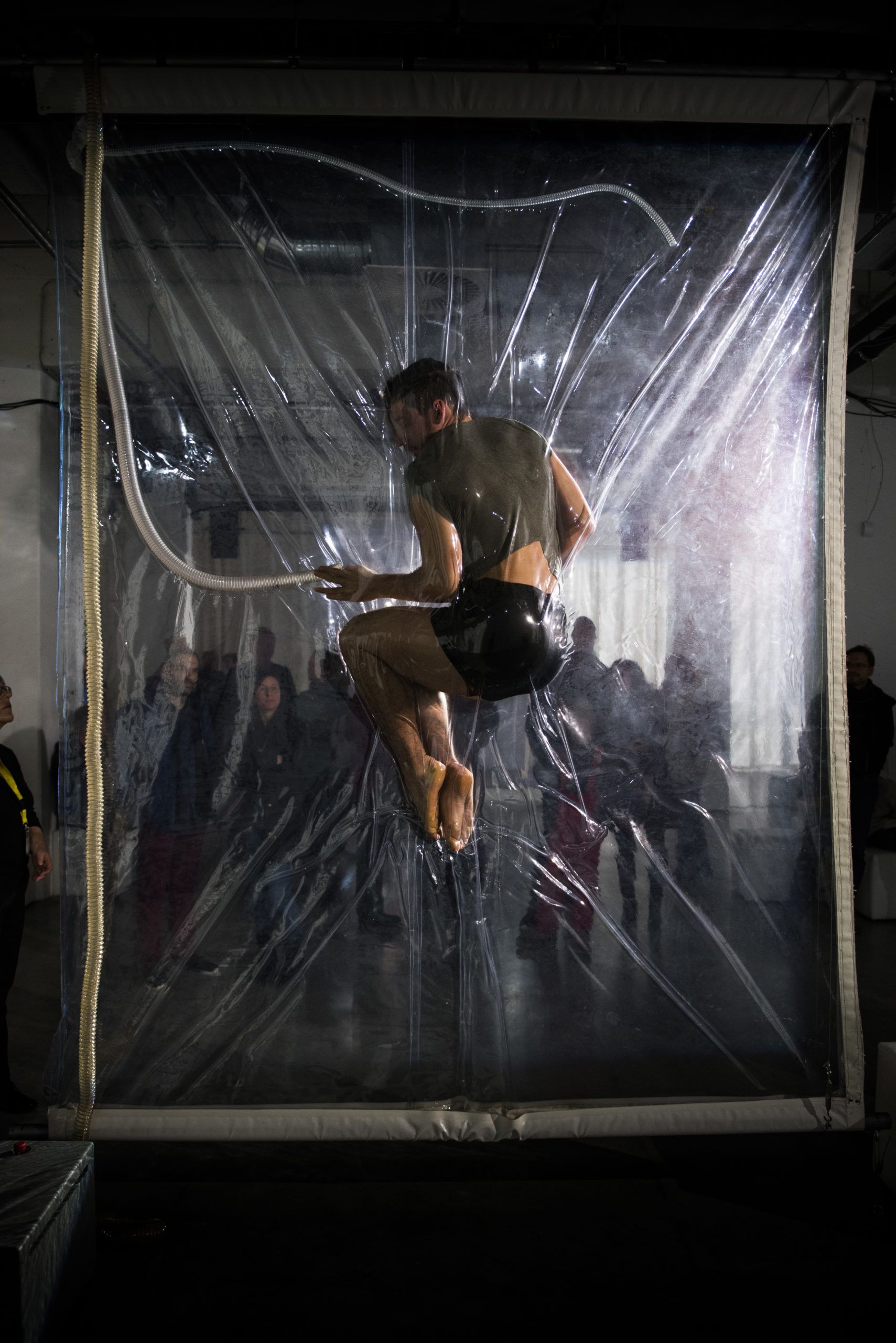 Bei der Installation SHRINK von Lawrence Malstaf in der Galerie Whitebox im Münchner Werksviertel werden die Performer zwischen zwei Lagen von Folie vakuumisiert. Sie regulieren ihre Luftzufuhr über einen Schlauch und werden zu atemberaubenden Skulpturen.