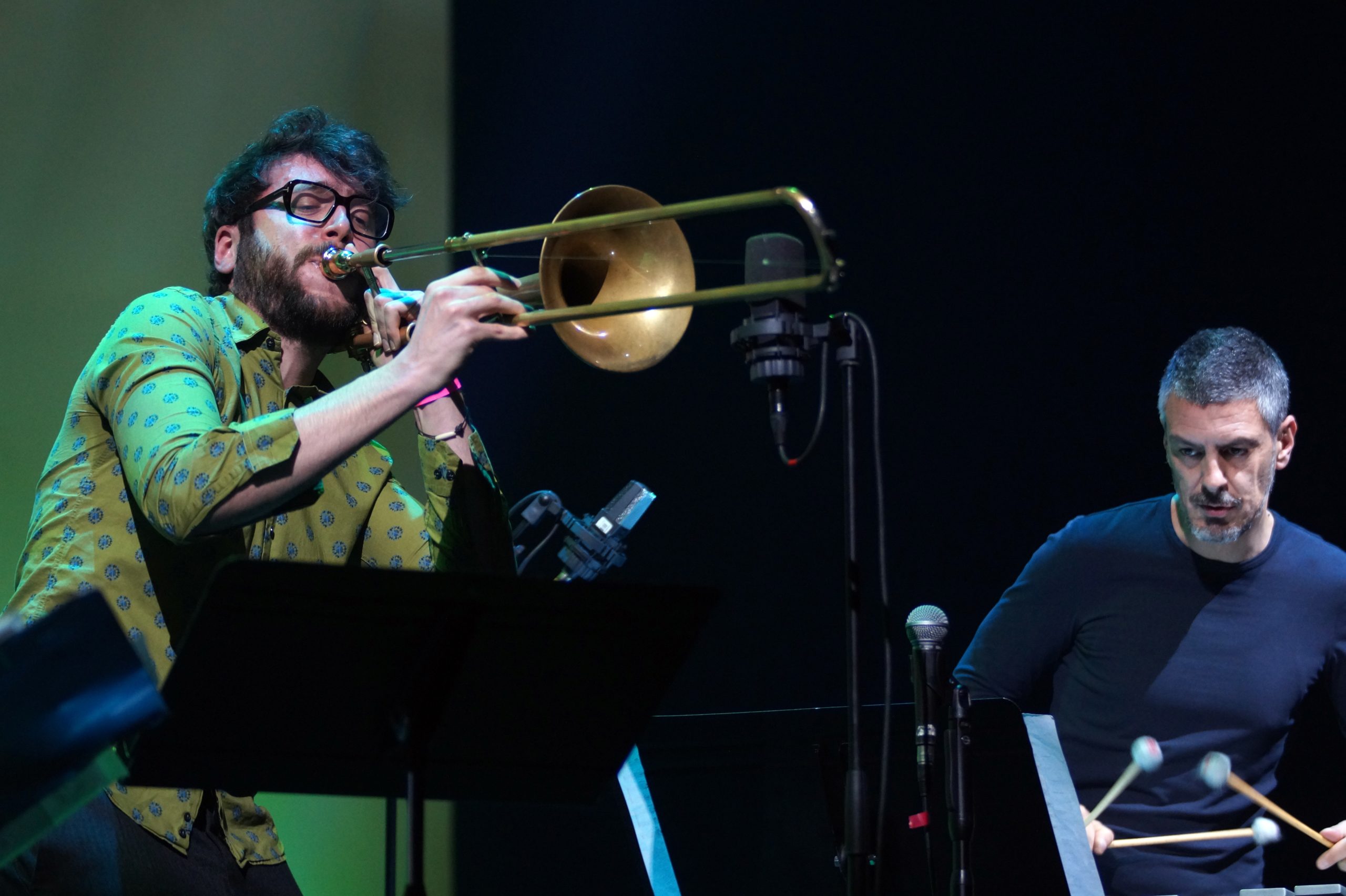 Nach so viel musikalischer Grundlagenforschung durfte dann die Seele gestreichelt werden: Hierfür traf die französische Trompeterin Arielle Besson auf den Akkordeonspieler Lionel Suarez. Die Folge sind herrlich geschmeidige Unisono-Linien zwischen Trompete und Akkordeon, ebenso eine lyrische Melange aus imaginärer Folklore und viel balladesk-getragener, gerne auch verspielter, balladesk-eleganter Kommunikation. Faszinierend, wie plastisch Lionel Suarez Melodie und Bassstimme differenziert. Oft wirkt es, als würden zwei verschiedene Instrumente auf der Bühne stehen. Ganz groß ist, wie Arielle Besson ihr Horn zu einer berührenden Singstimme werden lässt. Aber viele hätten sich auf dieser beseelten Grundlage auch mal so manchen freigeistiger improvisierten Exkurs gewünscht. Auf jeden Fall strahlte aus dieser Kommunikation viel Nahes, Menschliches, Inniges.