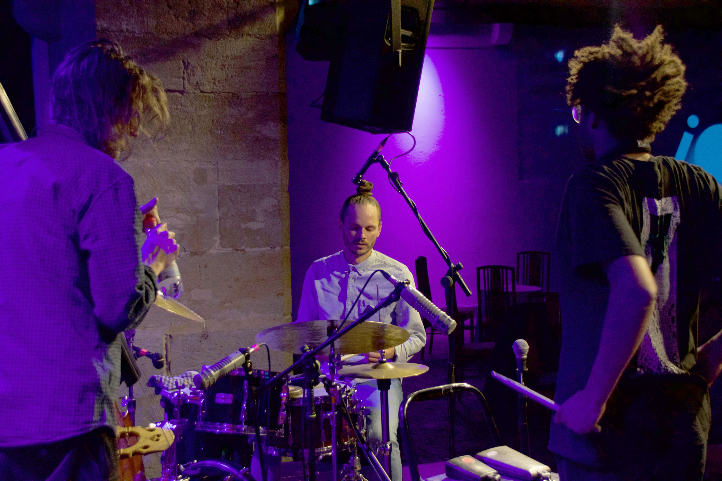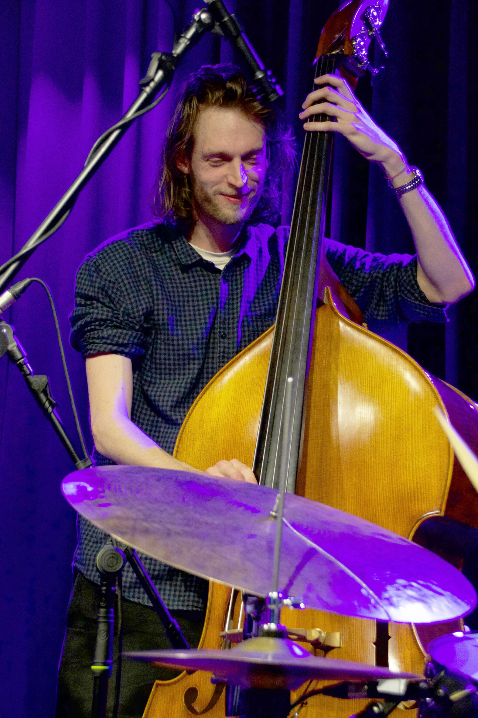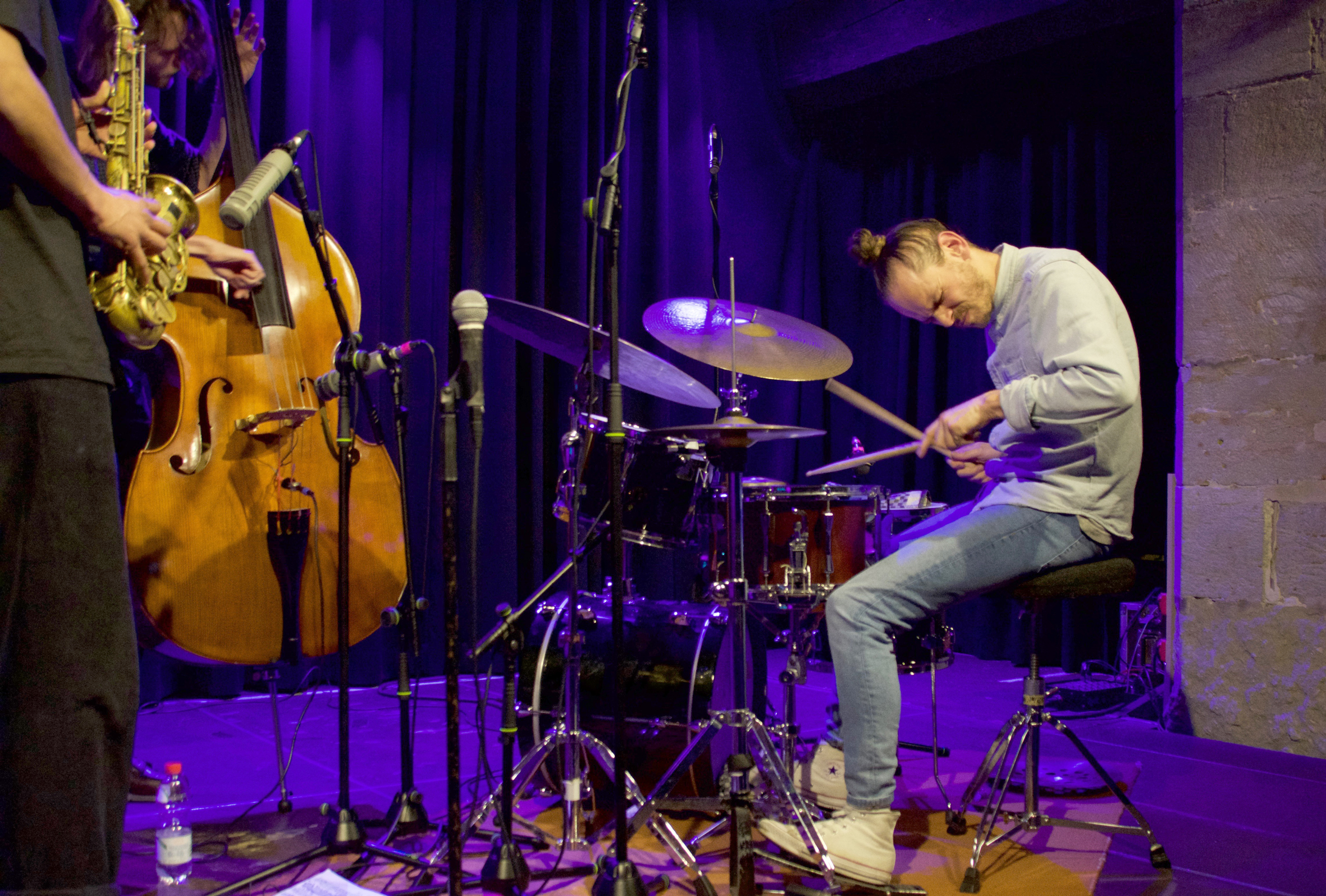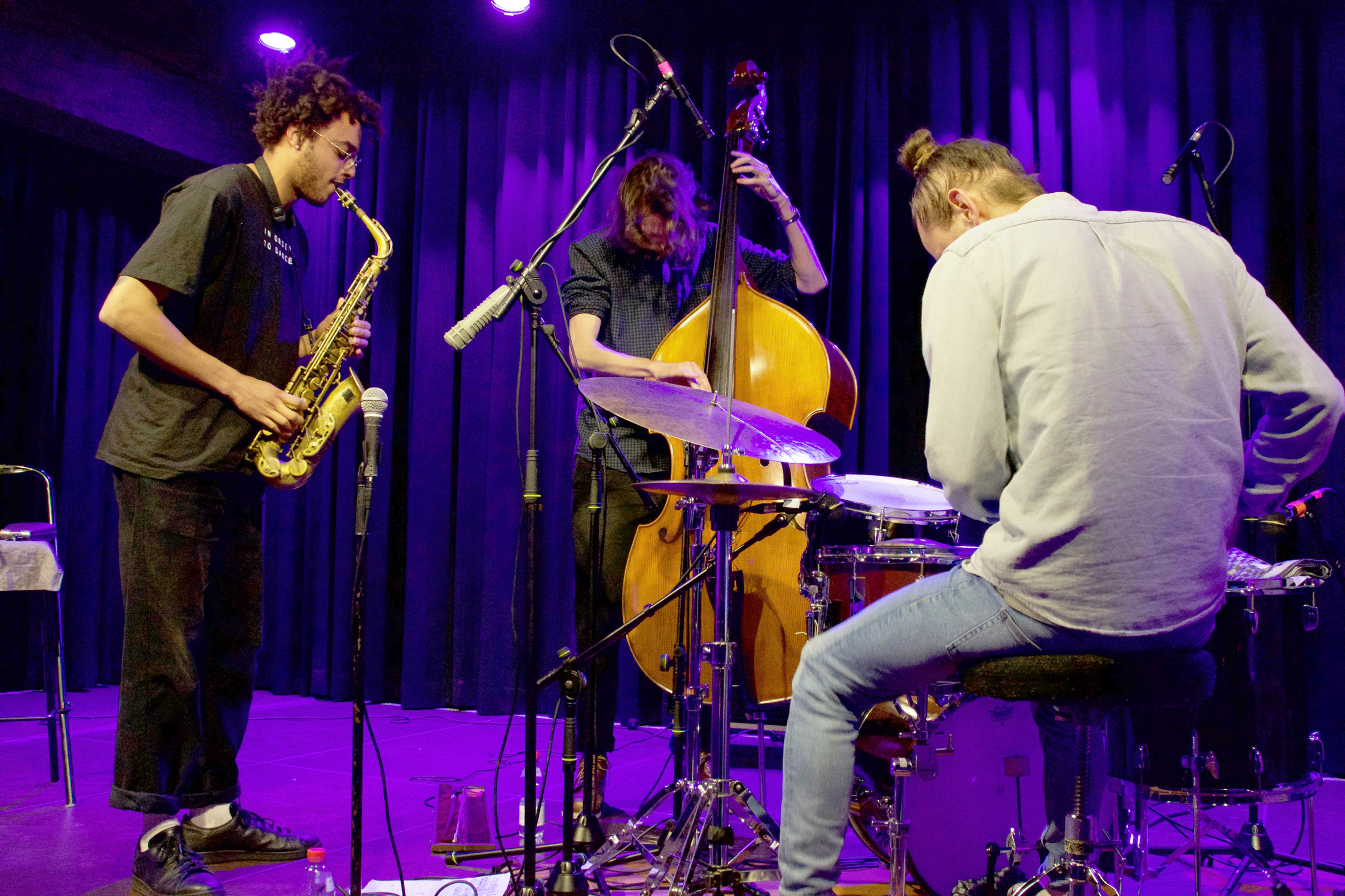Leichte Kost war es keine, die das Trio mit dem seltsamen, frei erfundenen Namen bei seinem Jazzclub-Debüt bot. Schon die Aufstellung der Musiker auf der Bühne unterschied sich formal deutlich vom üblichen Schema. Statt etwas weiter hinten, saß der Schlagzeuger nahe am Bühnenrand, mit dem Rücken halb zum Publikum gewandt. Jeger und Svosve standen ihm gegenüber und bildeten zusammen mit Glanzmann einen Kreis. Das ermöglichte den Dreien ohne zusätzliche Monitore, ganz genau auf die jeweils anderen zu hören und zu reagieren. Diese musikalisch sensible Interaktion, der ganz bewusst auch eine soziale Komponente zugrundeliegt, bestimmte den hochenergetischen Auftritt.