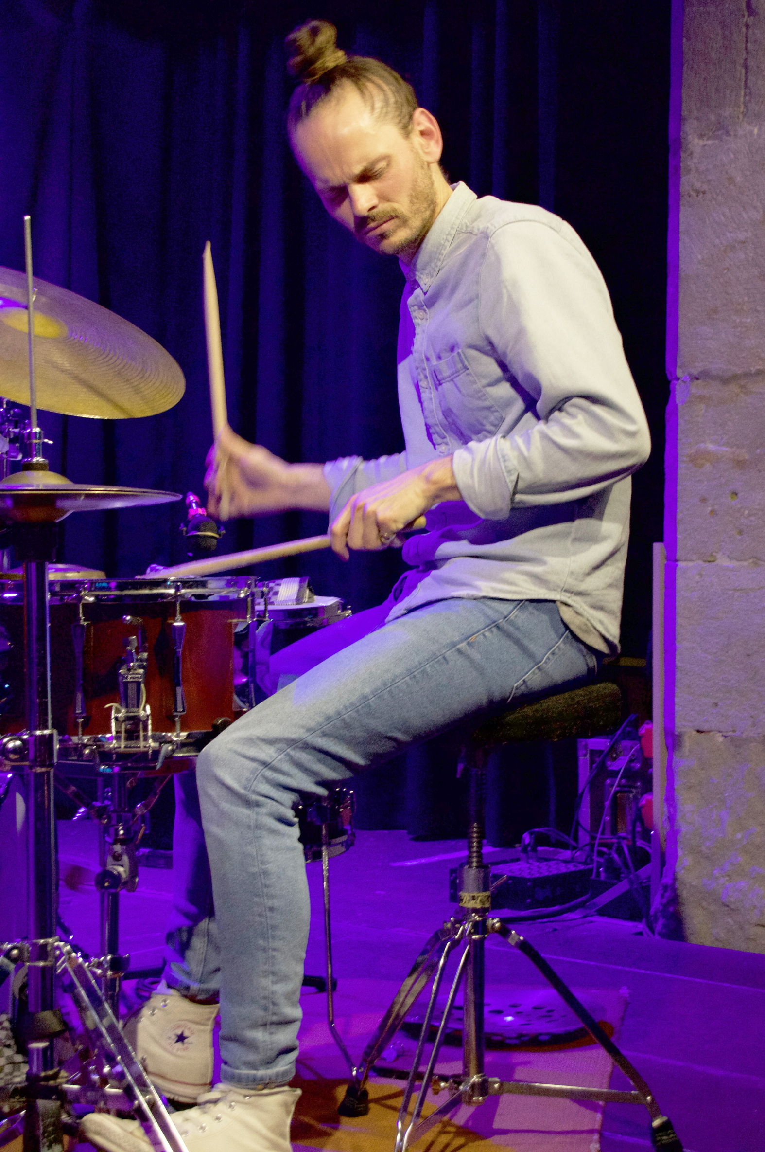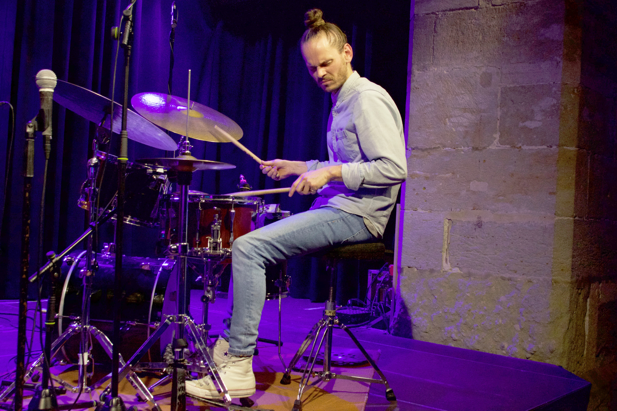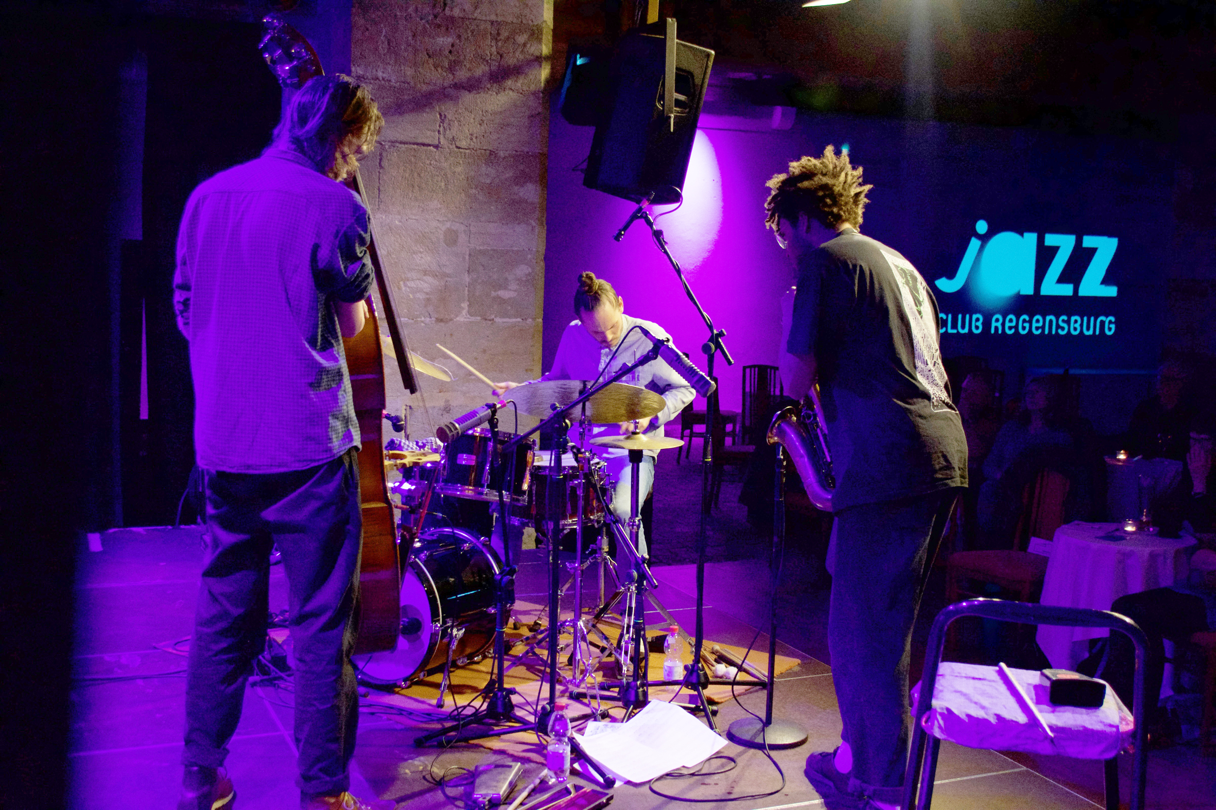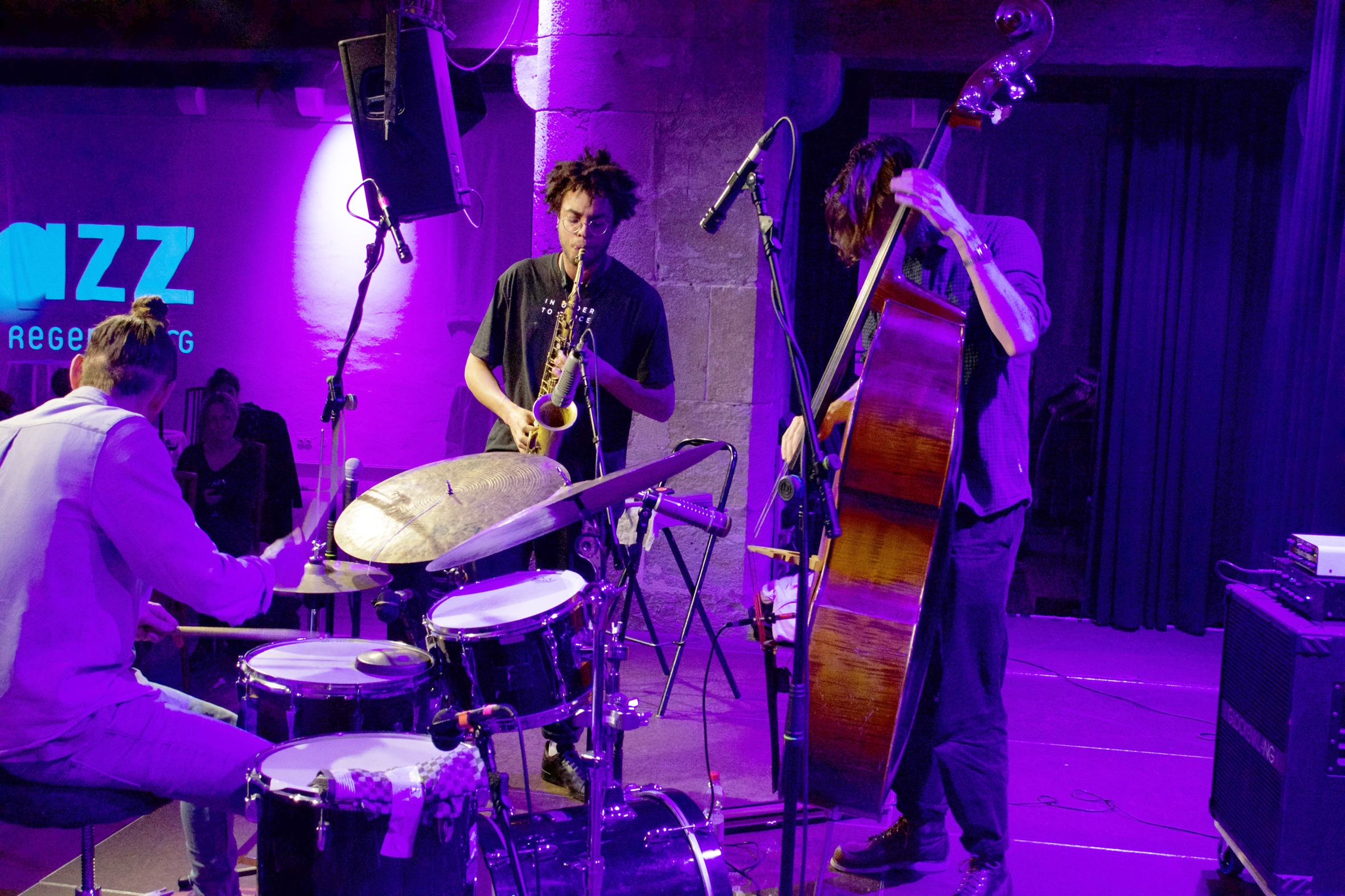 „Normalerweise spielen wir keine Zugaben“, zeigte sich Vincent Glanzmann verblüfft über den anhaltenden Beifall nach dem Konzert mit seinem Trio Uassyn im Leeren Beutel. „Bei uns klatschen die Zuhörer sonst nicht so viel“, grinste er sichtlich angetan. „Jetzt wissen wir gar nicht …“, überlegte er kurz, „aber uns fällt schon etwas ein, was wir machen können“, und setzte sich wieder auf den Hocker hinterm Schlagzeug. Nach einigen Blicken, mit denen er sich mit seinen Mitmusikern Silvan Jeger am Bass und Tapiwa Svosve am Altsaxofon verständigte, legten die drei mit rhythmischer Prägnanz und vibrierender Energie los. Nur wenige Minuten, dann war der kurze, dichte Ausbruch freier Improvisation vorbei. Das Publikum, zahlenmäßig durchaus überschaubar, zeigte den Schweizern noch einmal, dass man mit komplexer Musik in Ostbayern durchaus reüssieren kann.