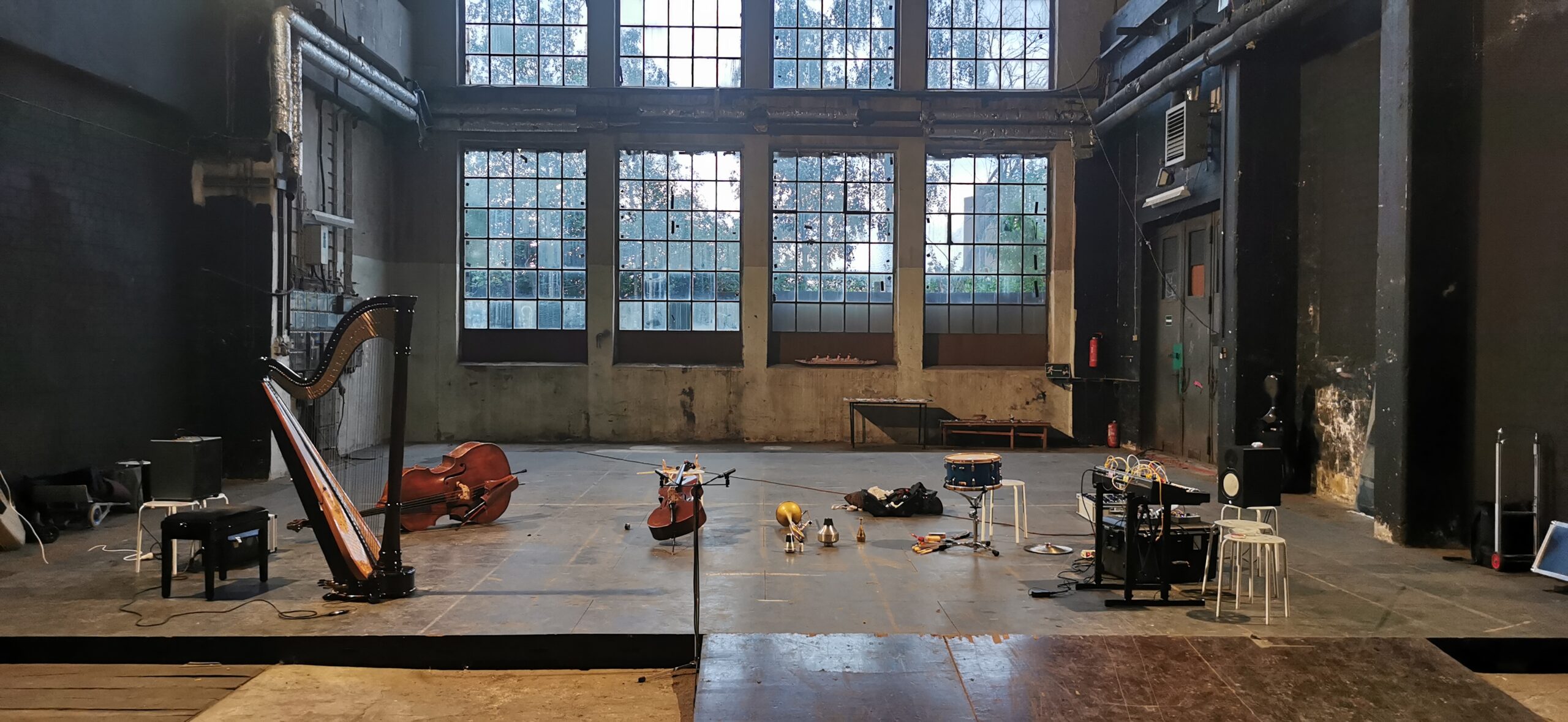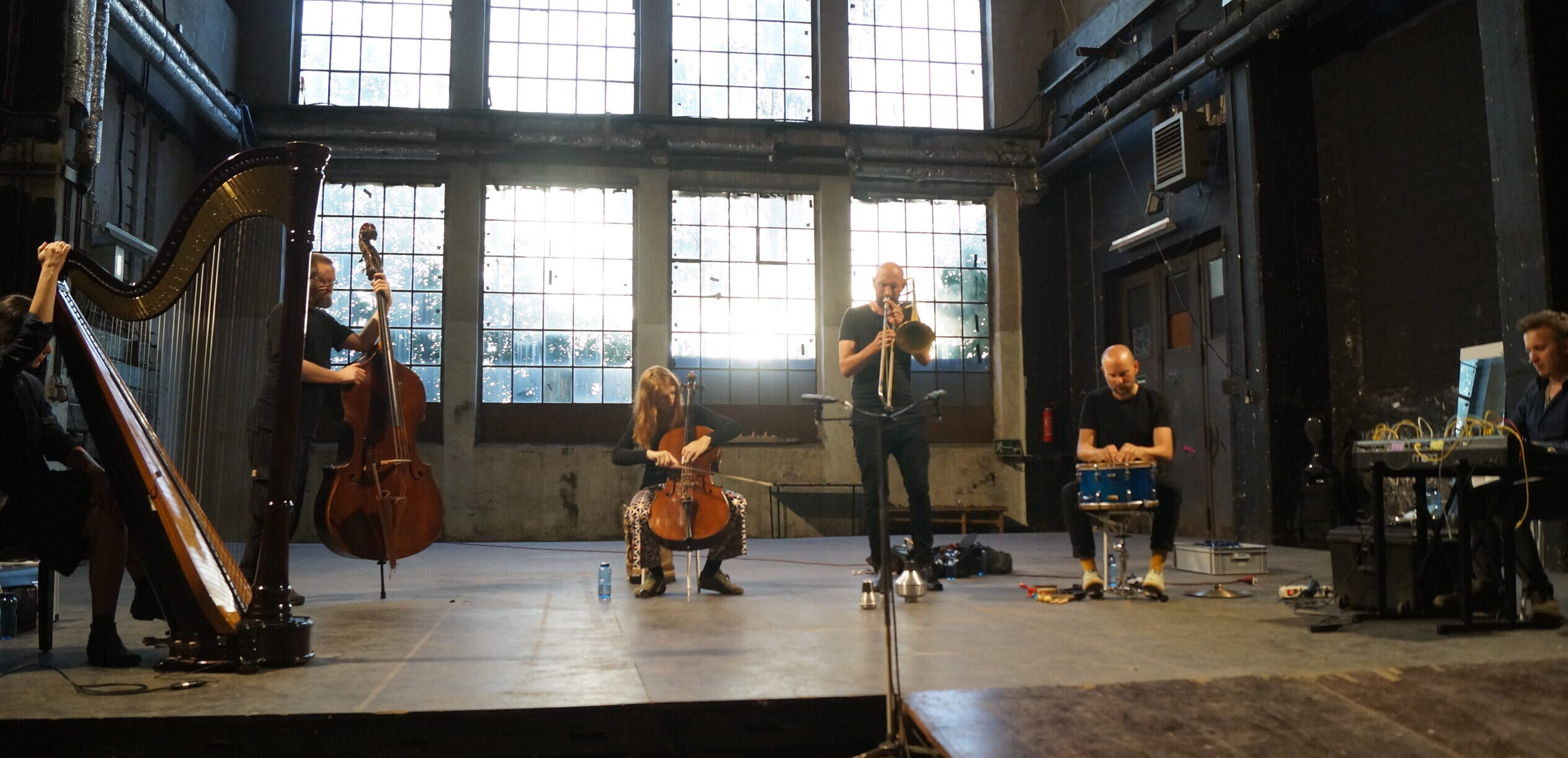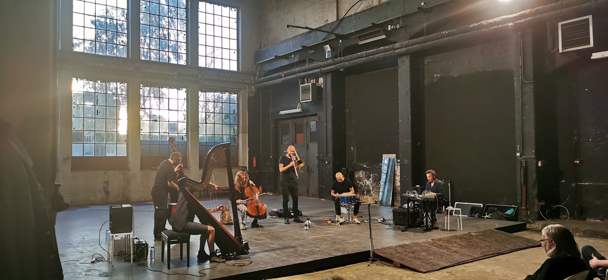 Aus dem Moment heraus agieren, auf Augenhöhe kommunizieren, sensibel interagieren und damit Grenzen aufheben, etwa zwischen “Musik” und Geräusch, zwischen Klang und Raum – darum geht es in der Titanick-Halle an diesem Abend. Letztere ist groß und karg. Die “Antworten” auf Cello, Harfe, Posaune, präparierter Snaredrum, Kontrabass und Synthesizer fallen bevorzugt leise und zerbrechlich aus. Ob da eine gewisse Ehrfurcht vor diesen Mauern, die sowieso durch nichts zum Einsturz gebracht werden können, mitschwingt?