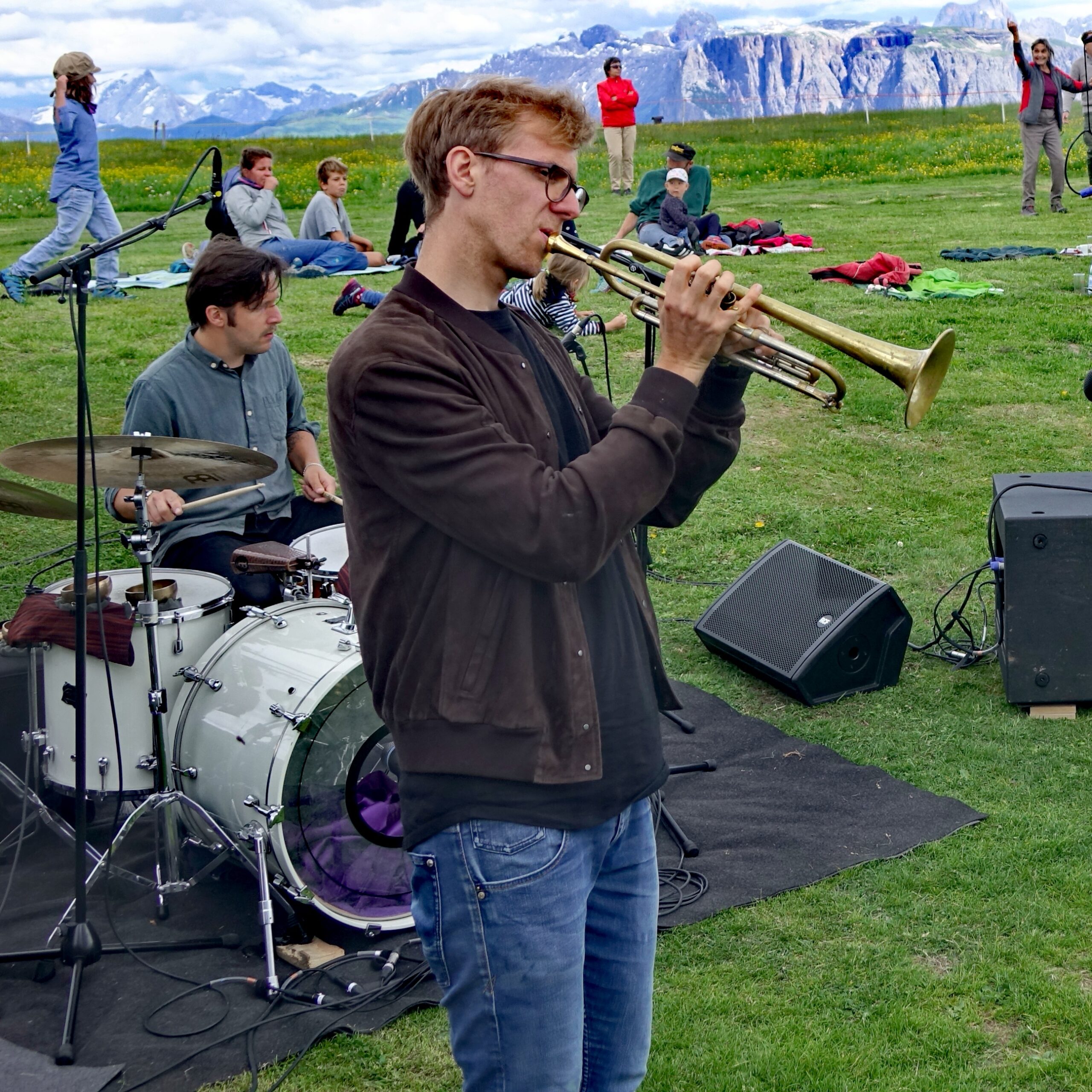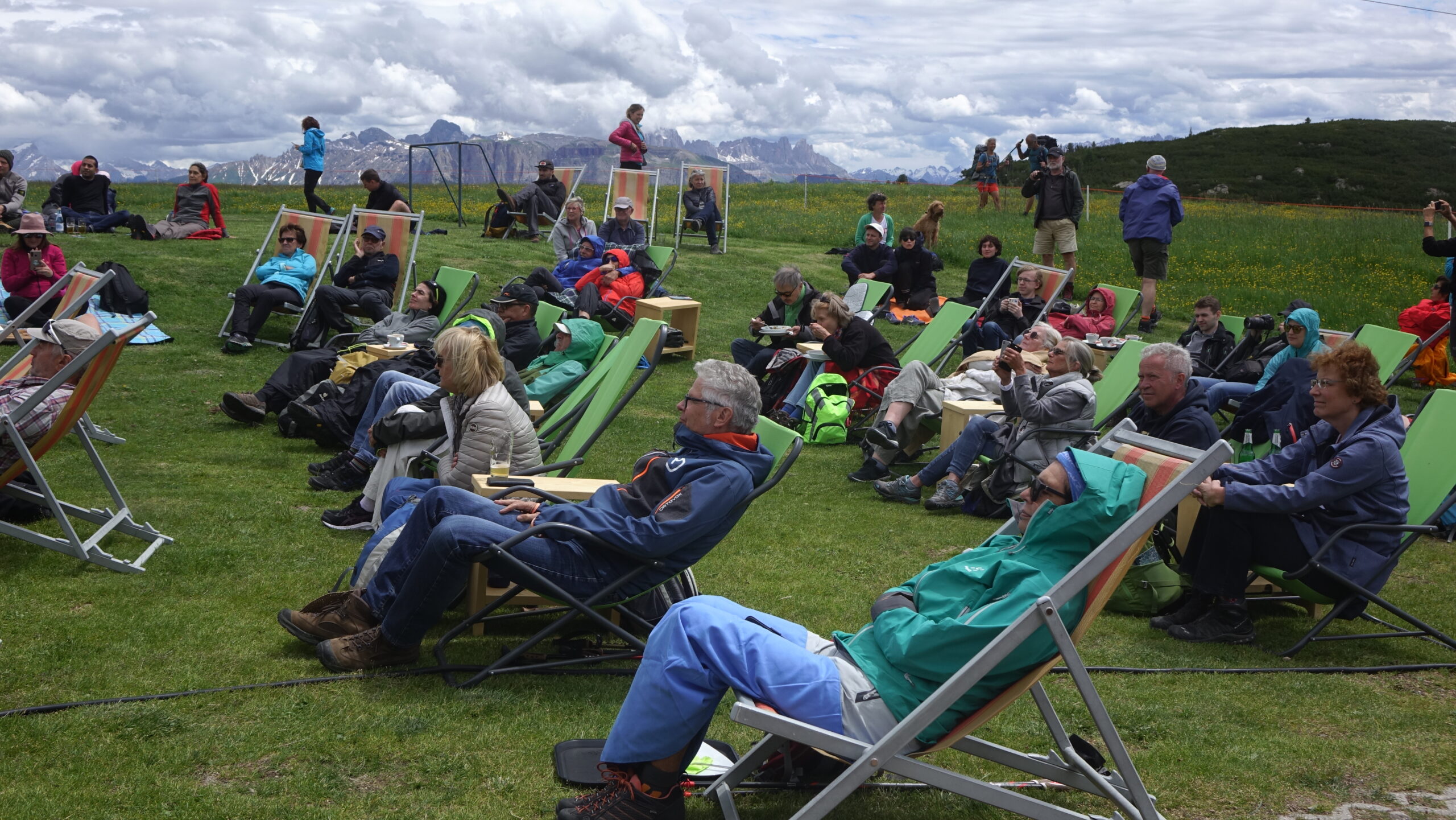 Wie an einer Perlenkette aufgereiht, wirken die gezackten Massive von Langkofel, Sella, Marmolata, Rosengarten und Latemar bei einem anderen Außentermin des Festivals – hoch oben auf der Feltuner Hütte auf dem Ritten, einem über 2000m hohen Hausberg von Bozen. Menschen ruhen sich auf Liegestühlen aus. Kinder spielen und freuen sich über Höhenluft und ganz viel Platz. Den Soundtrack für all dies liefert die Münchener Band „Fazer.“ Gleich zwei Schlagzeuger takten den Landschaftsfilm in einen gleichmäßigen Ruhepuls. Trompete und Gitarre erzählen endlose Geschichten in hellen Farben dazu. Jazzkonzerte beim Alto Adige Festival sind oft synnästetische Erfahrungen.