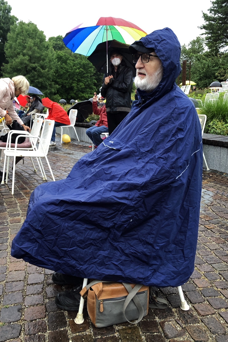 Überhaupt beherrschte gute Laune und das Miteinander, unter Beachtung der Hygieneregeln, die gute Stimmung im Botanischen Garten. Und wenn es denn mal regnete wurden bunte Schirme aufgespannt oder Ponchos übergezogen, getreu dem Motto: Schlechtes Wetter gibt es nicht, nur unpassende Kleidung! Die Stimmung war so vom Anfang bis zum Ende des Festivals entspannt. Sowohl die Musiker als auch das Publikum genossen das einzigartige Miteinander. Krönender Abschluss, bei bestem Wetter, war dann Nik Bärtschs Ronin. Ein Konzert, das vor allem vom konzeptionellen Ansatz Bärschs nirgendwo besser passt als in den Botanischen Garten. Zusätzlich fanden dieses Jahr im Brunnenhof des Zeughauses während der vier Festivalwochen, in Kooperation mit dem Jazzclub Augsburg, Konzerte mit interessanten aufstrebenden Newcomer-Bands statt. Alle ausverkauft und mit Linntett, Der Weise Panda, Heidi Bayers Virtual Leak, Aly Keita und B3 herrlich erfrischend wie mitreißend.