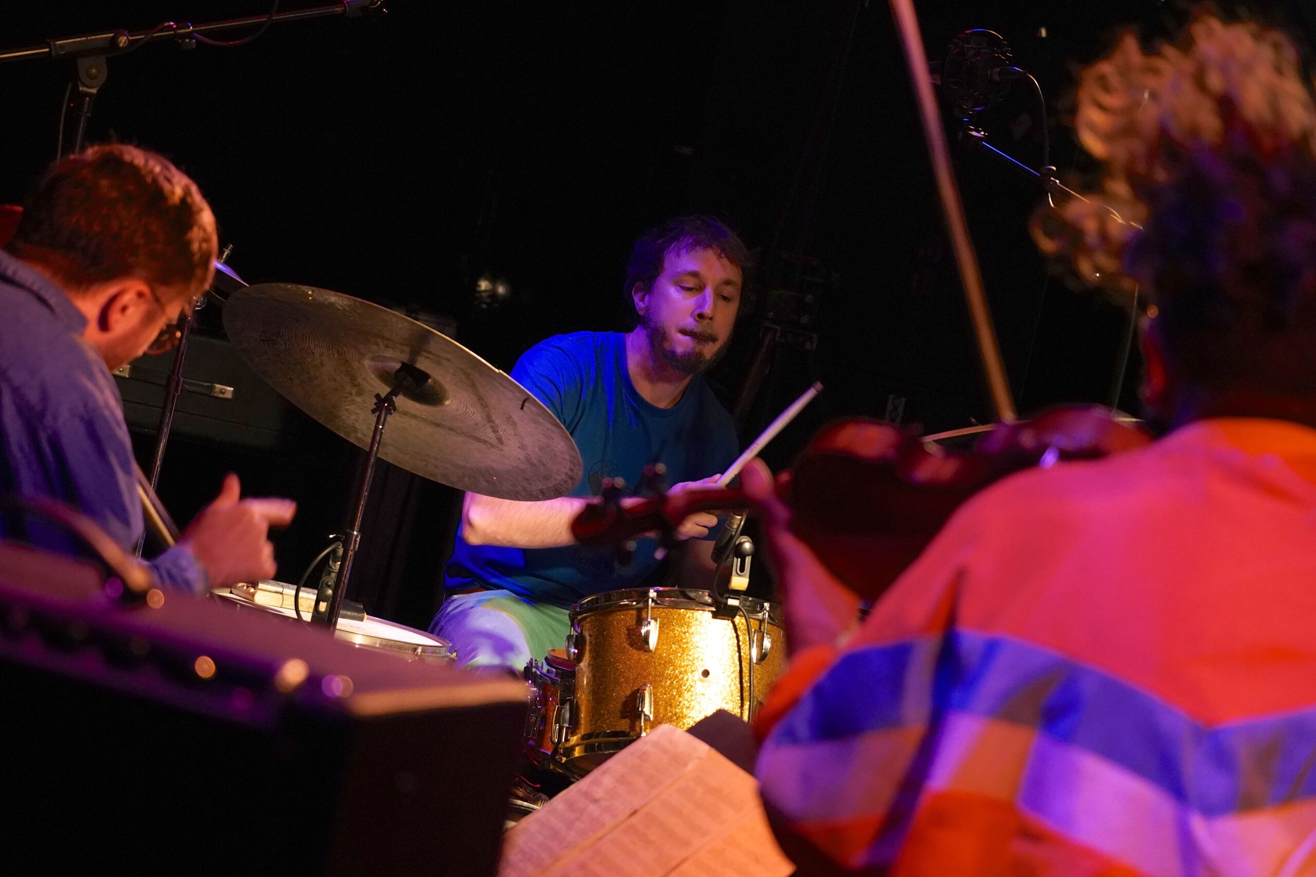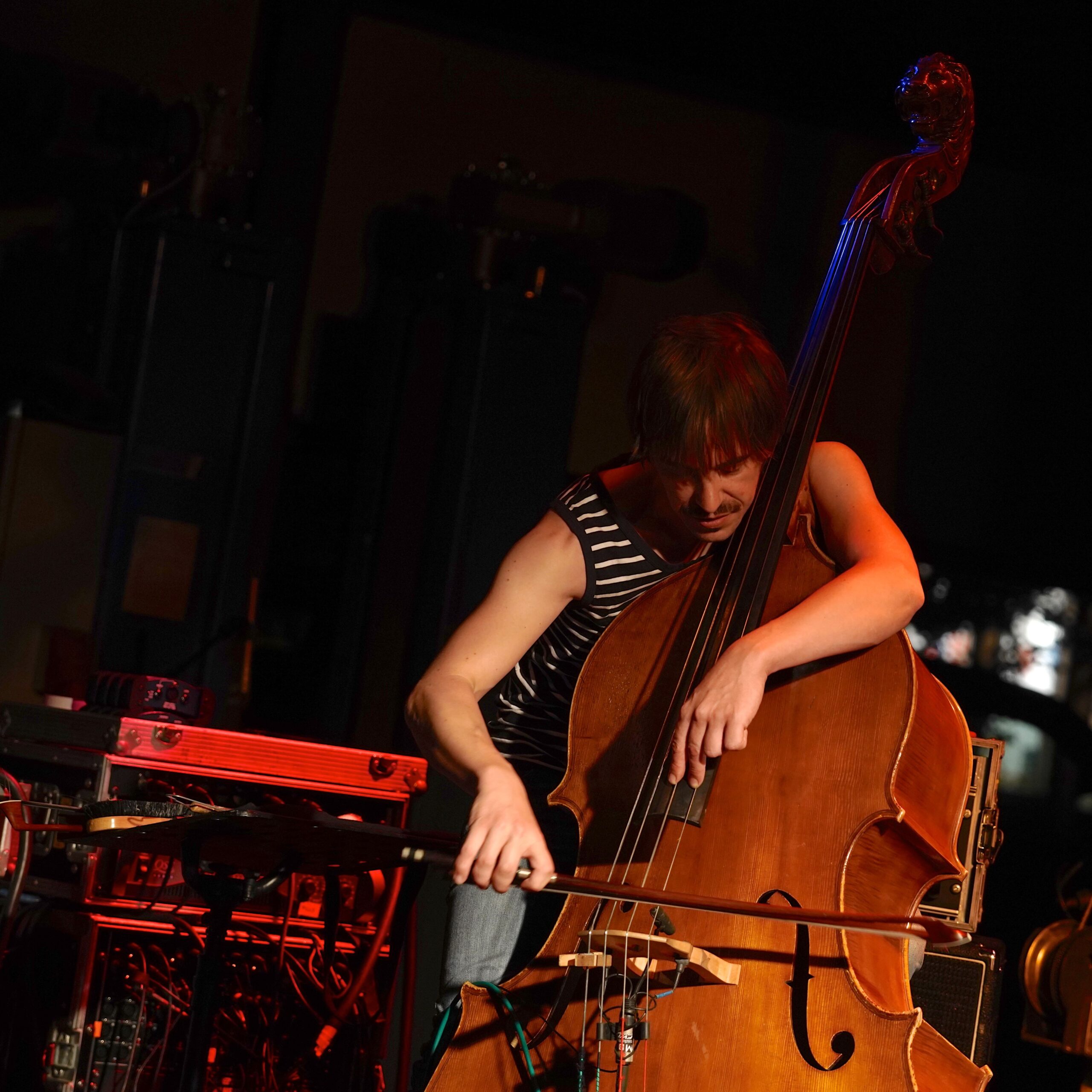 Rund um solche Amplituden gruppierten sich die meisten anderen Bands und Projekte. Die estnischen Sängerin Maarja Nuut etwa präsentierte ein Set mit kammerelektronischen Texturen und Folk-Einsprengseln, die Berliner Insomnia Brass Band entwickelte ein Mikroformat tendenziell stilloffenen Bläsersounds. Die SOKO Steidle um den Schlagzeuger Oliver Steidle blieb der flirrenden Tonfülle früherer Avantgarde treu und pflegte die gemeinsame impulsive Redundanz, das französische Quartet No Tongues setzte die Idee der perkussiven Feldforschung in melodische Songstrukturen um und deren Landsleute von Electric Vocuhila adaptierten weltmusikalische Beats für ein tendenziell tanzbares Spätabendkonzert. Famos schließlich, weil mit hohem gestalterischem Risiko, war das für „Django“ eingesprungene Trio „In Love With“ des Schlagzeugers Sylvain Darrifourcq mit den Streicher-Brüdern Valentin und Théo Ceccaldi. Ein wenig, meinte der Bandleader in einer Ansage, gehe es dabei auch um Sex, oder zumindest um das Prinzip des Orgasmus, woraufhin die Musiker über eine Dreiviertelstunde hinweg ihr Energie- und Konzentrationsniveau kontinuierlich steigerten, bis hin zu einer Klangentladung, die selbst beim Hören etwas Kathartisches hatte. Schweißdampfende Musik auf frei jazzender Basis, ohne sich im Geäst der Gedanken zu verirren – darum geht es. Humorvoll, kraftvoll, in Liebe. Eine Botschaft, die Sinn macht.