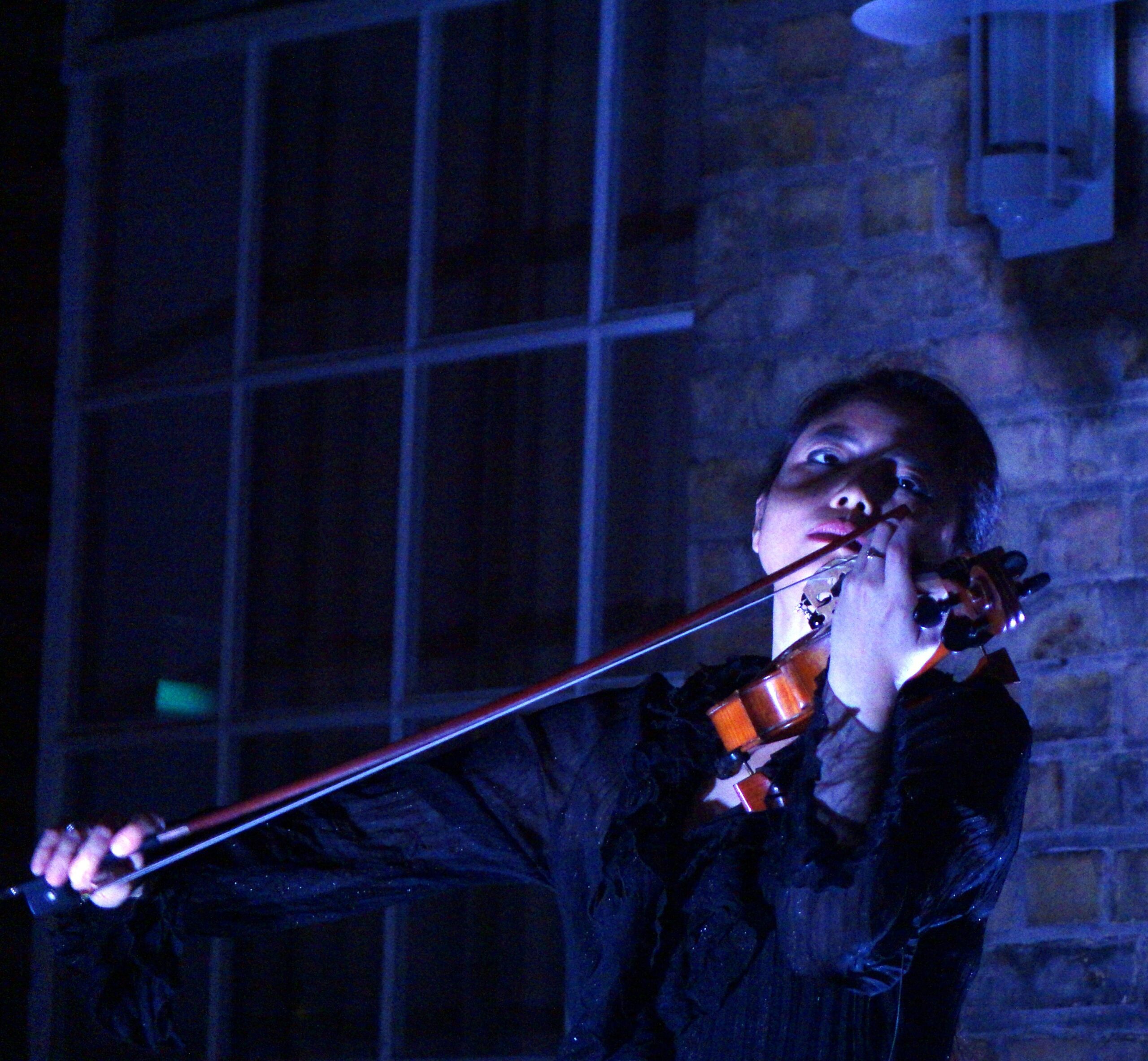 Aber das ganze ist Effekt-Show, sondern Teil des musikalischen Konzepts. Vor allem aber: Bernie Mallinger (Violine, Gesang), Sophie Abraham (violoncello, vocals),Cynthia Liao (Viola, vocals) und Igmar Jenner (Violine) versinken restlos in ihrem Spiel und kommunizieren hellwach dabei. Das Publikum an diesem Abend durfte an etwas spektakulär Brandneuem teilhaben: So wie im ersten Teil des Konzertes wurde die Musik Johann Sebastians Bachs wohl noch nie auf die Reise zu neuen Ufern geschickt. Aus schillernden Klangflächen erheben sich die Sätze der g-Moll Violinsonate. Assoziativ und in loser Reihung, fast fragmentarisch bietet so etwas Raum für reiche instrumentale Fantasieentfaltung, für Schwebungen ohne Begrenzung. Vor allem die flächigen Tremoli und Texturen erzeugen Zustände von Ausschweifung, die das Publikum in eine Art mystische Zelebration hinein zieht. Drei von ihnen setzten auch ihre Stimmen als weitere Instrumente ein – bis sich schließlich wieder Bachs Tonsprache mit ihrer unerschütterlichen Prägnanz heraus schält.