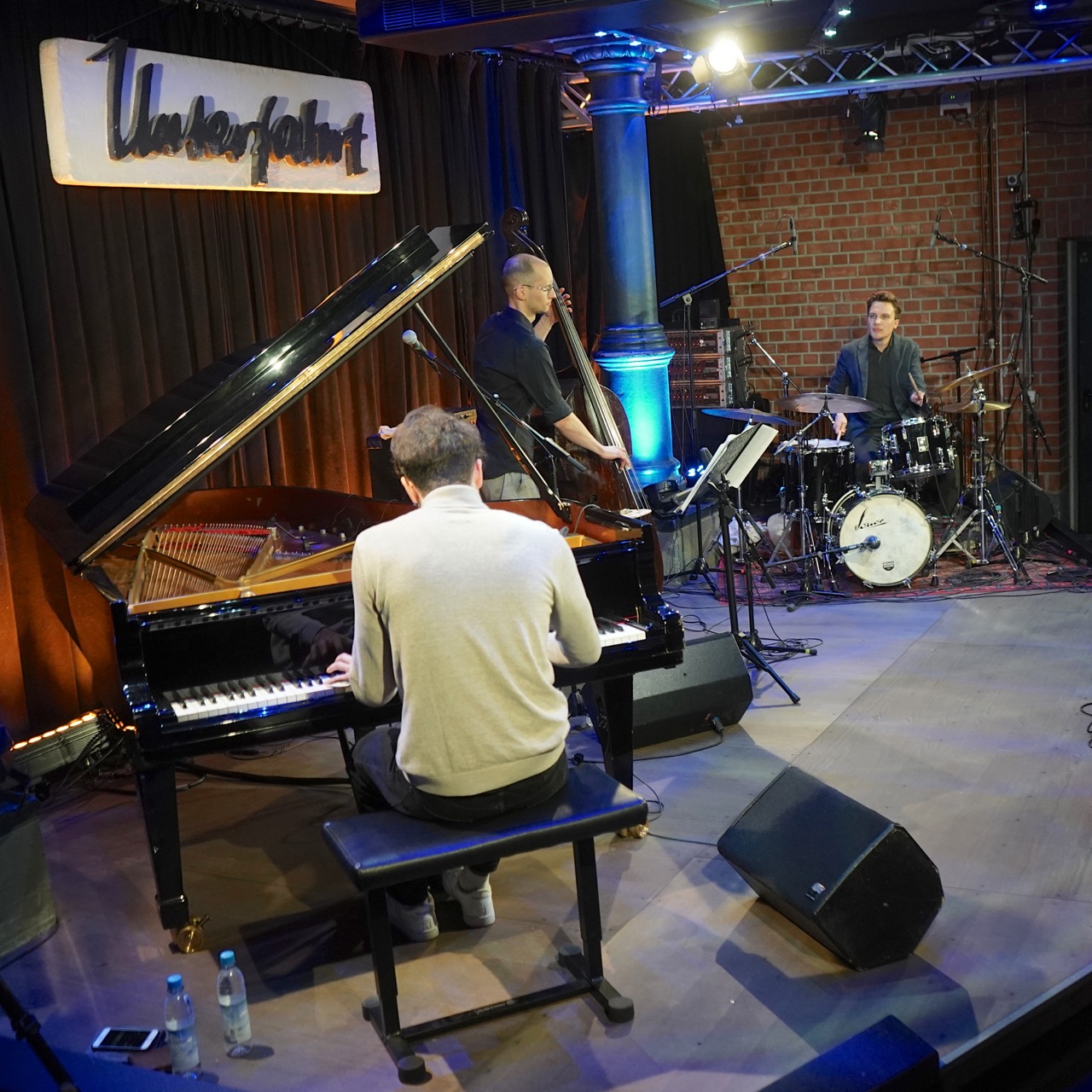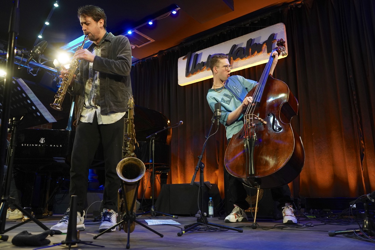 Aus Nürnberg stürmte das Trio des Pianisten Lukas Langguth auf die Bühne, mit wild romantischem Gestus und der Tendenz zur musikalischen Überfülle. Sie agierten brillant, der Schlagzeuger Jonas Sorgenfrei mit der Fähigkeit zur simultanen, kommentierenden Abstraktion des Gespielten, ohne dabei etwas dem rhythmischen Netz entschlüpfen zu lassen. Der Bassist Hannes Stegmeier fungierte in fortwährender Kommunikation nach beiden Seiten als eine Art Anker des Projekts, ebenfalls hervorragend in der Kunst beiläufig versierter Strukturierung. Der Pianist Lukas Langguth wiederum war kaum zu bremsen, in sich überschlagenden Ansagen ebenso wie in einem überbordend ornamentierenden Spiel, dessen pointierte Geschmeidigkeit dann die Jury überzeugte, ihm den Solistenpreis des Abends zuzusprechen.