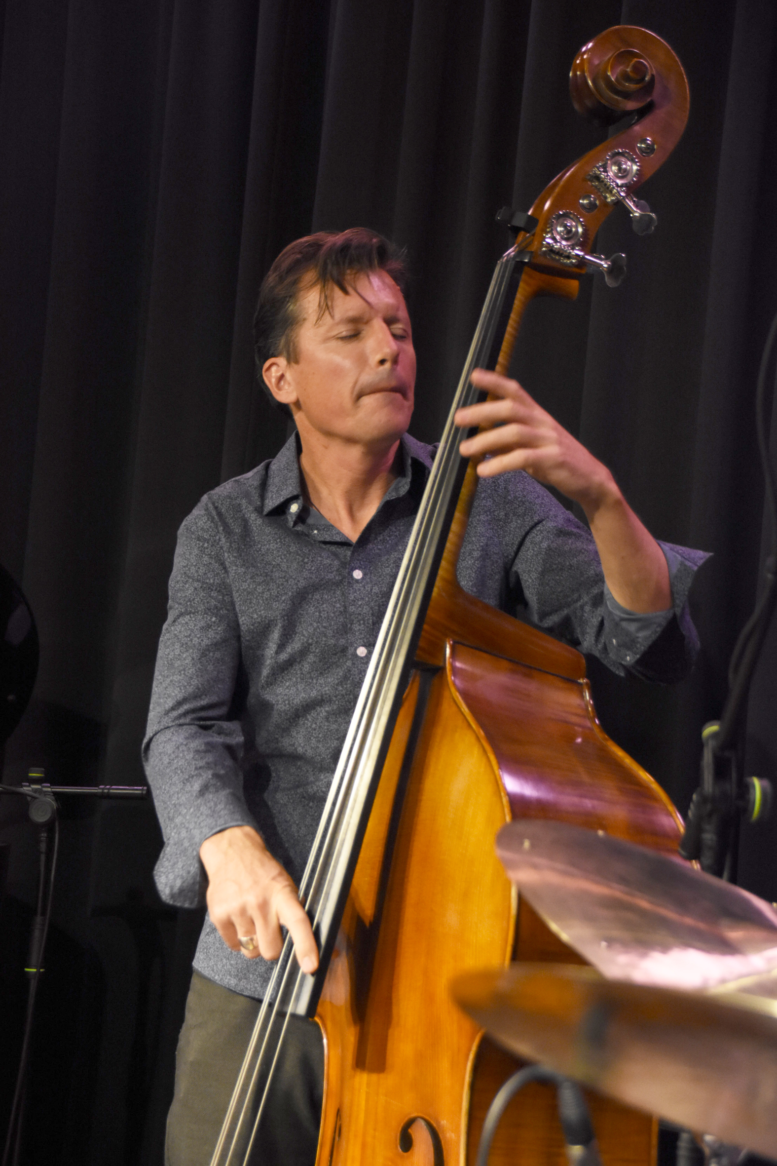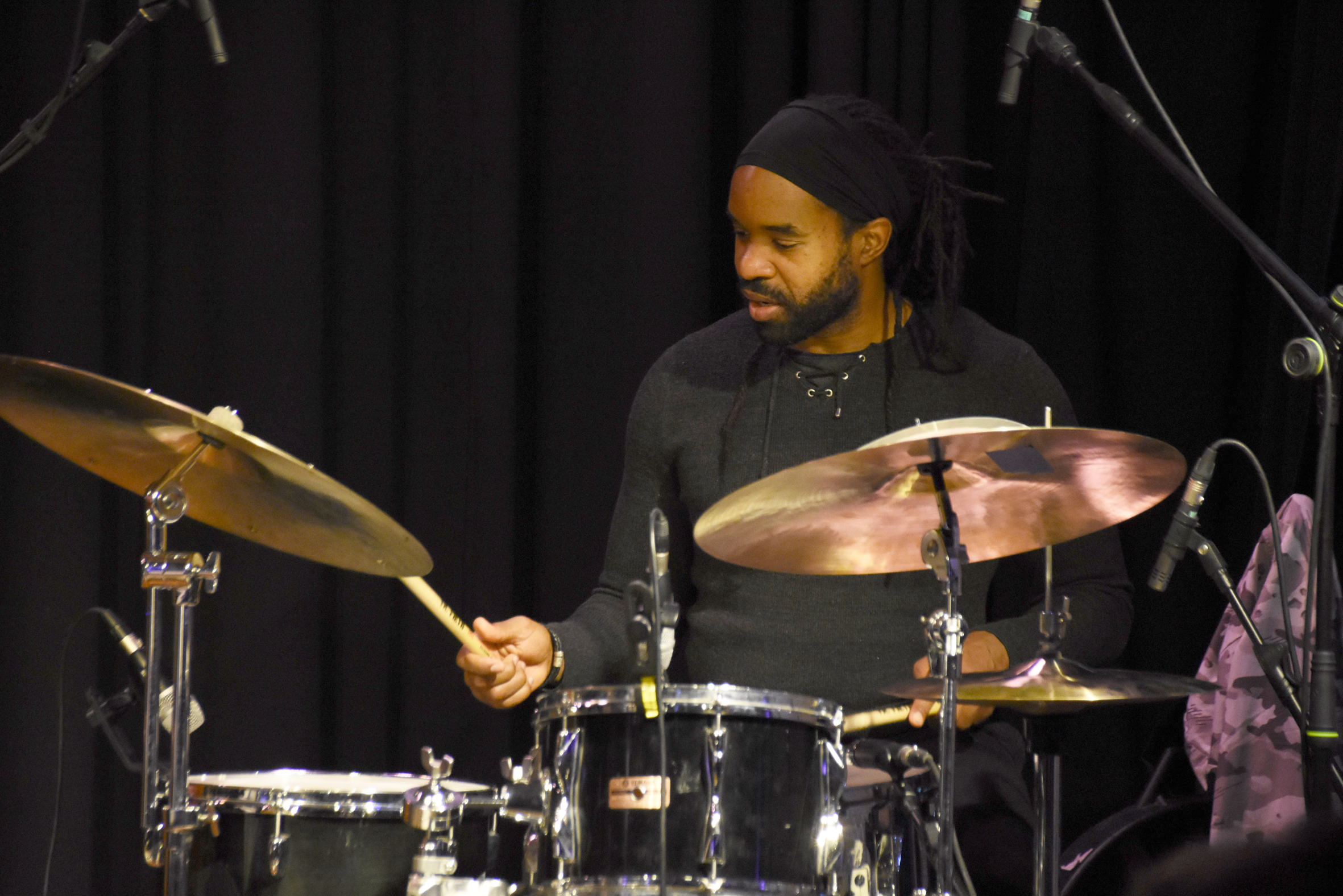 Obed Calvaire, Schlagzeuger mit haitianischen Wurzeln, knallte dem begierig lauschenden Publikum in einem Fourth-Spiel mit den restlichen Musikern seine raffinierten Rhythmen derart um die Ohren, dass manchem der Atem stockte. Tatsächlich zeigte sich der jede Nuance vom zart getupften Klängen bis hart vorantreibende Drummer als der heimliche Star des Abends. Geradezu spielerisch tänzelte er mit seinen Stöcken über Felle und Becken, umspielte Rhythmen mit federleichtem Feingefühl. In „White Bear“, das Meinhart seinem Lieblingsrestaurant in Brooklyn gewidmet hat, glänzte er mit einem Solo der Extraklasse. Mit dichtem Bassdrumspiel und unwirklich schnell wirbelnden Sticks klang er fast wie ein ganzes Perkussion-Orchester. Es war ein Gewitter auf Fellen, Becken und Trommeln, repetitiv begleitet von Piano und Bass.