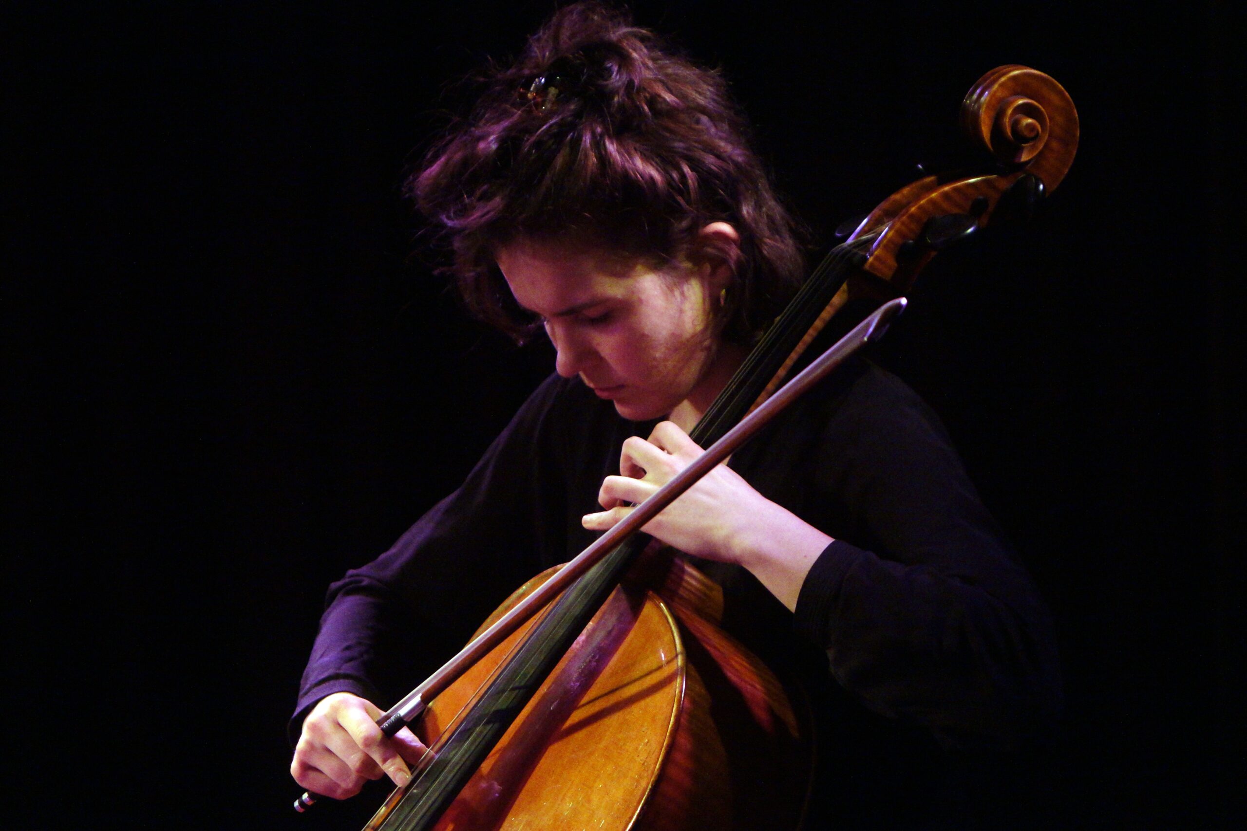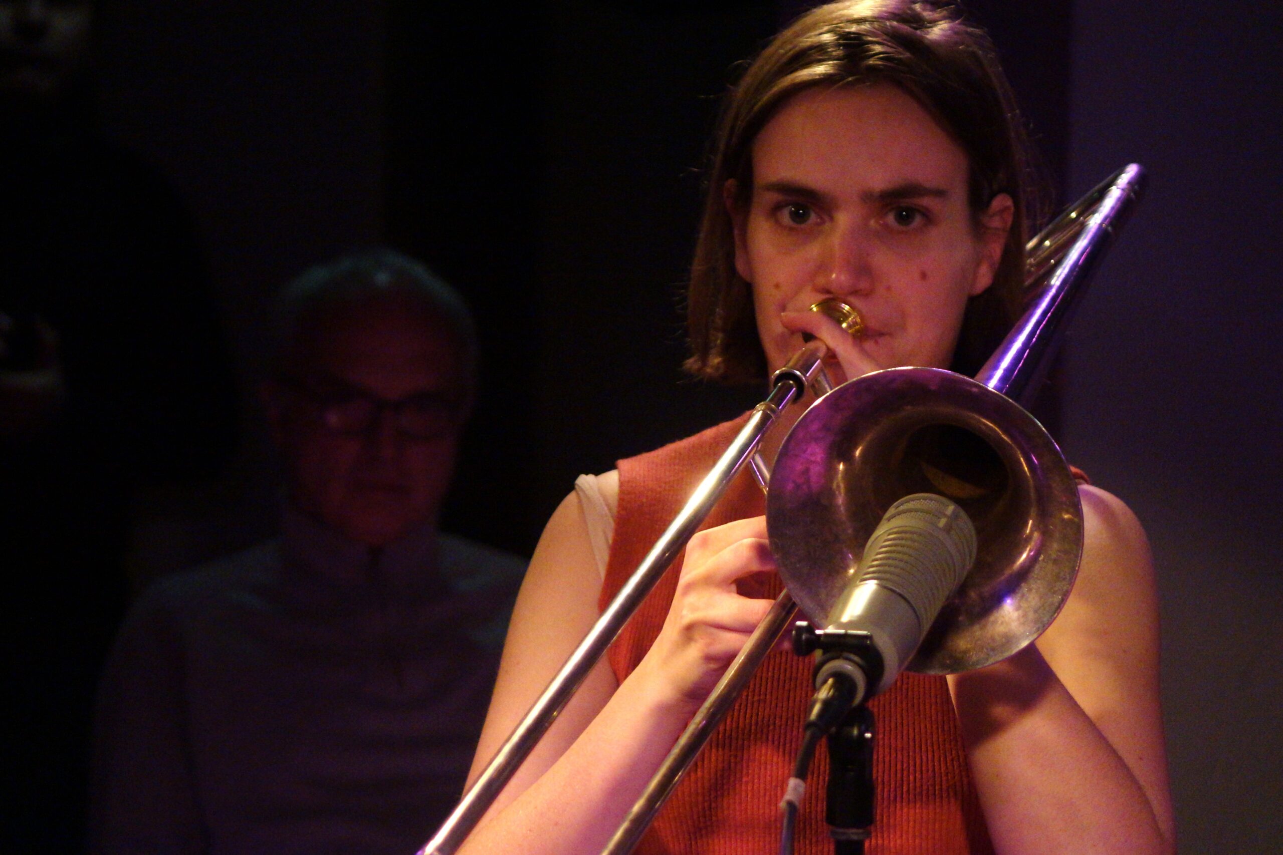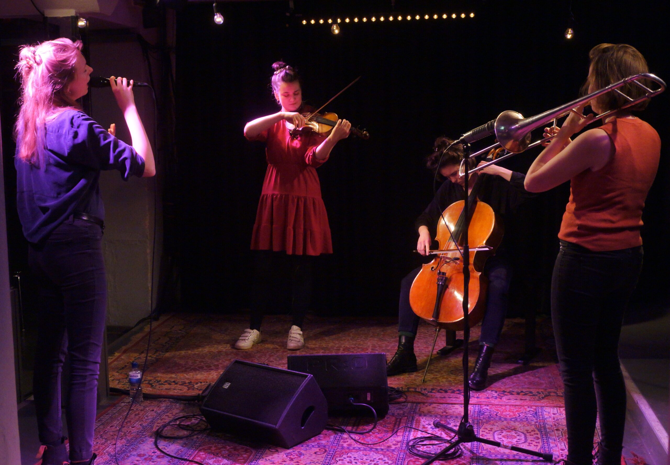 Beide Sets, welche „Hilde“ im Bunker Ulmenwall spielt, durchlaufen wechselnde Stadien. Zuweilen ist es eine verschlungene, dichte „Musique Concrete“, in der vor allem Marie Daniels ihre Stimme in allerhand lautpoetischen Nuancen einsetzt. Maria Trautmanns Posaune bringt kraftvoll artikulierende Rhetorik in die Sache, es entstehen auch rhythmisch strukturierte Gestalten. Derweil der ganze schillernde Klangreichtum gestrichener und gezupfter Saiten aus Emily Wittbrodts Cello und Julia Brüssels Violine Assoziationen an einschlägige Streicher-Komposition des 20. oder auch 21. Jahrhunderts weckt, ebenso blitzen fantasievolle Anspielungen an Renaissance oder frühe Barockmusik auf. Aber mit solch reichen Ressourcen um sich selbst zu kreisen, ist nicht Sache der Band „Hilde“: Mehr und mehr schälen sich Songstrukturen aus diesen Klangszenarien heraus. Aus dem Abstrakten sich ins Lyrische hervor wagen, darum geht es – umso mehr wie schließlich die Marie Daniels Gesangslinien emotional wirkungsstarke Songstrukturen formen.