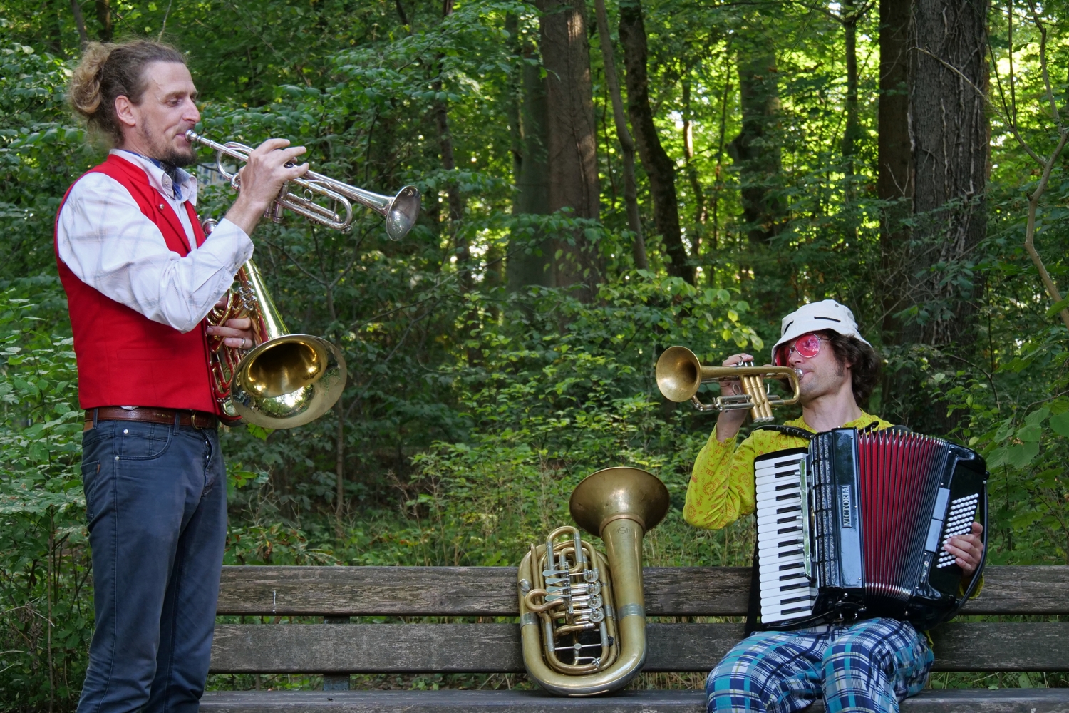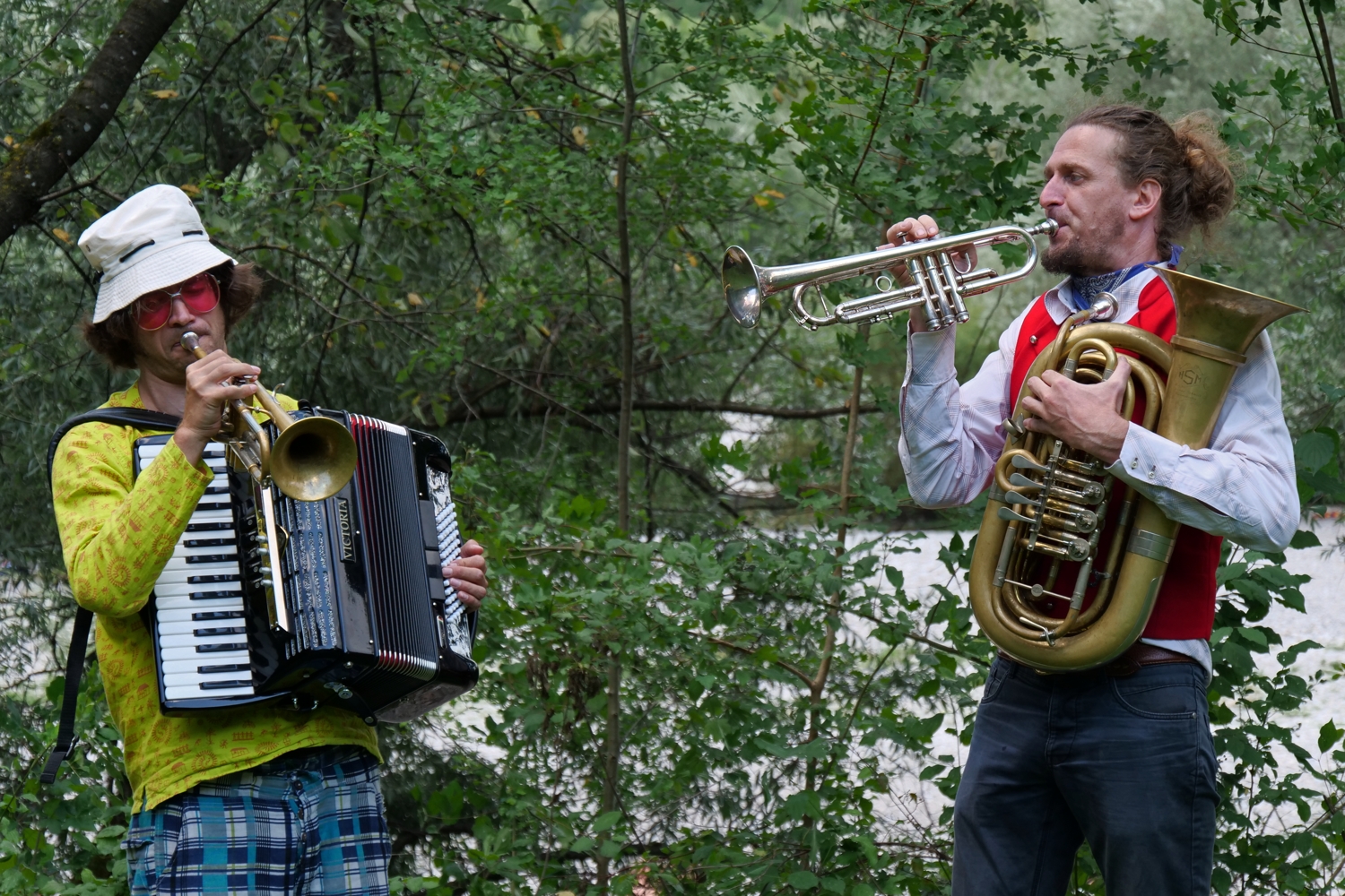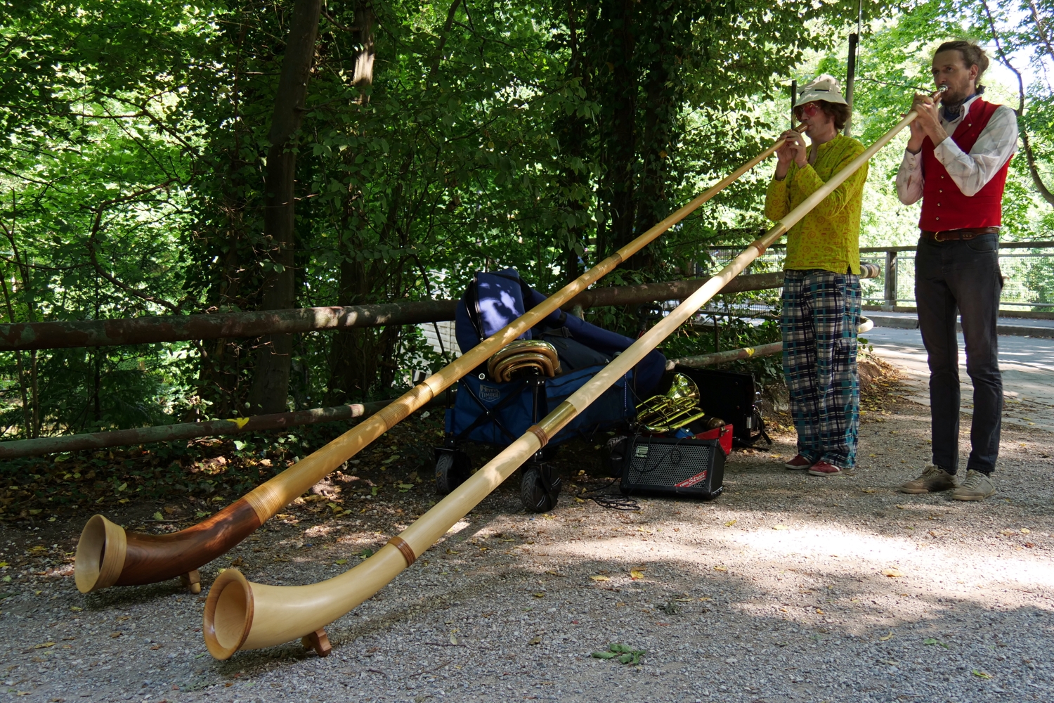 Ein kleiner Höhepunkt des Festivals war eine musikalische Wanderung mit Matthias Schriefl und Johannes Bär, die im Anschluss dazu ihren Dokumentarfilm „Auf Tour Z’Fuaß“ vorstellten. Zusammen mit den beiden Musikern ging der Ausflug von der Isarphilharmonie über die Schinderbrücke zum Flaucher und wieder zurück. Im Gepäck ein Sammelsurium an Instrumenten von Alphörnern bis hin zu Trompeten, Akkordeon und Tuba. Auf dem Weg gab es ein Alphornkonzert mit Jodelworkshop, am Flaucher bei den „Nackerten“ wurde u.a. der 60ziger Jahre Hit „Für Gaby tu‘ ich alles“ zum Besten gegeben, samt Tipps zum Trinken und Pieseln auf Wanderungen, immer wieder begleitet von musikalischen Einlagen. Nach gut einer Stunde ging es dann wieder zurück zur Isarphilharmonie. Das Ganze alles in allem eine Riesengaudi.