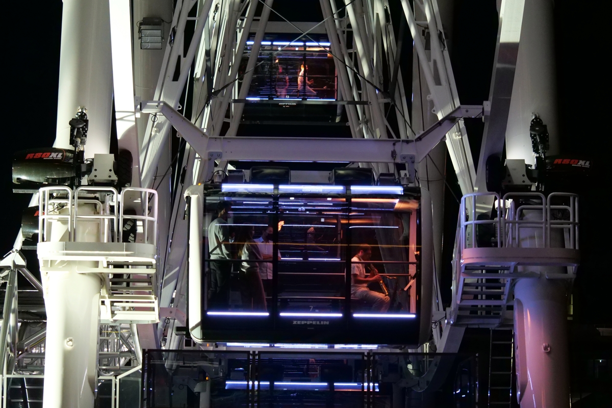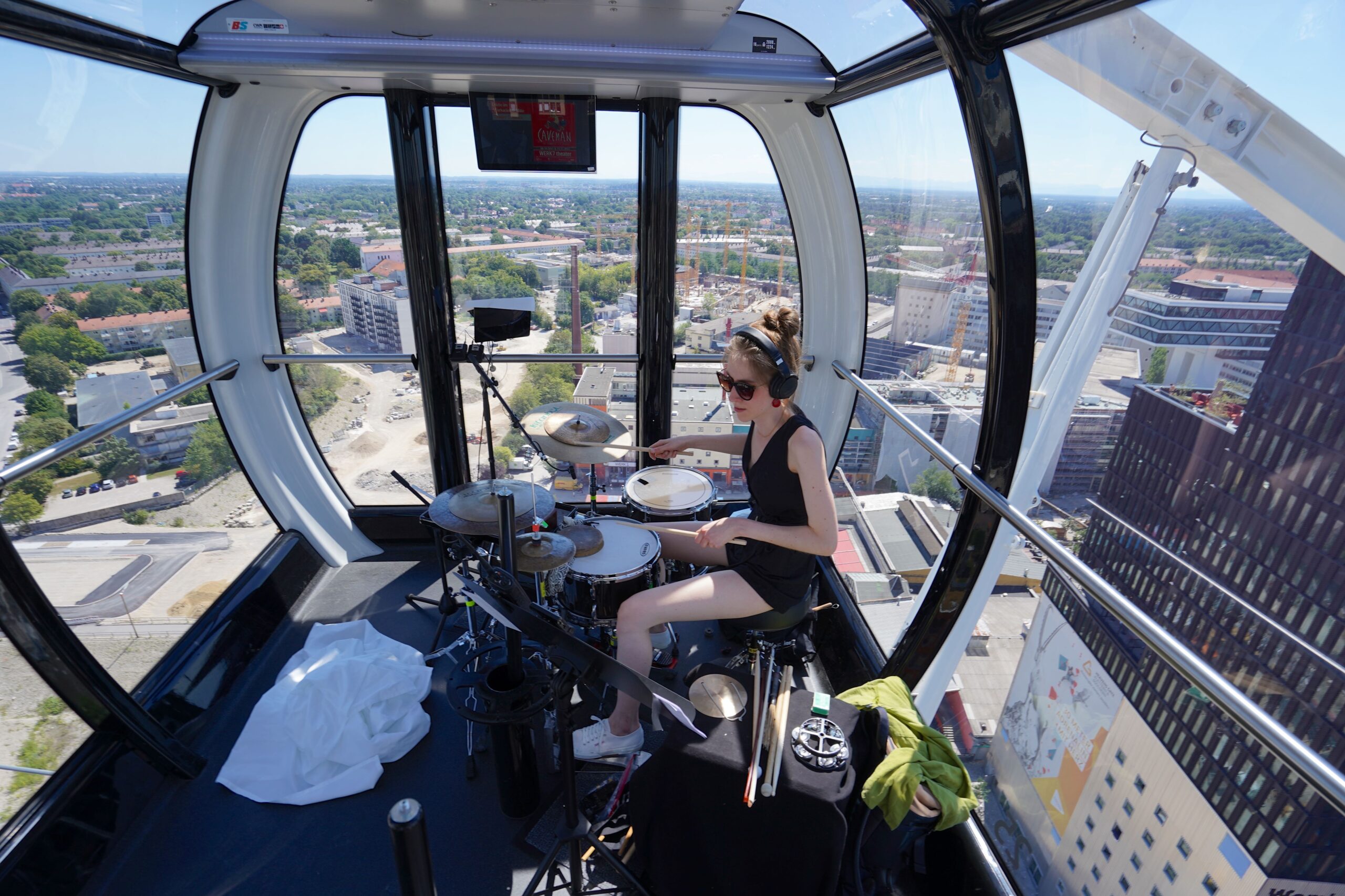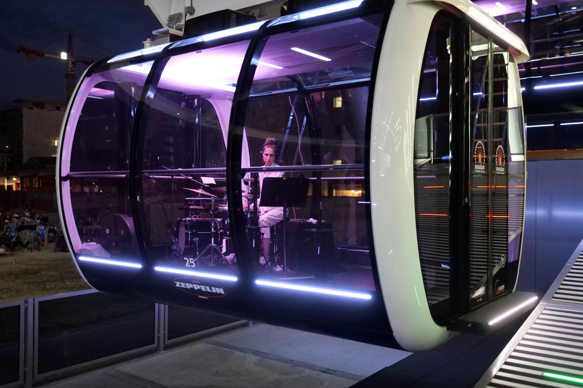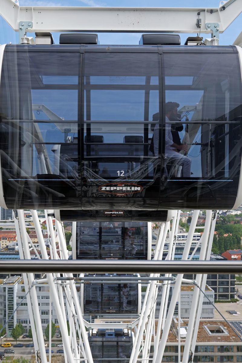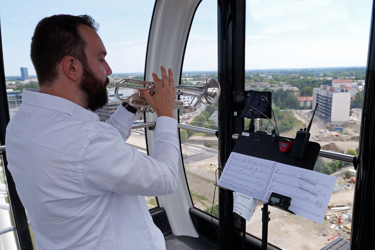 Zum Finale der dritten Festivalausgabe im Münchner Werksviertel (5.-7. August 2022) dem bereits das Gebärdensprachenballett „Babel“ und das Datenhandschuhkammerorchesterkonzert „Digitale Poesie: The Human Touch“ vorausgegangen waren, setzte das Auftragswerk des österreichischen Komponisten Christian Muthspiel technisch und konzeptuell noch einmal einen drauf. Denn für die Verwirklichung wurden 27 Musiker*innen seines OrJazztras Vienna in die Kabinen des Riesenrads gesetzt und jeweils über einzelne Kanäle mit dem Mischpult auf dem Bauplatz des geplanten Münchner Konzerthauses verknüpft, das wiederum aus den einzelnen Signalen ein Ganzes entstehen ließ und es dem ungezwungen auf Liegestühlen verteilten Publikum präsentierte.