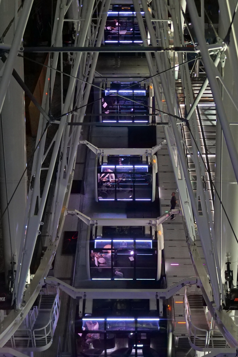 Dabei gab es neben der Besonderheit der Konstruktion noch weitere ungewöhnliche Elemente. Zum einen konnte man als Zuhörerin jeweils eine Umdrehung in einer der Kabinen mitfahren und erlebte damit die Laborsituation der jeweiligen isolierten Künstlerinnen, die nur sich selbst und eine rudimentäre Klanggestalt des Ganzen im Kopfhörer hörten. Darüber hinaus war die gesamte Komposition so gestaltet, ohne ein synchronisierendes Metronom auszukommen. Man spielte stattdessen nach Stoppuhr. Die Partitur wurde nach Sekunden gegliedert, Unschärfen der klanglichen Wirkung waren vorgesehen und nur bedingt kontrollierbar. Das Experiment bestand damit weniger im pittoresken Event des Jahrmarkthaften, als eher in der Grenzauflösung von Räumlichkeit und zeitlicher Gliederung. Zwar wurde ein Libretto eingehalten – Textpassagen von T.S Elliot, Pablo Neruda und Allesandro Barrico konkurrierten mit den Instrumenten und der Situation um Aufmerksamkeit – es blieb aber marginal ebenso wie die szenische Umsetzung, die sich auf das Drehen des Rades, die auf Leinwand übertragenen Zoom-Fenster aus den Kabinen und die zufällig mitfahrenden Passagiere beschränkte.