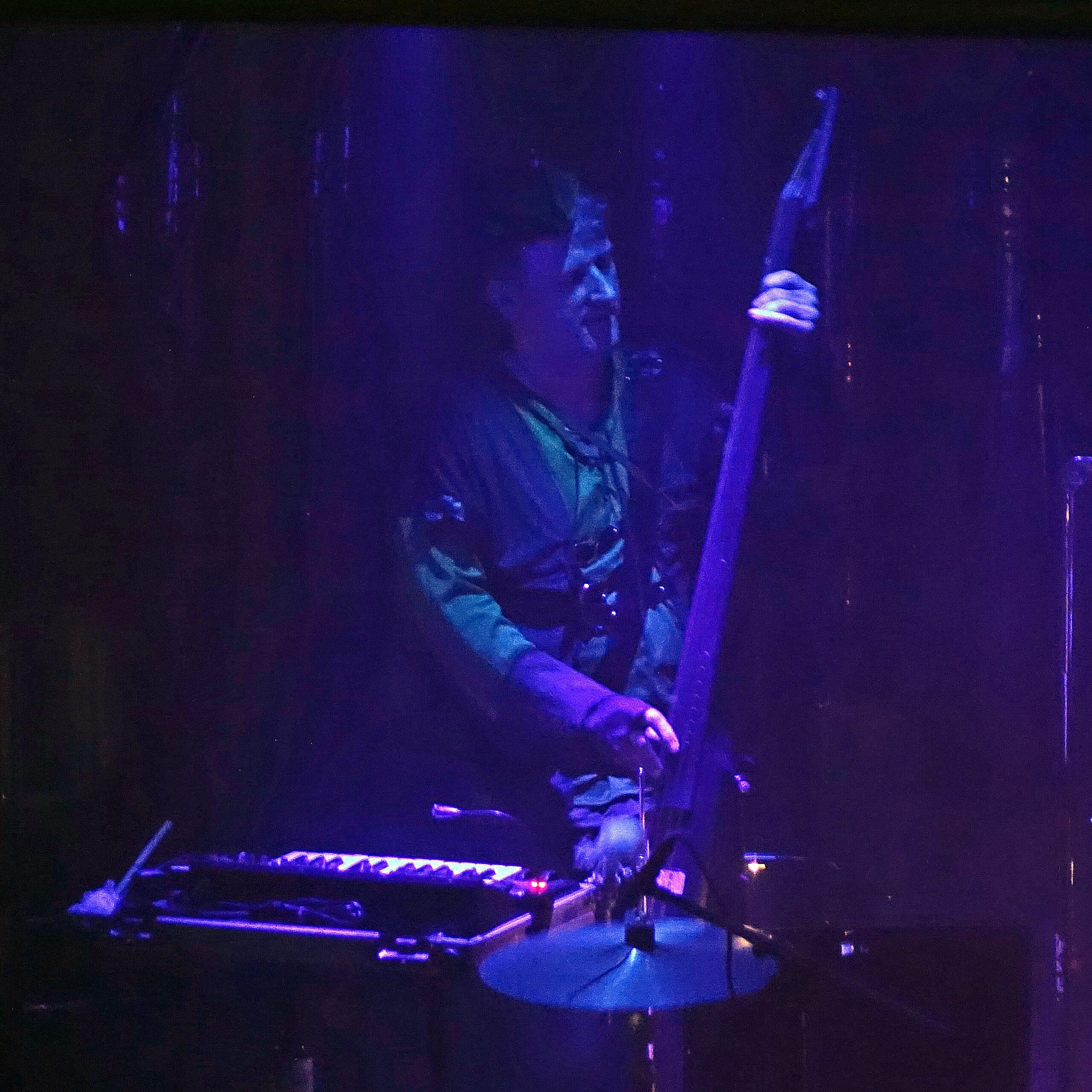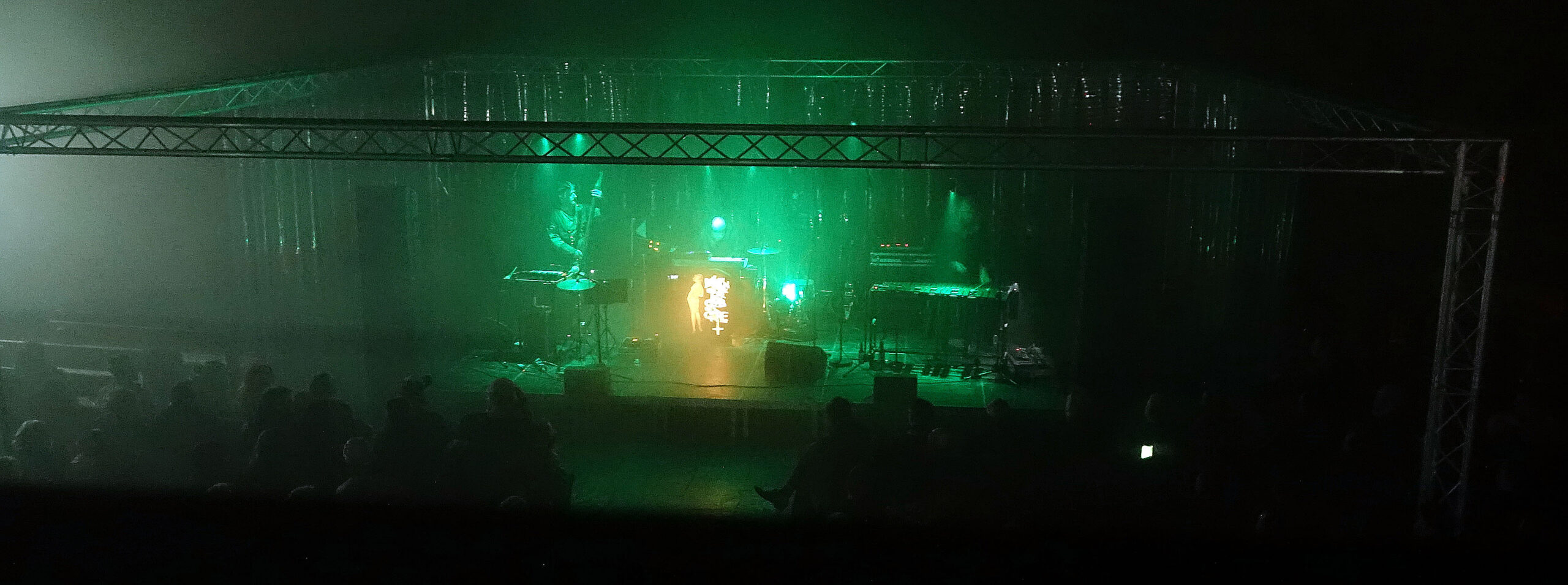 Dass es auch optisch mehr stockdunkel als halbdunkel ist, braucht kaum erwähnt zu werden. Die Musiker auf der Bühne erscheinen wie schemenhafte Geister, um sich schnell wieder in der Schwärze zu verflüchtigen. Hinter so viel bewusster Anti-Inszenierung steht aber eine durchdachte instrumentale Rollenverteilung. Bassist Robin Rodenberg, der einen Zwitter aus E-Bass und upright-Bass bevorzugt, bestimmt die Richtung zwischen wabernden Drones und traurigen Klagegesängen. Morton Gass vereint den Synthesizer, der auch als solcher konsequent gespielt wird mit Orgel, Fender Rhodes und Vibrafon und spielt auch manchmal ein (extrem minimalistisches!) Schlagzeug dazu.