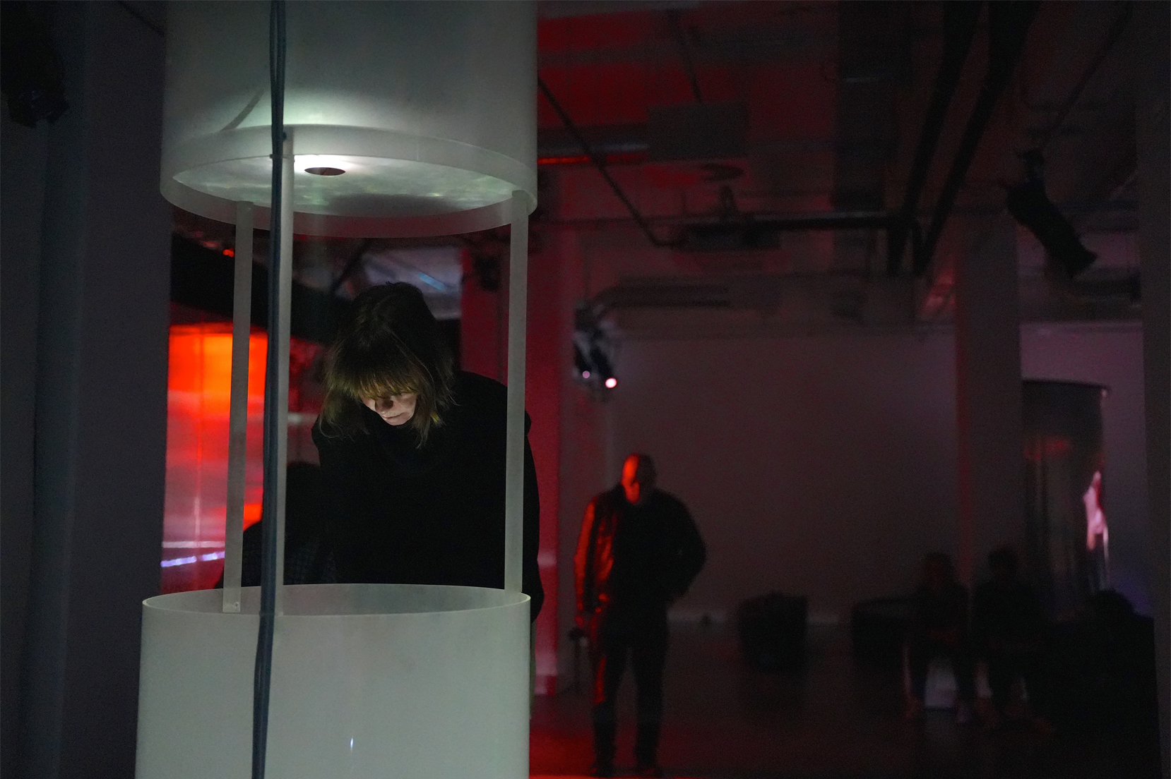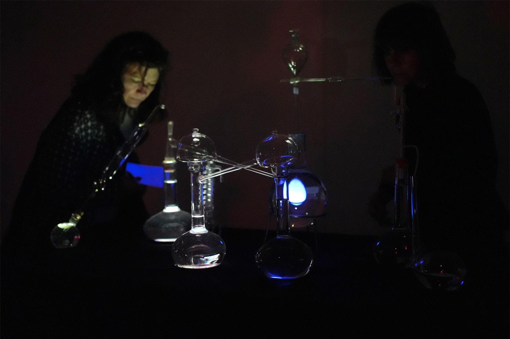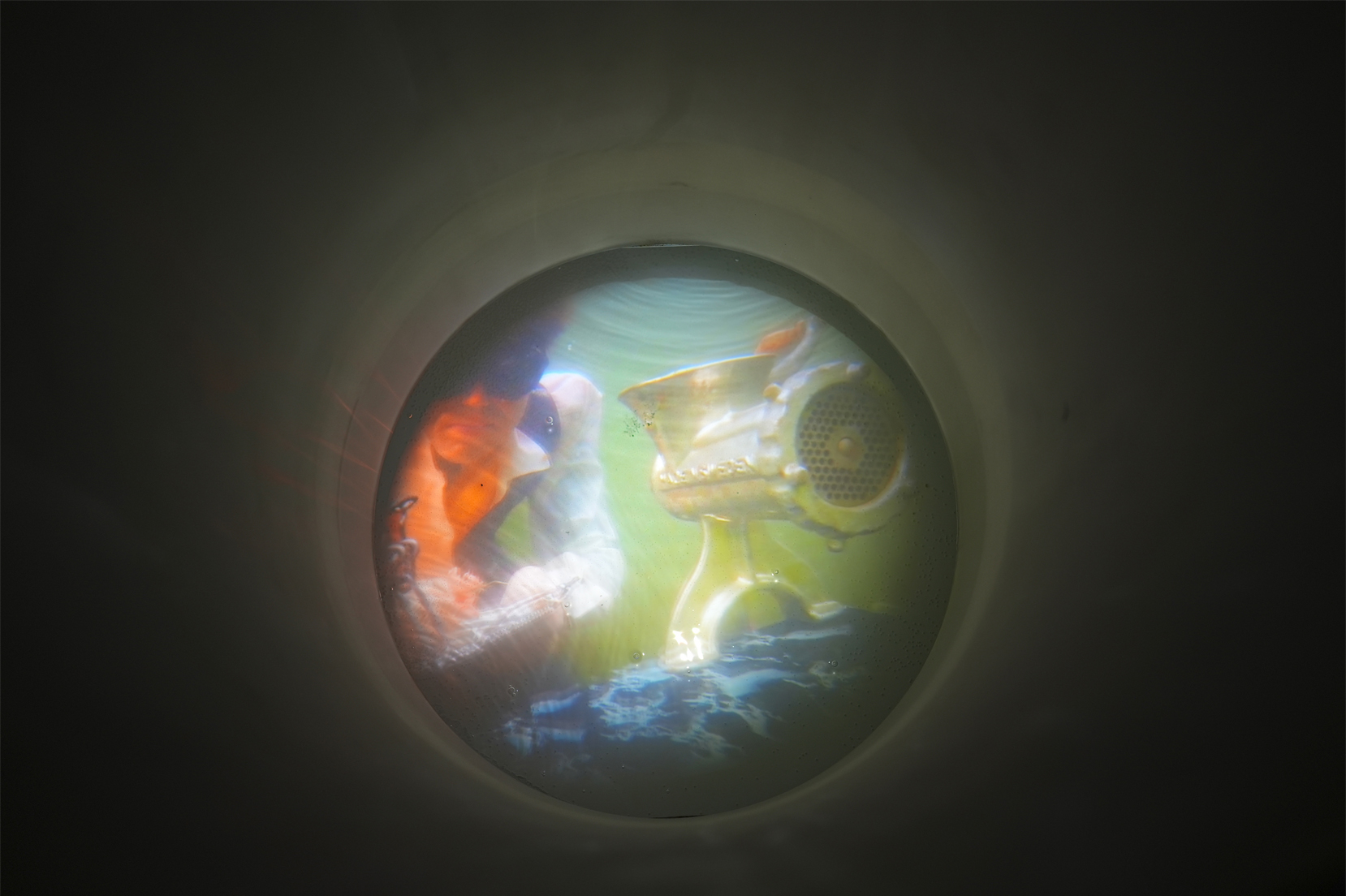 „Breaking The Surface“ geht einen anderen Weg. Sechs Stationen konfrontieren Besucher*innen der audio-visuellen Kunstinstallation mit verschiedenen Stadien des individuellen Erlebens von Wasser als Klang und Raum. Lautsprecher tauchen in hängende Gläser, eine konkave Leinwand mit Unterwasserbildern und Kopfhörern umfängt die Wahrnehmung. Ein nebliger Altar konzentriert die Betrachtung auf einen illuminierten Brunnen mit Videozuspielung, alchemistische, farbig leuchtende Kolben rufen das Existentielle des Mediums Wasser in Erinnerung. Man schreitet durch eine vulkanisch rote, aber neblig kalte Installationsschleuse oder kann mit Quallen und bebrillt in räumlicher 3D-Animation durch das Fluide treiben.
