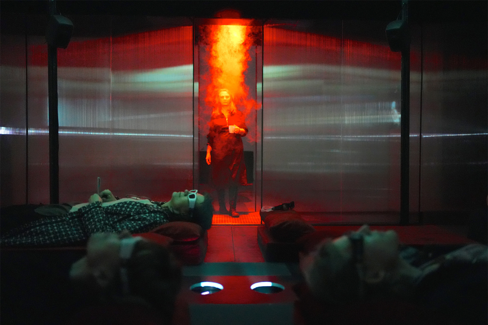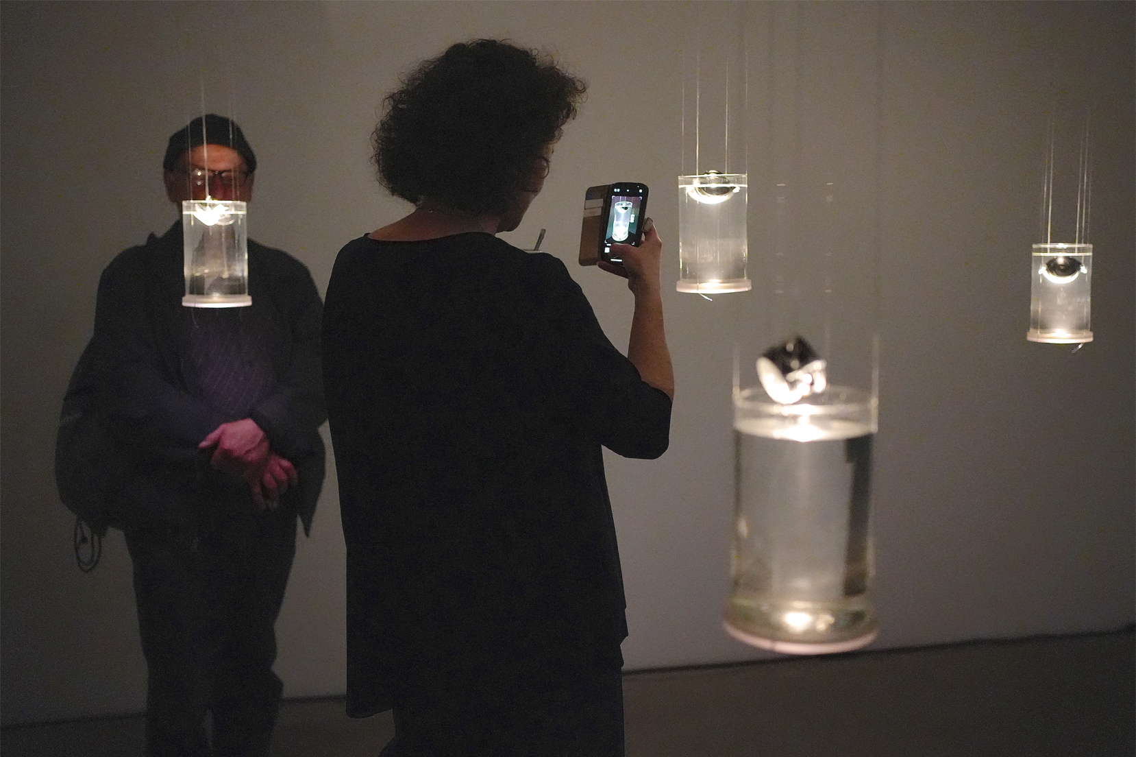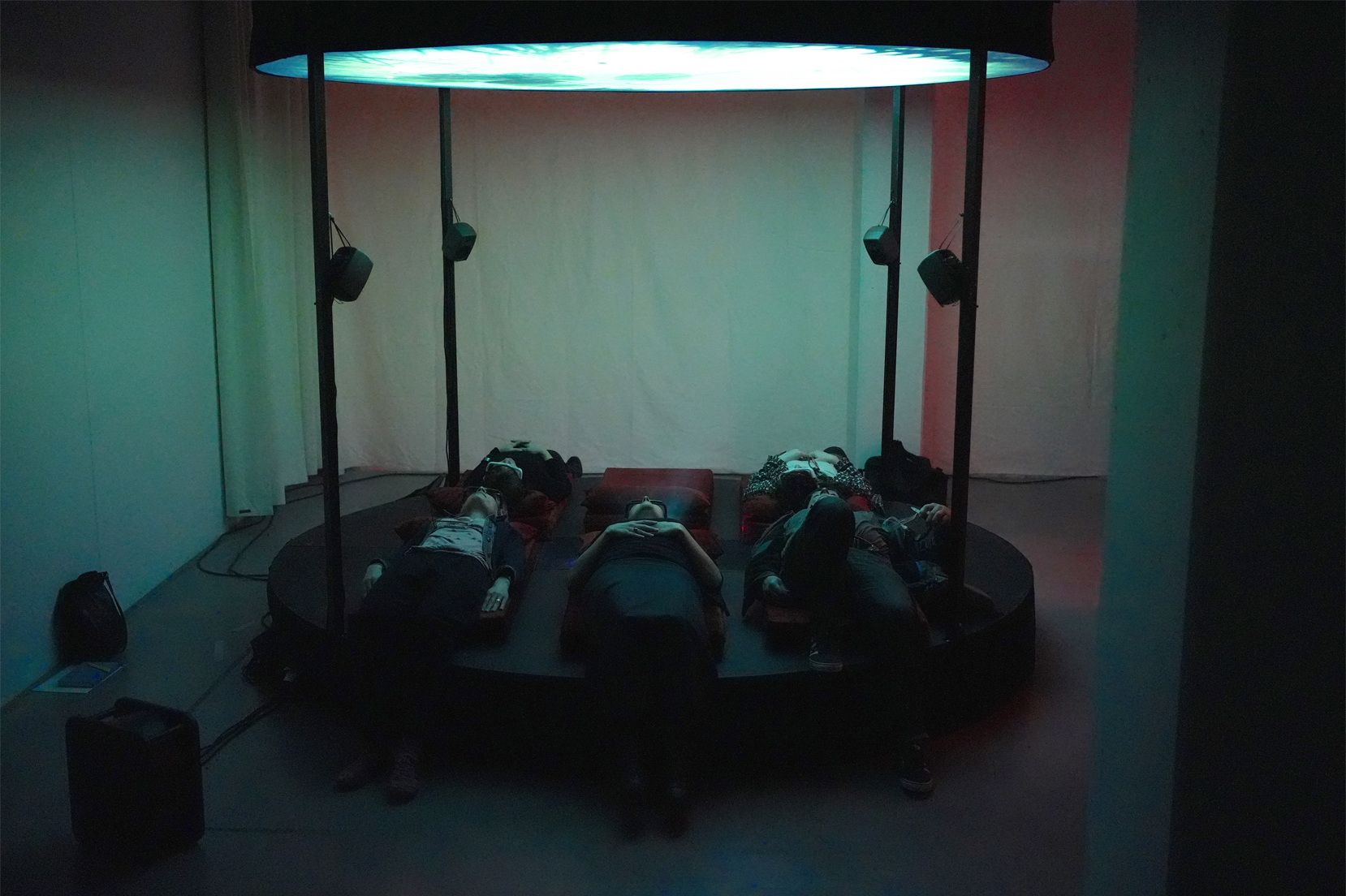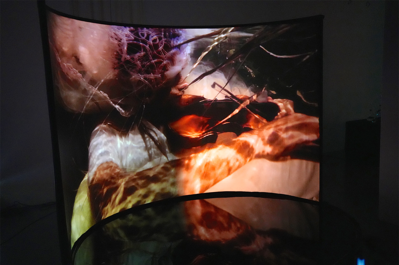 „Breaking The Surface“ geht einen anderen Weg. Sechs Stationen konfrontieren Besucher*innen der audio-visuellen Kunstinstallation mit verschiedenen Stadien des individuellen Erlebens von Wasser als Klang und Raum. Lautsprecher tauchen in hängende Gläser, eine konkave Leinwand mit Unterwasserbildern und Kopfhörern umfängt die Wahrnehmung. Ein nebliger Altar konzentriert die Betrachtung auf einen illuminierten Brunnen mit Videozuspielung, alchemistische, farbig leuchtende Kolben rufen das Existentielle des Mediums Wasser in Erinnerung. Man schreitet durch eine vulkanisch rote, aber neblig kalte Installationsschleuse oder kann mit Quallen und bebrillt in räumlicher 3D-Animation durch das Fluide treiben.
