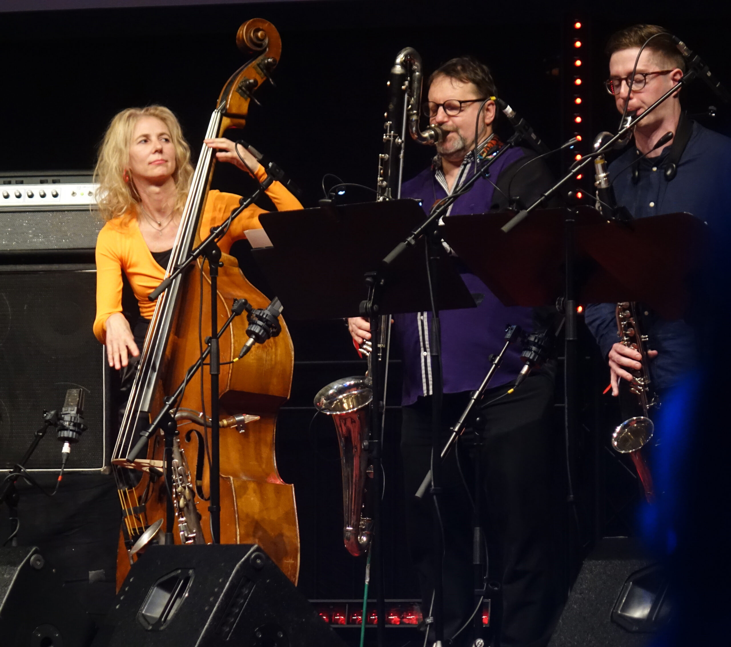 Auf einer intensiven lyrischen Schwingung war das Oktett „Multiphonics 8“ der Bassistin Gina Schwarz unterwegs. Aus dem Songmaterial des großen Nick Drake breiten sich hier feingesponnene Gewebe aus, in denen vor allem die Holzbläsersection (unter andere mit Annettey Maye, Klarinette und Steffen Schorn) eine große Leuchtkraft entfaltete.