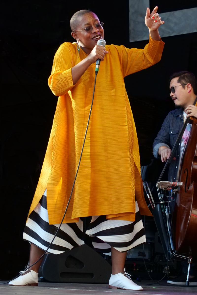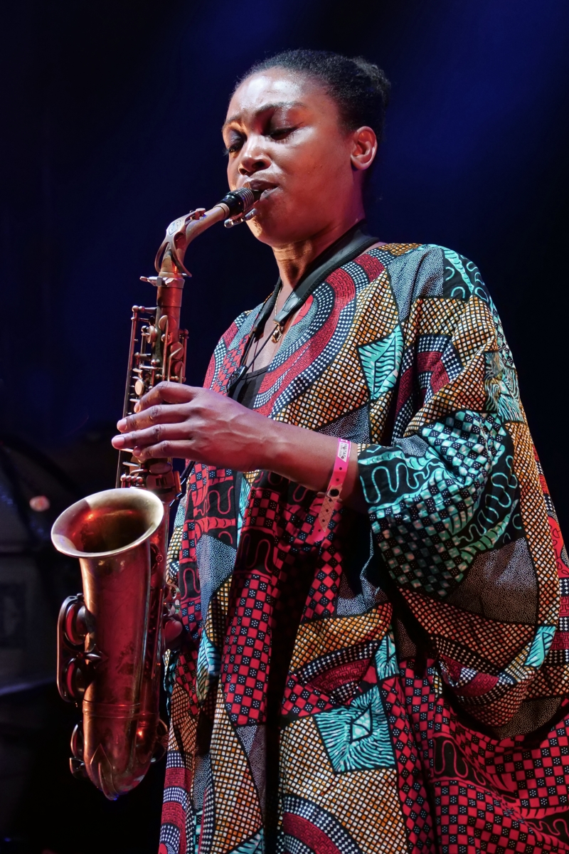 Auf den zweiten Blick gab es viele Überraschungen, die das Jazzherz höher schlagen ließen. So z. B. der grandiose Auftritt von Cécile McLorin Salvant am ersten Tag. Trotz Feierlaune verstummte das Publikum fast, als sie, filigran intonierend, den Standard „Somewhere over the Rainbow“ vortrug – ganz großes Kino und sicherlich auch der Festivalhöhepunkt am Freitag. Die ghanaische Band Sounds of Joy musste leider ohne ihren Frontmann Alogte Oho auskommen, bot nichtsdestotrotz Afro-Funkjazz vom Allerfeinsten. Kurz danach in der Elbphilharmonie das Tomeka Reid Quartett mit Mary Halvorson, die am Abend in der Hauptkirche St. Katharinen noch mit ihrem Mann Tomas Fujiwara im Duo auftrat.
